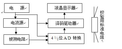 由高精度电流源产生一稳定的直流电流流经被测试品在试品两端产生的直流电压经处理后送至4 1/2 A/D转换器变成相对应数字量,该数字量再经过译码器转变成七段码,驱动液晶显示器显示相应的电阻值。 |