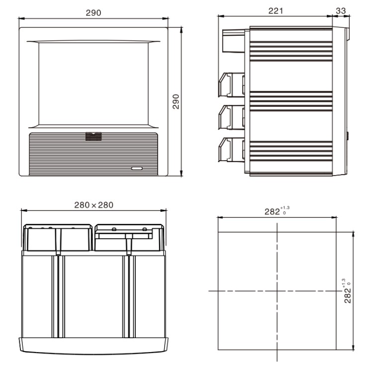 功能特点: 系统 ◆采用大规模集成电路,进口元器件。 ◆高速、高性能32位ARM微处理器,可同时实现48路信号检测、记录、显示和报警。 ◆10.4英寸800x600点阵高亮度图形液晶显示,画面清晰、宽视角。 ◆全隔离信号输入,可输入多种信号,无需跳线,通过软件组态即可。 ◆新型开关电源,85VAC~265VAC范围内正常工作。 ◆集成硬件实时时钟,掉电情况下时钟也能准确运行。 ◆提供变送器24VDC隔离配电。 ◆全铝密封外壳及内部屏蔽板,保证仪表在恶劣环境中正常工作。 ◆大容量FLASH闪存芯片存储历史数据,掉电不丢失数据。 ◆36路继电器报警输出。 信号 ◆可输入各种标准信号:标准电流、标准电压、频率、毫伏、热电偶、热电阻。 ◆信号全量程精度±0.2%。 软件 ◆软件密码锁保证用户组态安全。 ◆中文菜单组态,可自由组态并显示工程位号、工程单位。 ◆工程量显示范围:-9999~30000,还支持真空度运算及科学计数法显示。 ◆多种组态方式,支持上位机修改组态,更可以通过U盘、SD卡导入、导出组态参数。一次组态即可多台仪表使用。 ◆多样化的记录模式,支持间歇式多文件记录,可手动、自动启停,也可由外部信号触发记录。 ◆可以自由设定各通道的上下限报警,记录并显示最近的256条报警信息。 ◆每个通道均支持流量累积功能,提供班报、日报、月报、年报等多种报表形式。 ◆曲线显示模式可选择横向曲线或纵向曲线。 ◆内置GB2312二级汉字字库(6500个汉字)。 ◆功能强大的T6输入法, 操作方便。支持汉字拼音、数字、英文、特殊符号、上下标等字符输入,采用国际标准编码,解决特殊单位及汉字位号的输入问题。 通讯 ◆标准串口通讯接口:RS232C和RS485。 ◆支持标准Modbus-RTU通讯协议,提供多种数据类型,如百分量、工程量、累积量等。除支持本公司的DataManagement数据管理软件外,还支持iFix、组态王、MCGS、力控等通用专业组态软件,无需专用驱动。 ◆U盘、SD卡双卡备份,U盘实现数据转存,SD卡实现海量存储。 ◆支持FAT32文件系统,Windows可自动识别备份数据文件,无需格式转换。 ◆外接微型打印机,可手动打印数据、曲线,定时自动打印实时数据,满足用户现场打印的需求。 尺寸图: