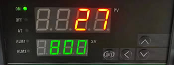 1.2. ON/OFF指示灯:温度控制开/关指示; 3.AT:自整定指示(工程师调试用忽略); 4. ALM1或ALM2模式温度启动指示; 5. SET按键:温度参数设定键 ,按下后,温度设定窗口数码管个位开始闪烁,依次按方向键设定温度,最高可设定温度1600度,再次按SET按键保存即可。<:参数位移健(每按一次数码管位移一位);∧:温度数据增加键; ∨:温度数据减少健。 6.温度达到工作温度设定值后,红灯亮,加热停止,电压表指示为零。此时温度显示还有变动,这是由于温度惯性所致,待几分钟后即可稳定。当温度低于设定值时,绿灯亮,重新加热,电压表指示加热电流。 |
