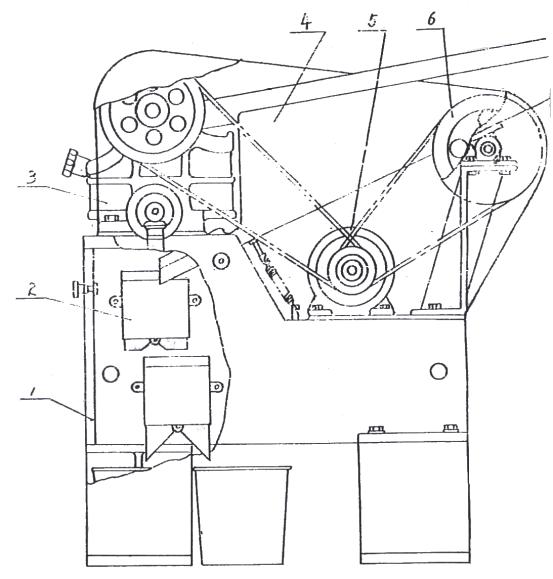 图一 联合制样机结构原理图 1,机体 2,缩分器 3,破碎机器 4,振筛机 5,电机 6,机械传动 电器原理图