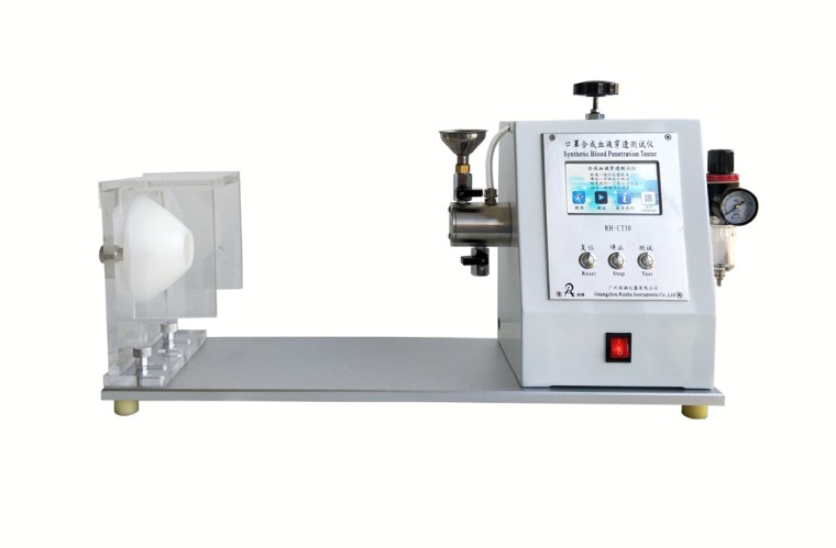 测试方法: GB19083-2010医用防护口罩技术要求 合成血液穿透试验; 将2 mL合成血液以10.7 kPa (80 mmHg)压力喷向口罩,口罩内侧不应出现渗透。 YY 0469-2011 医用外科口罩合成血液穿透试验: 将2 mL合成血液以16.0 kPa (120 mmHg)压力喷向口罩,口罩内侧不应出现渗透。 YY 0469-2011 医用外科口罩合成血液穿透试验: 样品数量:用3个样品进行试验。 样品预处理:将样品在温度(21士5)C ,相对湿度(85士5)%的环境下预处理至少4 h,取出后1 min内进行试验。 测试过程:将样品固定在仪器上的样品夹具上,在距样品中心位置30.5cm处将2 mL表 面张力为(0. 042士0. 002N/m的合成血液以16.0 kPa (120 mmHg)的压力从内径为0.84 mm的针管中沿水平方向喷向被测样品目标区域,取下后10 s内目视检查。 结果处理:检查样品内侧面是否有渗透。如果目视检查可疑,可以用吸水棉拭子或类似物在目标区域内侧进行擦式,然后判断是否有合成血液渗透。结果构应符合标准要求。 执行标准: YY 0469-2011、GB19083-2010、YY/T0691-2008、ISO22609:2004、YY/T0691-2008、EN14683:2019、ASTMF1862-07 技术参数: