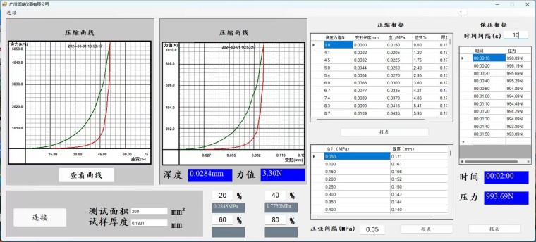 技术参数: 测量范围:(1-3000)N 厚度测量范围:(0-85mm) 可定制 力值分辨力:0.1 N 力值误差:≤0.5%fs 厚度分辨力:0.0001mm 厚度示值误差:±0.01mm 最大测量厚度:100mm 试验速度设定范围:(1~12) mm/min 测量头接触面积:10cm2 直径60mm 温度调节:室温~200℃ 温度误差:±1℃ 外形尺寸:约590×420×800 mm 整机质量:约50kg 人机界面:触摸屏显示 连接电脑:RS232 USB 接口 配电脑软件 PC界面: