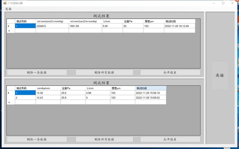 RH-TQ16电脑碳纸透气度测定仪采用新的技术,是专门用于测试燃料电池碳纸透气率。其测试标准符合GB/T20042《质子交换膜燃料电池》第7部分:炭纸特性测试方法。 工作原理: 利用压差法的原理设计,将预先处理好的试样放在上下测量面间,在试样两侧形成一个恒定的压差,气体在压差的作用下,由高压侧透过试样向低压侧流动,根据流过试样的面积、压差和流量,计算出试样的透气度。 测试模式: 仪器提供两种测试模式,分别为定压差测试和定流量测试。 定压差测试:此测试模式为设定一个压差值,测量在此压差值下的空气流速以计算结果。此模式符合国家标准GB/T20042.7-2014 定流量测试:此测试模式为设定一个空气流速值,测量在此流速值下的压差以计算结果。此模式用户可灵活选择以用于科研项目。 测试视频: 执行标准: GB/T20042.7-2014 技术参数: 测量范围:0~50L/min、0-7360ml·mm/(cm²·hr·mmAq) 、约100000 ml•mm/(cm2•h•mmHg) 测试单位:L/min、ml·mm/(cm²·hr·mmAq)、ml•mm/(cm2•h•mmHg)、Pa、mmAq/mm 分辨率:1 ml•mm/(cm2•h•mmHg) 测试面积:16cm2 、 5cm2 (可定制) 流速传感器:进口 空气流速精度:0.5%fs 压差传感器:进口 压差精度:0.2%fs 压差分辨率:0.1Pa 测试压差:5Pa~500Pa(常用5-50Pa) 质量:约30kg 电源:AC220V,50Hz 连接电脑(标配):配备电脑软件,RS232, USB接口 PC界面:
