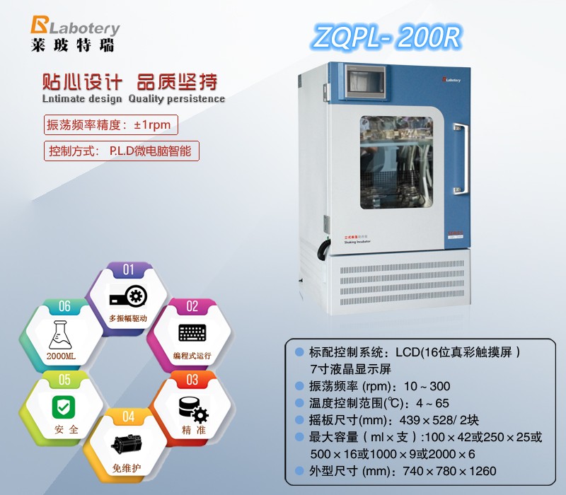 立式二氧化碳振荡培养箱 ZQPL-200R 应用范围: 广泛应用于微生物、病毒、细菌培养、发酵、杂交和生物化学反应及细胞组织等研究。为温度、振荡频率、振幅有不同要求的培养及酶工程等方面的研究提供了有效的帮助,在医学、生物学、分子学、制药、食品、环保等研究应用领域有着广泛而重要的作用。 产品特色: l二氧化碳振荡培养箱,集二氧化碳培养箱与振荡培养箱于一体,立式双层摇板设计,节省占地空间; l优质不锈钢镜面工作室,易清洁,防腐蚀。静电喷塑外壳,经久耐用; l独特的离心风道设计,采用优质贯流宽离心循环风机,强制工作室内的空气流动,温度更加均匀; l门体设计有中空钢化玻璃观察窗,方便观察内部情况。弹压式透气孔设计,满足样品对氧气的需求; l具有门温加热功能,可有效防止门体出现结露现象; l采用全新变频控制技术,配合智能控制系统。控温更精确,更加节能。实现全温度区间运行无结霜、无冰堵; l采用高品质伺服电机控制,转数测定精准,寿命长,免维护; l工作室内设计有自然增湿盒,自然增湿最高可达95%;可满足在高湿环境下进行试验的要求; 操作系统与二氧化碳控制: l采用高精密16位真彩触摸屏电脑控制系统。所有功能显示及设定值在同一界面显示,观察更直观。 l操作系统加密设计,分三级权限(管理员、实验员、操作员)加密操作,充分保证设备运行过程中人为误操作。 l操作系统有定值运行模式和程序运行模式,一机多用。 l操作系统具有历史数据查询与曲线查询功能,历史数据存储可长达5年。曲线查询功能分实时曲线和历史曲线;实时曲线界面可以查看最近的温度、速度、湿度、浓度曲线图;历史曲线界面中,可查看一段时间内的历史数据曲线走势情况,用户还可设定需要查询的时间段. l可用U盘导出备份或打印输出;可选择以数据或曲线方式,实时打印测量数据。 l采用进口红外二氧化碳传感器,反应灵敏、精度高;配置一套进口控制器,电磁阀,用户只需要将二氧化碳气源接人就可直接使用。 l二氧化碳进气口配备高效微生物过滤器,针对直径≥0.3μm的颗粒,过滤高达99.99%,可有效过滤二氧化碳气体中细菌、微尘颗粒及微生物污染源。 l特别配备外置环境温度探头,环境温度在面板上实时显示,便于精确控制箱体内温度。 l具有定时功能,时间设定范围为0~999小时59分钟。 l具有预约开机功能,当实时时间到达预约时间设备开始运行。 安全保障功能: l具有断电记忆功能,避免因断电、死机造成数据丢失。 l控制系统集成照明灯和紫外灭菌功能,便于观察和灭菌。 l具有超温声光报警、自动断电功能 l具有故障自诊断功能 选配功能: l微型打印机:可根据需要定时打印控制数据。 l485 接口远程控制系统:可根据工作需要远程控制和数据分析、导出。 l可升级手机APP客户端远程监控功能。 技术参数: