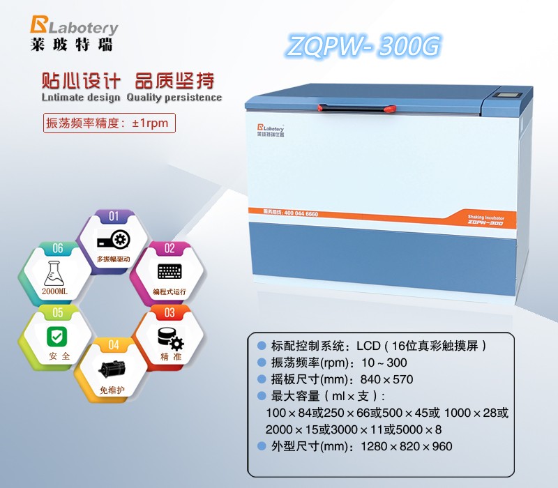 卧式光照振荡培养箱 ZQPW-300G 产品特色: 人性化设计 l集全温振荡培养箱与光照培养箱一体,既可静态培养、也可作动态培养,一机二用。 l光源采用自研发LED组合全光谱灯板,光照强度多档可调,高效节能,效率高,使用寿命超长。 l采用镜面不锈钢一体成形工作室,各边角圆弧过度无死角,防水防止细菌滋生。 l采用宽幅横流风道结构设计,使工作室内温度更加均匀;并且循环风速无级可调,充分满足用户的实验环境需求。 l侧面弹压式透气孔设计,满足样品对氧气的需求。 l采用进口无氟制冷压缩机,制冷工作方式设计新颖。 l采用高品质伺服电机控制,转数测定精确,寿命长,免维护。 l制冷系统设计有防尘过滤网,方便清洁除尘。 操作系统: l采用6位真彩触摸屏电脑控制系统。所有功能显示及设定值在同一界面显示,观察更直观。 l操作界面加密锁定功能,保证操作安全性,定时锁死所有控制功能。 l操作系统有定值运行模式和程序运行模式,一机多用。 l操作系统具有历史数据查询与曲线查询功能,历史数据存储可长达5年。曲线查询功能分实时曲线和历史曲线;实时曲线界面可以查看最近的温度、速度、曲线图;历史曲线界面中,可查看一段时间内的历史数据曲线走势情况,用户还可设定需要查询的时间段。 l可用U盘导出备份或打印输出;可选择以数据或曲线方式,实时打印测量数据。 l特别配备外置环境温度探头,环境温度在面板上实时显示,便于精确控制箱体内温度。 l具有定时功能,时间设定范围为0~999.9分钟(小时)。 l具有预约开机功能。当实时时间到达预约时间,设备开始运行。 安全保障功能 l具有断电记忆功能,避免因断电、死机造成数据丢失。 l控制系统集成照明灯和紫外灭菌功能,便于观察和灭菌。 l具有超温声光报警、自动断电功能。具有故障自诊断功能。 l摇板具有门控功能,开门自动停止转动。 选配功能: l微型打印机:可根据需要定时打印控制数据。 l485 接口远程控制系统:可根据工作需要远程控制和数据分析、导出。 l可升级手机APP客户端远程监控功能。 技术参数: