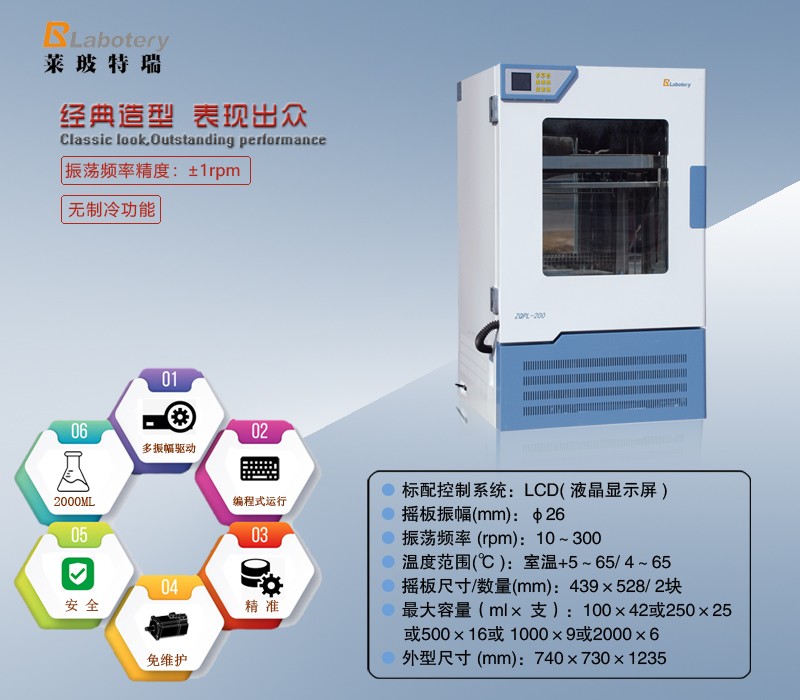 立式振荡培养箱 ZHPL/ZQPL-200 应用范围: 广泛应用于微生物、病毒、细菌培养、发酵、杂交和生物化学反应及细胞组织等研究。为温度、振荡频率、振幅有不同要求的培养及酶工程等方面的研究提供了有效的帮助,在医学、生物学、分子学、制药、食品、环保等研究应用领域有着广泛而重要的作用。 产品特色: 人性化设计 l双层摇板设计,配备调节支撑脚,同时配备万象滚轮。 l工作室采用优质不锈钢镜面板加工,便于清洁。 l中空钢化玻璃门,方便观察内部情况;侧面配¢30mm测试孔,方便测试及满足样品对氧气的需求。 l采用宽幅横流风道结构设计,使工作室内温度更加均匀;并且循环风速无级可调,充分满足用户的实验环境需求。 l采用宽幅横流风道结构设计,使工作室内温度更加均匀;并且循环风速无级可调,充分满足用户的实验环境需求。 l采用高品质伺服电机控制,转数测定精确,寿命长,免维护,可进行正反转工作设定。 l制冷系统设计有防尘过滤网,方便清洁除尘。 l具有门控功能,开门自动停止转动。 l三维一体的偏心三轮驱动,转速测定精确,寿命长、免维护。 lLCD大屏幕液晶屏显示和真彩触摸屏程序控温两种控制系统形式可选,充分满足您的需求。 l独有的转速控制可编程试运行,可进行正转、反转、静止交替程序运行,各段运行时间可自由设定转换。 l独有的电机过流保护功能,使运行更安全,可大大提高点击和控制系统的使用寿命。 l具有定时功能,时间设定范围为0~9999(小时)。 安全保障功能 l具有断电记忆功能,避免因断电、死机造成数据丢失。 l控制系统集成照明灯和紫外灭菌功能,便于观察和灭菌。 l具有超温声光报警、自动断电功能。具有故障自诊断功能。 l具有故障自诊断功能。 选配功能: l微型打印机:可根据需要定时打印控制数据。 l485 接口远程控制系统:可根据工作需要远程控制和数据分析、导出。 l可升级手机APP客户端远程监控功能。 技术参数: