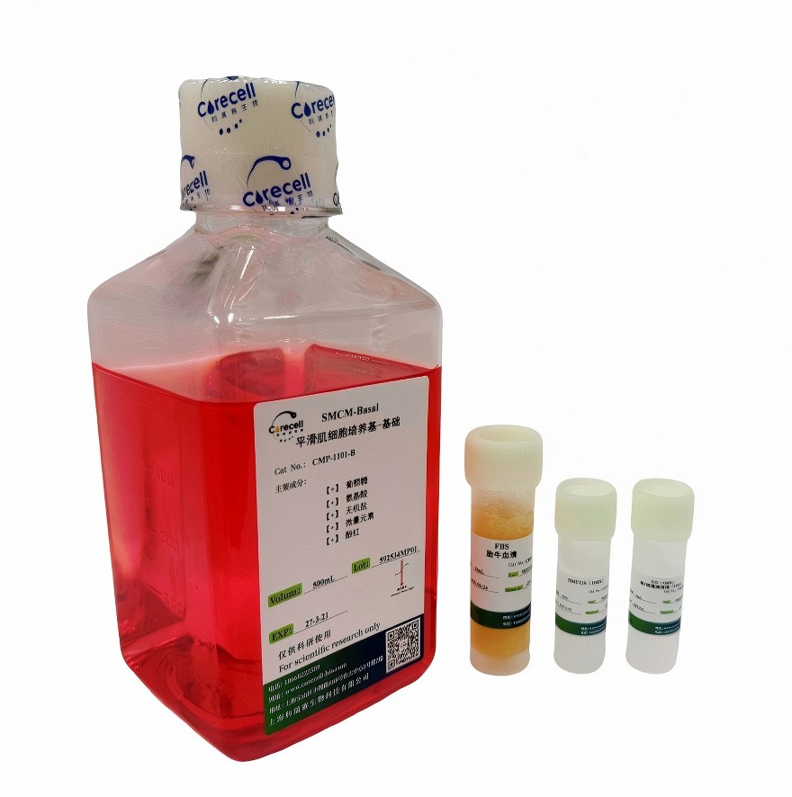 产品名称:平滑肌细胞培养基 英文名称:Smooth Muscle Cell Medium (SMCM) 货号:CMP-1101 产品简介: 本产品为正常原代及永生化平滑肌细胞体外培养量身定制,是适配其生长需求的**培养基。配方中科学添加必需氨基酸、非必需氨基酸、维生素、有机与无机化合物、激素、生长因子及微量矿物质,同时搭配2%低浓度胎牛血清,既能满足细胞生长核心营养需求,又能减少血清成分对细胞培养的干扰。 该培养基采用重碳酸盐缓冲体系,在含5%CO₂的细胞培养箱中平衡后,pH值可稳定维持在7.4,为平滑肌细胞营造稳定、适宜的体外生长微环境,可选择性促进其体外增殖与生长。 本产品适用范围广泛,可用于分离和培养各类人源及部分哺乳动物的正常原代或永生化平滑肌细胞,包括但不限于人主动脉平滑肌细胞(HASMC)、人支气管血管平滑肌细胞(HBVSMC)、HPASMC、HUASMC等。 产品组成: