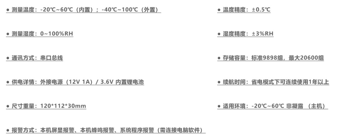 此款温湿度记录仪是泽大仪器的经典款产品,能够测量和记录环境温湿度数据。可内置或连接外部传感器,支持多种扩展配置,可根据客户需求进行选择搭配。具有大容量的记录功能,可以设置记录间隔和测量更新时间,以适应不同的应用场景。主要用于监测记录食品、医药品、化学用品等产品在存储过程中的温湿度数据。帮助用户实时监测和记录环境温湿度数据,从而确保产品的存储条件符合要求,保证产品的质量和安全。 产品参数: