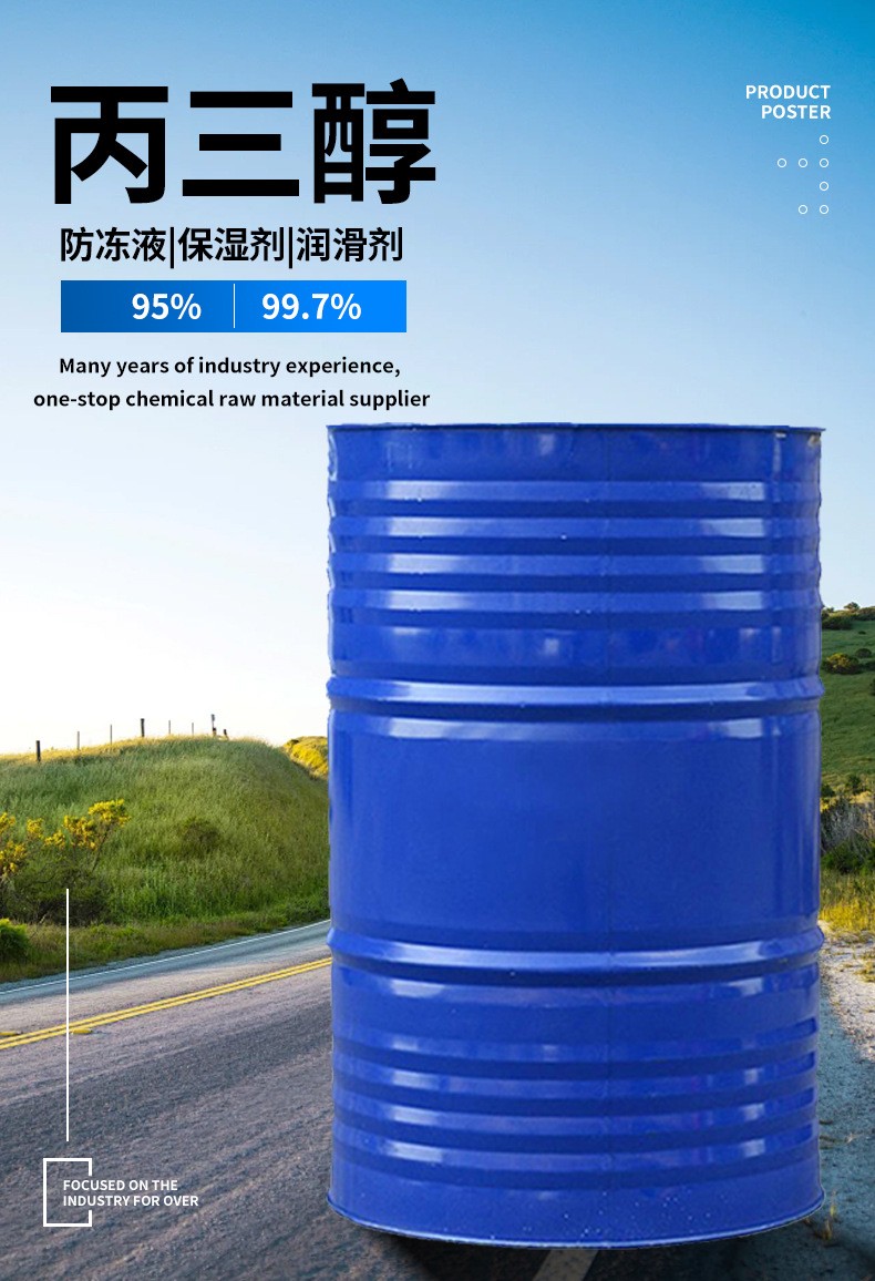 甘油又名丙三醇。无色、透明、无臭、黏稠液体,味甜,具有吸湿性。用作基本有机化工原料,广泛用于纺织、印染、造纸、印刷、洗涤剂、日化、制酒、食品、卷烟、玻璃纸、搪瓷、石油、电子、橡胶、塑料、制革、化学、化纤等行业。用作保湿剂、保润剂、吸湿剂、润滑剂、柔软剂、软化剂、增稠剂、增塑剂、稀释剂、防冻剂等。