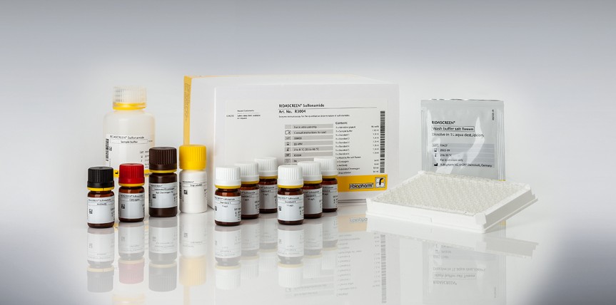 产品介绍 磺胺是一种竞争性酶免疫测定法,用于定量分析鸡蛋、肉类(鸡肉和猪肉)、鱼、虾、蜂蜜和牛奶中的磺胺类药物。 磺胺类药物广泛用作饲料添加剂,主要用于犊牛和猪的育肥。与甲氧苄啶、四曲索苄啶或乙胺嘧啶磺胺等二氢叶酸还原酶抑制剂联合使用,也用于兽医治疗肠道感染、乳腺炎、肺炎和其他(全身性)疾病。因此,磺胺残留可能存在于动物源性食品(如肉类和奶类)中,在国外经常发现。根据欧盟法律,磺胺类所有物质在肌肉、脂肪、肝脏和肾脏中的最大残留限量为100微克/千克(ppb),牛奶中的最大残留限量为100微克/升。 可靠:ss筛选测试。 灵敏:肉(鸡)和蛋的检出限为1.5μg/kg(ppb)/肉(猪肉)、鱼虾和蜂蜜为2μg/kg/牛奶为3.5μg/kg。 快速:1小时和15分钟内的检测结果。