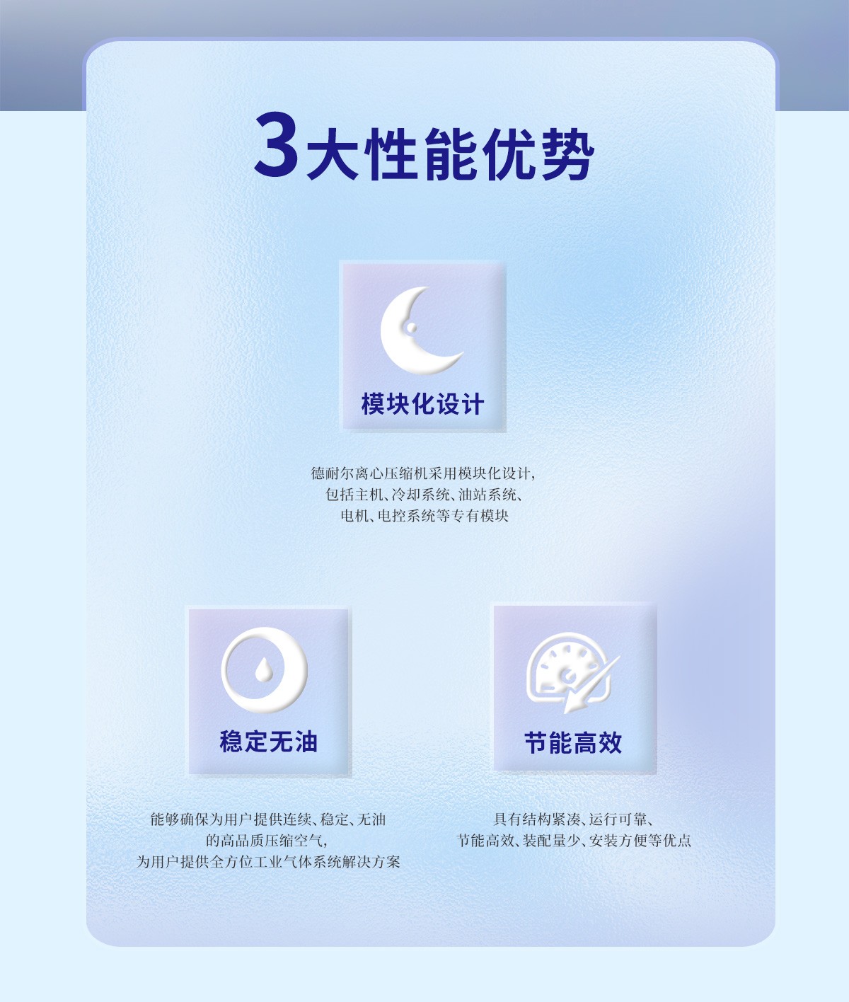 德耐尔DAC350是一款面向大流量、高负荷场景的高效节能离心式压缩机,主打超一级能效、无油洁净输出与智能稳定运行。 核心设计与优势 1. 高效气动设计 三元流叶轮:采用半开式后弯设计,材质为航天级钛合金 / 不锈钢,整体铣制。 强度测试:每只叶轮均经115% 超速试验,动平衡精度<0.5mg,稳定性极强。 节能效果:优化气动效率,比传统机型节电约 20% 2.智能控制系统 三种运行模式:全恒压、自动双重、自平衡,IGV(进口导叶)智能调节,气量按需供应。 防喘振保护:内置防喘振与预测算法,确保运行点远离危险区,安全稳定。 PLC + 触摸屏:采用西门子 PLC,全参数监控、曲线记录、多级报警与联锁保护。