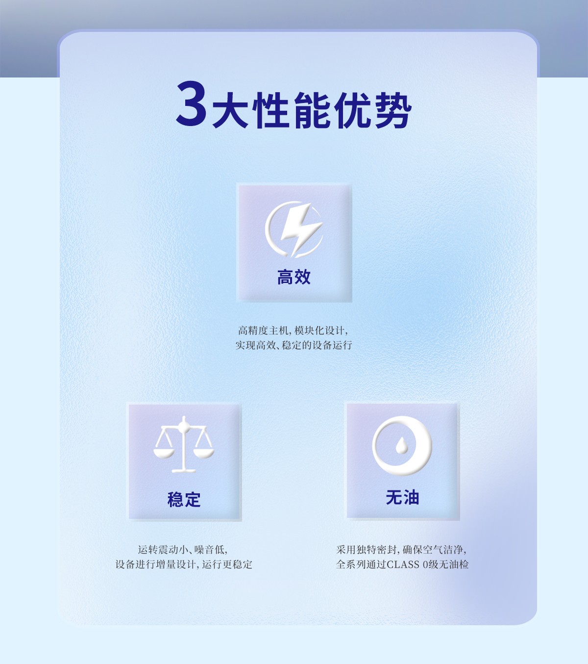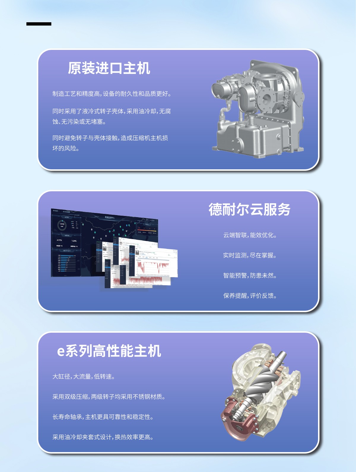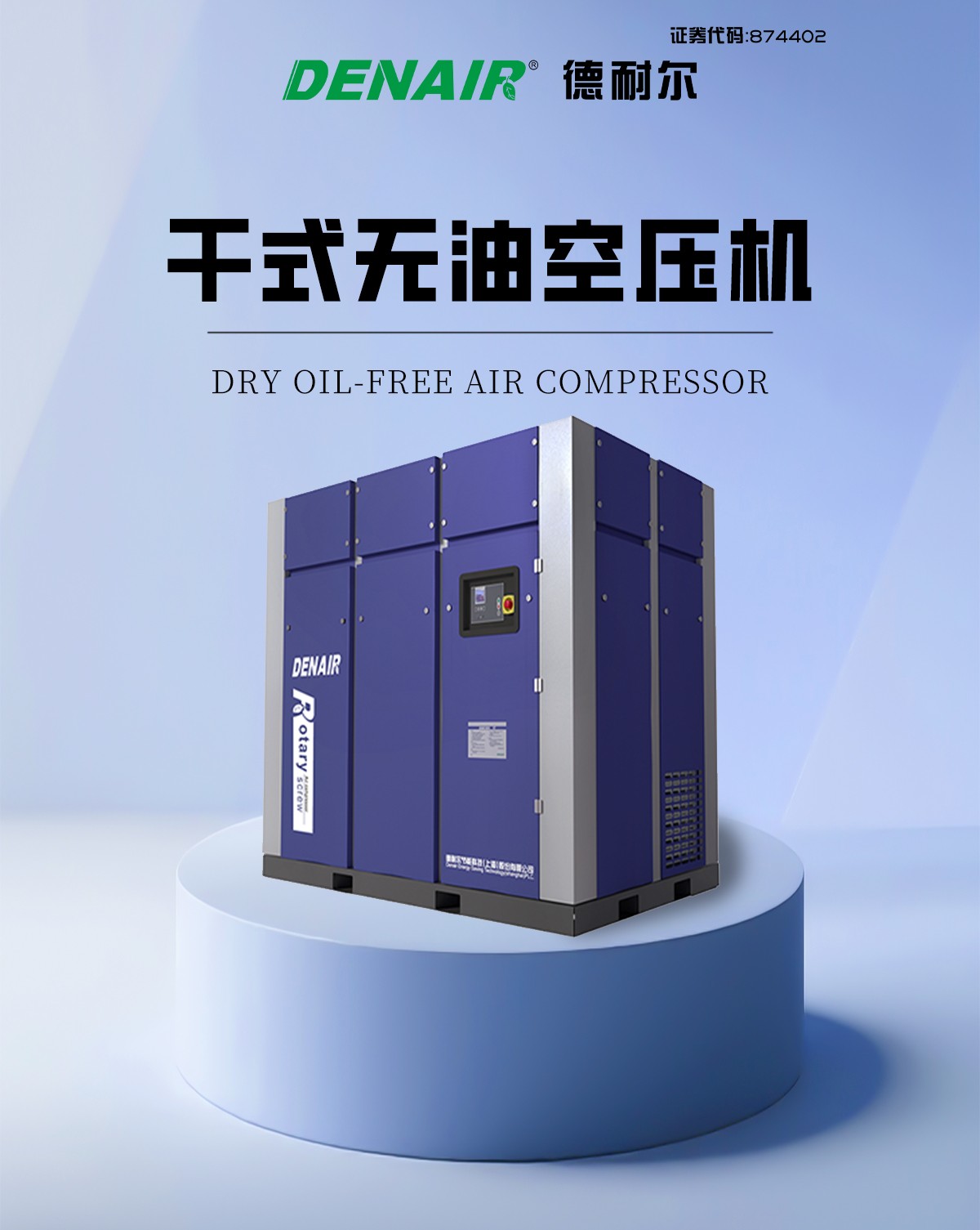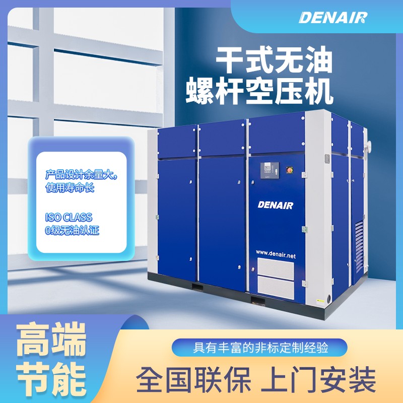德耐尔干式无油空压机是一款主打纯净无油、高效节能、稳定可靠的工业级螺杆压缩机,专为对压缩空气质量有严苛要求的高端制造业设计。 核心技术与优势 1. 纯净无油压缩(核心卖点) 干式无油主机:压缩腔内完全无润滑油,从根源杜绝油气污染。 UltraCoat® 超级涂层:转子与腔体喷涂专用耐腐蚀、耐高温(300℃)涂层,防锈且容积效率高。 三道迷宫式密封:非接触式气封 + 油封设计,零磨损,**保证输出空气 100% 无油。 2. 高效节能设计 双级压缩 + 大转子低转速:比单级更节能,配合永磁同步变频电机,较定频机型节能30% 以上。 精准变频控制:实时监测用气需求,自动调节转速,彻底消除 “空载能耗”。 高效冷却系统: 风冷:航空级铝合金换热器,散热高效。 水冷:冷却效率更高,可回收余热(用于供暖 / 热水),综合节能率再提升15%。