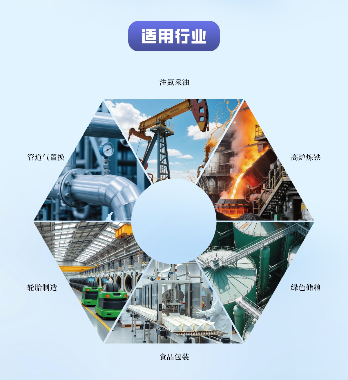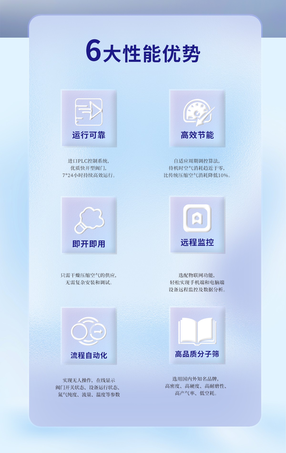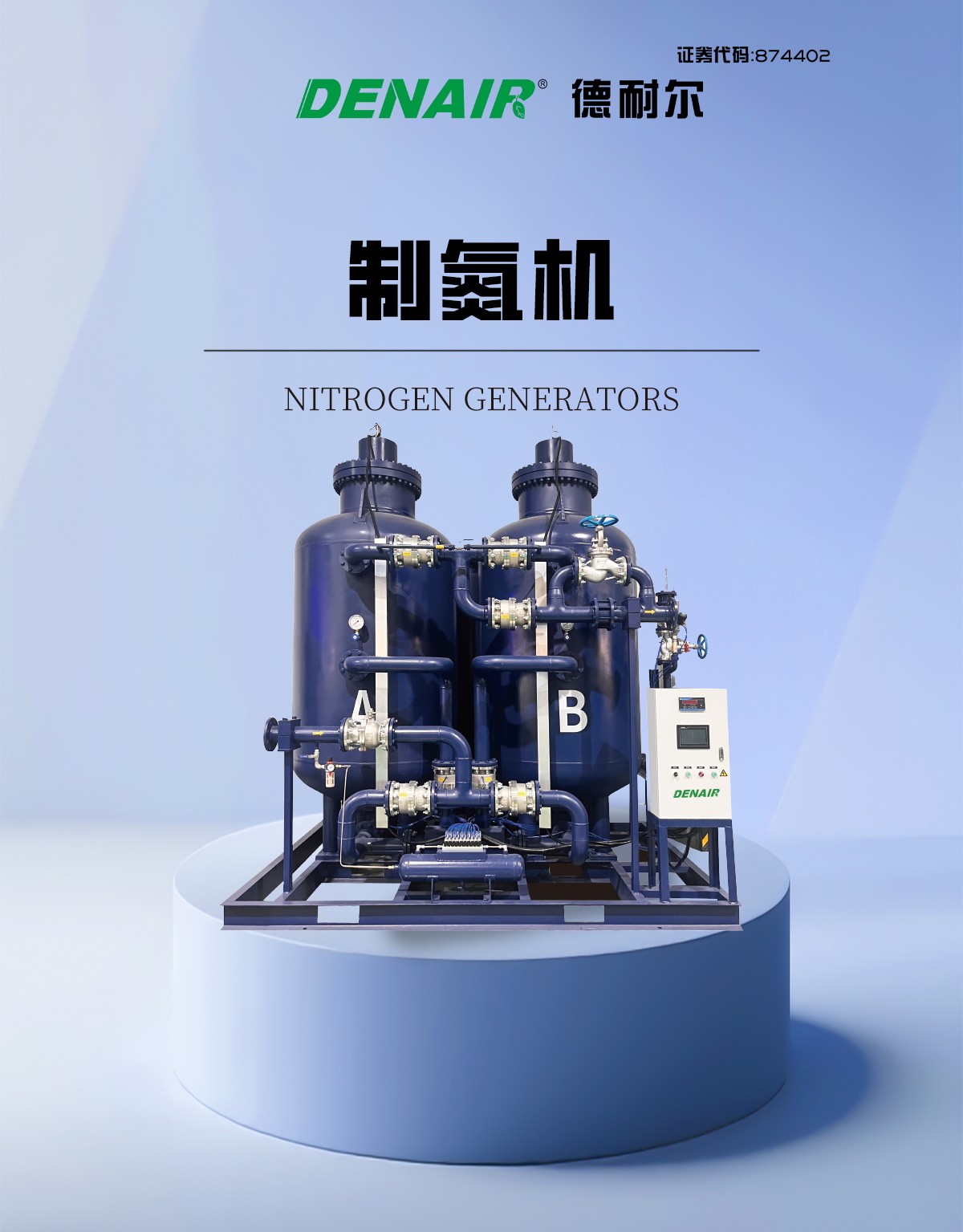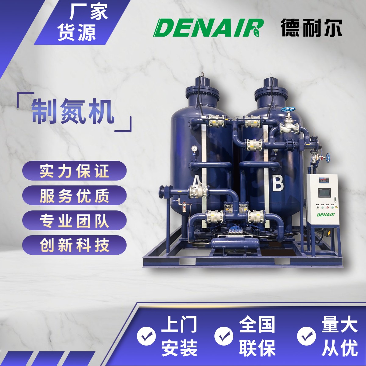 德耐尔制氮机为现场一体式 PSA 变压吸附制氮设备,以洁净压缩空气为原料,双塔碳分子筛分离氧氮,纯度全覆盖 95%~99.999%,撬装一体化、全自动无人值守、低空氮比高节能。 1. 长寿命高效碳分子筛 优选进口高端分子筛,使用寿命 8~10 年,吸附容量大、氧氮分离效率高、抗粉化;适配宽工况,不易受潮失效,长期纯度不衰减。 2. ** 9 阀不等式均压节能系统(核心节能亮点) 对比传统 8 阀老式制氮机: 空氮比更低、氮气回收率大幅提升 压缩空气消耗降低 10%+,综合运行节能 15% 自适应周期算法,随后端用气波动自动调节产气,待机耗气趋近于零,大幅节省空压机电费