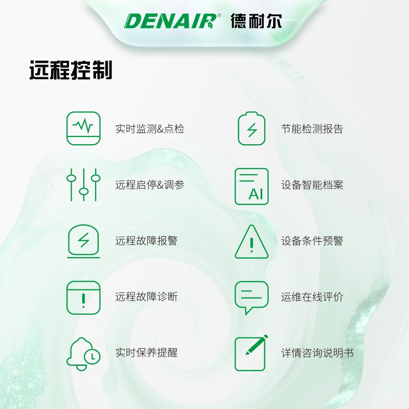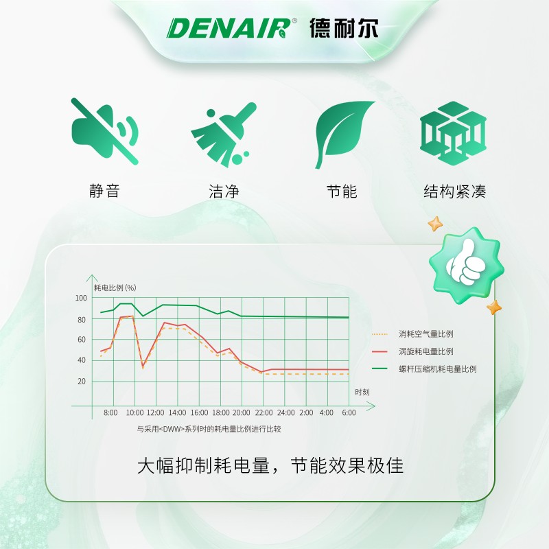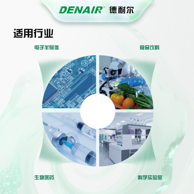 德耐尔无油涡旋空压机是小流量、静音、零油洁净、免维护的微型精密无油机型,主打小气量洁净气源,泵腔全程无油、无水、无润滑,通过ISO 8573-1 Class 0 零级无油认证,是医疗实验室、小型精密电子、食品小包线、仪器仪表的**洁净空压机。 1. 原生全无油,洁净度拉满(核心) 压缩腔内完全无润滑油、无密封油、无油气反流,从源头杜绝油污污染;搭配整机前置多级精密过滤,输出空气无水、无尘、无油,完全满足医疗 GMP、实验室、精密仪器、食品小包无菌用气要求。 2. **静音微振,室内就近安装 涡旋连续平稳压缩,无进气排气阀冲击、无转子敲击、低振动;整机内置隔音箱,噪音低至58dB(A),远低于螺杆空压机,可直接放在车间、实验室、无菌房内,无需单独机房,夜间运行无干扰。 3. 结构极简、几乎免维护,运维成本极低 零部件极少、无易损件,没有活塞环、轴承磨损、油封老化问题; 终身不用换油、无油滤 / 油分保养、无油泥清理; 日常仅需定期更换进气空气滤芯,保养周期长、停机时间极少。