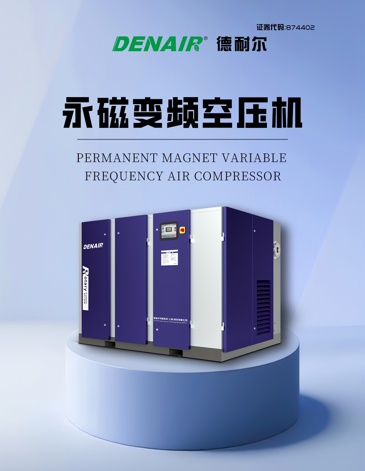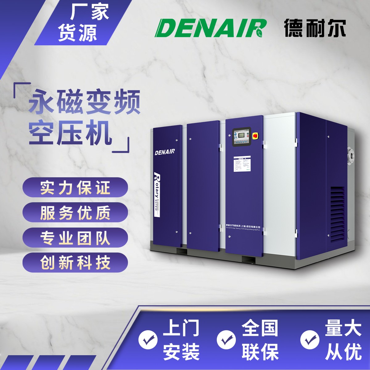 德耐尔永磁变频空压机(DAV 系列) 是德耐尔推出的主打高效、节能、智能的螺杆式空压机产品,广泛应用于制造业、电子、化工、食品、医药等行业。 1. 高效节能(核心卖点) IE5 超高效永磁电机:采用第三代永磁动力模组,电能 - 动能转化效率高达96%,远超国标 IE4 等级。相比普通异步电机,节能 18%-30%。 专利螺杆主机:搭载第六代 α 型非对称转子(专利号 ZL201720301123.8),阴阳转子间隙≤0.01mm,内泄漏极低,压缩效率提升≥15%。 无级变频调节:专用变频器实时监测管网压力,电机转速在 40%-100% 范围精准调速(±2rpm),按需供气,彻底杜绝空载浪费。 2. 精准稳压,品质保障 压力波动极小:采用气压补偿与 PID 闭环控制,压力误差控制在 ±0.01~±0.02MPa (常规机型 ±0.08MPa)。 供气平稳:配备脉动抑制装置,压力波动仅为行业均值的 1/3,有效提升精密加工、喷涂等工艺的产品良品率