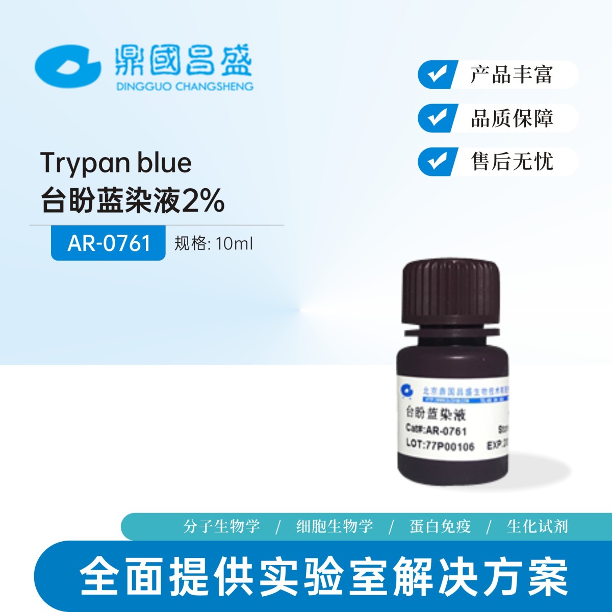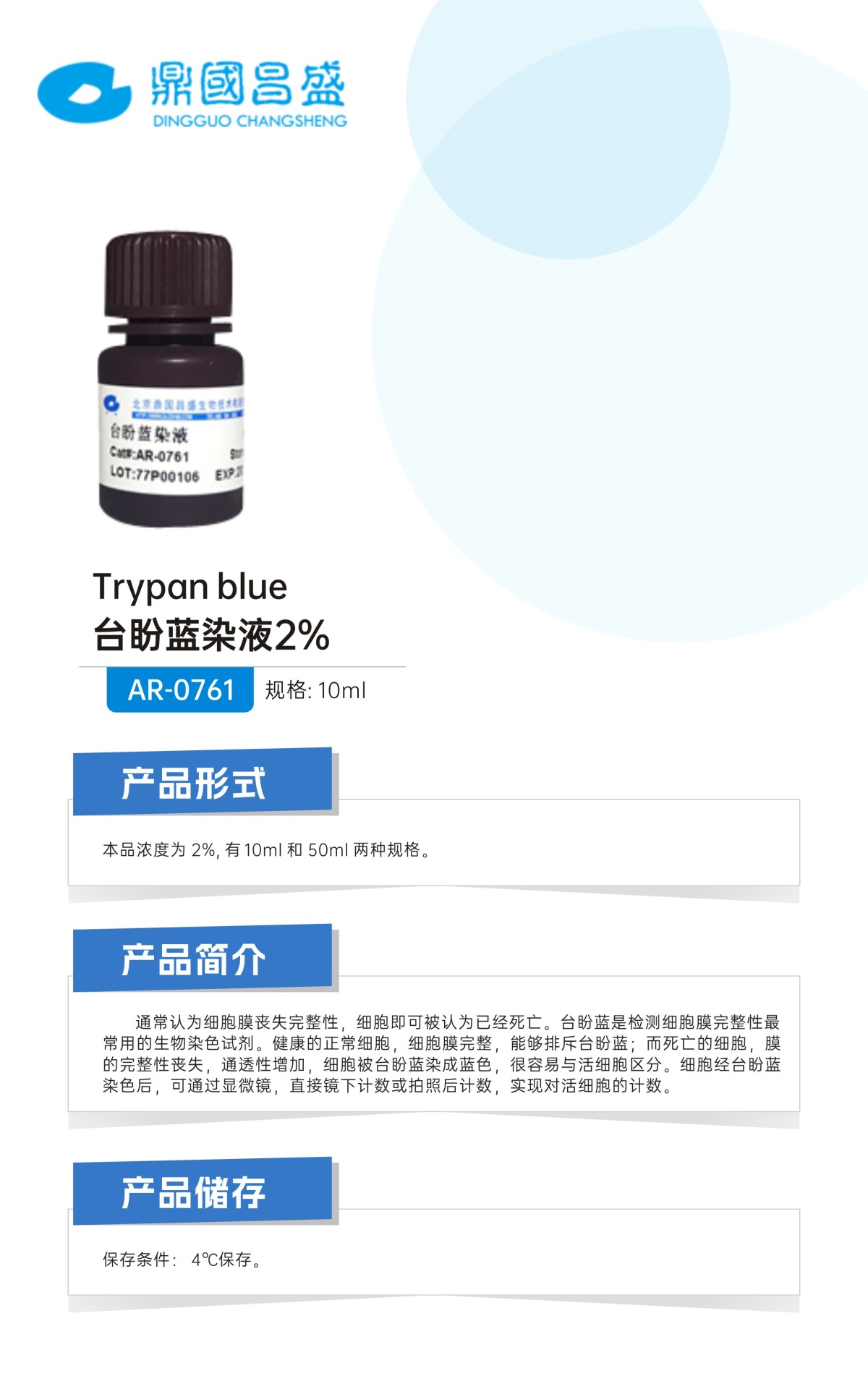 产品包装: 本品浓度为 2%,有 10ml 和 50ml 两种规格。产品简介: 通常认为细胞膜丧失完整性,细胞即可被认为已经死亡。台盼蓝是检测细胞膜完整性最常用的生物染色试剂。健康的正常细胞,细胞膜完整,能够排斥台盼蓝;而死亡的细胞,膜的完整性丧失,通透性增加,细胞被台盼蓝染成蓝色,很容易与活细胞区分。细胞经台盼蓝染色后,可通过显微镜,直接镜下计数或拍照后计数,实现对活细胞的计数。保存条件: 4℃保存。