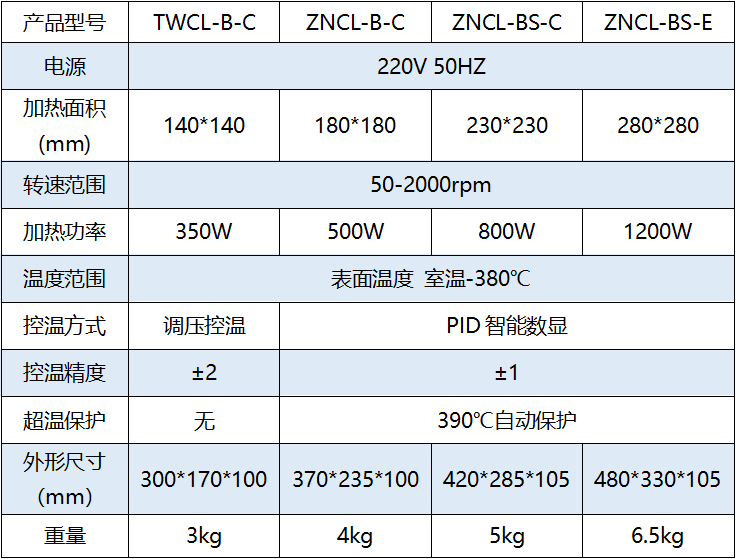 详情介绍 简介 磁力搅拌器是用于液体混合的实验室仪器,主要用于搅拌或同时加热搅拌低粘稠度的液体或固液混合物。其基本原理是利用磁场的同性相斥、异性相吸的原理,使用磁场推动放置在容器中带磁性的搅拌子进行圆周运转,从而达到搅拌液体的目的。配合加热温度控制系统,可以根据具体的实验要求加热并控制样本温度,维持实验条件所需的温度条件,保证液体混合达到实验需求。 功能及特点 • 采用方形陶瓷、金属面,防腐蚀,光滑易清洗 • **采用长寿命专利合成晶体加热涂层,加热寿命是电炉丝的十倍,且加热温度稳定,高达300℃ • 采用德国PAPST系列直流无刷电机,性能稳定、噪音小、寿命长、无火花产生 • 外壳采用一次性成型ABS注塑外壳,耐老化、防腐蚀,且绝缘性能良好 • 30°斜面操控面板适合坐位和站位视角 • 无极调速+数显转速控制线路使转速平稳,扭矩大 • 内置恒温一体控温线路或智能PID控制线路使温度控制更加准确,操控更加方便 • 内外感温探头可测加热板温度也可转换测量溶液温度,内置过热、超温、超限等多重自动保护 技术参数 ![]() |