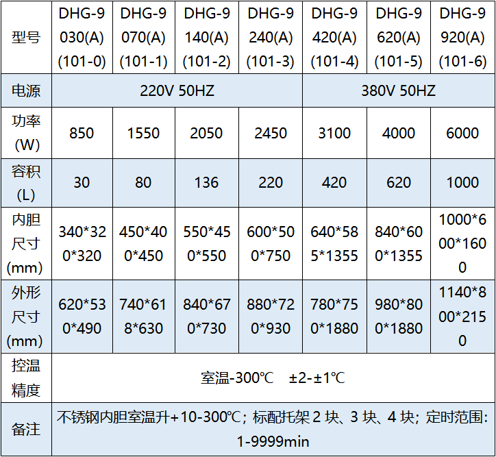 详情介绍 简介 鼓风干燥箱箱内加热恒温系统由风机、电加热器、设计*的风道结构和控温部分组成。当接通电源时,风机运转,将置于箱体后部的电加热器的热量通过风道排进,经过工作室内被干燥物品后经由通风管排出,如此不断循环以保障温度均衡。控温仪为微电脑控制、可控硅触发,控温精度高,控制系统同时兼具时间及温度预设功能,控制器除有保护装置外还有设定温度上下限跟踪报警功能。 使用方法 1.将被干燥的物品放入干燥箱内,确认电源开关处于关闭状态然后关好箱门再接通电源启动开关和风机开关,以免电流过大对仪器构成损害; 2.调节控温仪,设定所需温度参数,此时加热指示灯亮,加热器工作,控温表上方则显示箱内温度。一般情况下,加热30min后温度控制进入恒温状态。(注意:如需调整智能型控温仪请参阅“智能型控温仪说明书” ) 3.当所需工作温度较低时,可采用二次设定方法,如需工作温度80℃,*次可设定70℃,等温度设定过冲开始回荡后,再**次设定80℃,这样可降低甚至杜绝温度过冲现象,使箱内尽快进入恒温状态。 4. 如需高温度向低温度设定时,需要打开箱门散热,等箱内温度低于设定温度时,方可开始加热。 技术参数