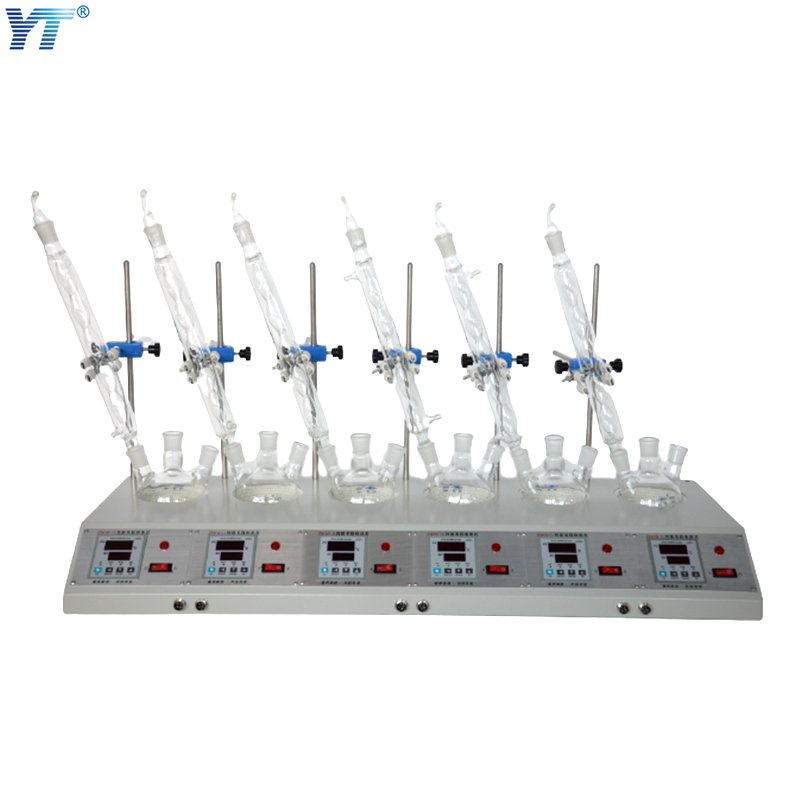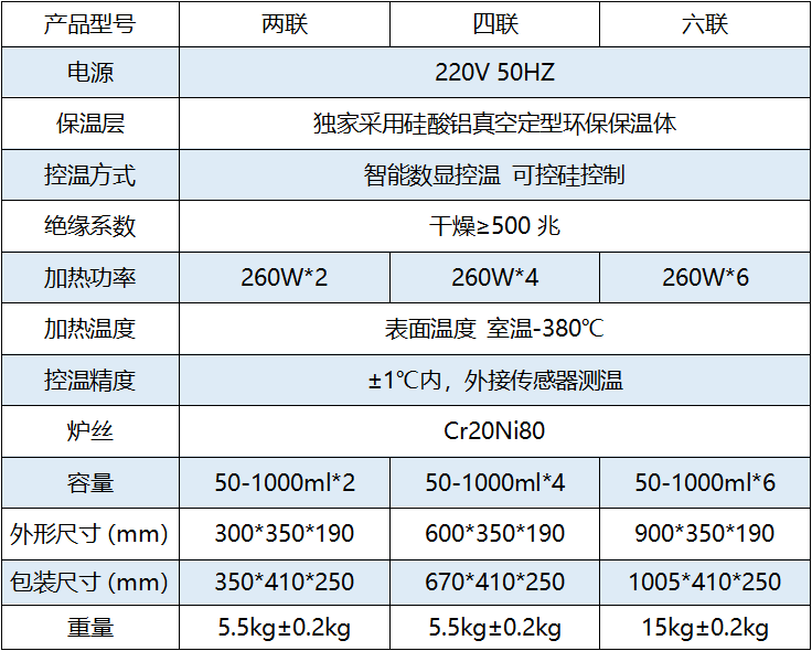 简介 ZNHW型电热套控温采用计算机芯片做主控单元,采用多重数字滤波电路,模糊PID控制算法,具有测量精度高,冲温小,单键轻触操作,双屏显示,内、外热电偶测温,可控硅控制输出,160~240V宽电压电源,并有断偶保护功能,具有升温快、温度高、操作简便、经久耐用的特点。 首先采用特殊模具将硅酸铝棉经真空抽滤定型、加胶烘干做成半球形环保保温体。 外壳铁皮静电喷塑,既美观又防腐蚀。由于采用球形加热,可使容器受热面积达到百分之六十五以上,具有升温快,温度高、操作简便、经久耐用的特点。多联同时加热,也可单独操作,自带烧瓶夹固定架。 使用方法 • 将容器放入电热套内并固定,插入~220V电源,打开电源开关,PV显示窗显示"K",SV设定窗显示"400"字样,为本电器配用K型热电偶,高温可控制到399℃,3秒后,显示窗显示室温,设定窗显示上次设定温度值 • 单键操作,按设定加"▲"或设定减"▼"键不放3秒,将快速设定出所需的加热温度如:100℃,绿灯亮表示加温,绿灯灭表示停止; • 电热套下方有几个橡胶塞子,用来保护外用热电偶插座不腐蚀生锈和导通内线用,拔掉则内探头断开,机器停止工作 • 该电器设有断偶保护功能,当热电偶连接不良或断开时,显示窗显示"hhhh",绿灯灭,电器即停止加温,需检查好后再用 • 以此方法依次操控每一个孔进行加热 注意事项 • 仪器应有良好的接地 • **次使用时,套内有白烟和异味冒出,颜色由白色变为褐色再变成白色属于正常现象; • 电热套使用时有吱-吱响声是炉丝结构不同及与可控硅调压脉冲信号有关,可放心使用 • 如发现不通电时,请首先检查右后方保险是否需要更换 • 请不要空套取暖或干烧 • 有湿手液体溢出或长期置于湿度过大时,可能会有感应电透过保温层传至外壳,请务接地线,并注意通风 • 长期不用时,请保持仪器清洁,并放在干燥无腐蚀气体处保存。 技术参数 ![]() |