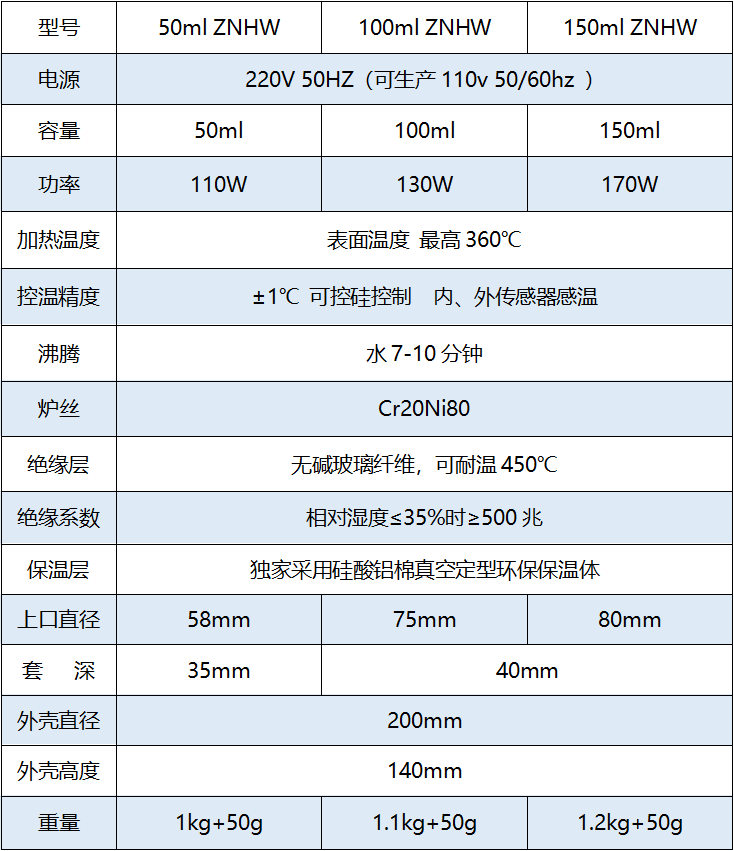 简介 ZNHW型电热套是用无碱玻璃纤维作绝缘材料,将Cr20Ni80合金丝簧装置于其中,用硅酸铝棉经真空定型的半球形保温体保温,外壳一次性注塑成型,上盖采用静电喷塑工艺,由于采用球形加热,可使容器受热面积达到60%以上。控温采用计算机芯片做主控单元,采用多重数字滤波电路,模糊PID控制算法,具有测量精度高,冲温小,单键轻触操作,双屏显示,内、外热电偶测温,可控硅控制输出,160-240V宽电压电源,并有断偶保护功能,具有升温快、温度高、操作简便、经久耐用的特点,是做精确控温加热试验的最理想仪器。 使用方法 1.插入~220V电源,打开电源开关,显示窗显示“K”,设定窗显示“400”字样,为本电器配用K型热电偶,最高控制温度400℃,3秒后,显示窗显示室温,设定窗显示上次设定温度值。 2.单键操作,按设定加“▲”或设定减“▼”键不放,将快速设定出所需的加热温度如:100℃,绿灯亮表示加温,绿灯灭表示停止,微电脑将根据所设定温度与现时温度的温差大小确定加热量,确保无温冲一次升温到位,并保持设定值与显示值±1℃温差下的供散热平衡,使加热过程轻松完成。 3.电热套左下方有一橡胶塞子,用来保护外用热电偶插座不腐蚀生锈和导通内线用,拔掉则内探头断开,机器停止工作。如用外用热电偶时应将此塞子拔掉保存,将外用热电偶插头插入插座并锁紧螺母,然后将不锈钢探棒放入溶液中进行控温加热。 4.该电器设有断偶保护功能,当热电偶连接不良时,显示窗百位上显示“1”或“hhhh”,绿灯灭,电器即停止加温,需检查后再用。 注意事项 1.仪器应有良好的接地。 2.**次使用时,套内有白烟和异味冒出,颜色由白色变为褐色再变成白色属于正常现象,因玻璃纤维在生产过程中含有油质及其他化合物,应放在通风处,数分钟消失后即可正常使用。 3.3000ml以上电热套使用时有吱-吱响声是炉丝结构不同及与可控硅调压脉冲信号有关,可放心使用。 4.液体溢入套内时,请迅速关闭电源,将电热套放在通风处,待干燥后方可使用,以免漏电或电器短路发生危险。 5.长期不用时,请将电热套放在干燥无腐蚀气体处保存。 6.请不要空套取暖或干烧。 7.环境湿度相对过大时,可能会有感应电透过保温层传至外壳,请务接地线,并注意通风。 技术参数 ![]() |
