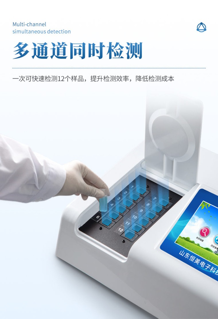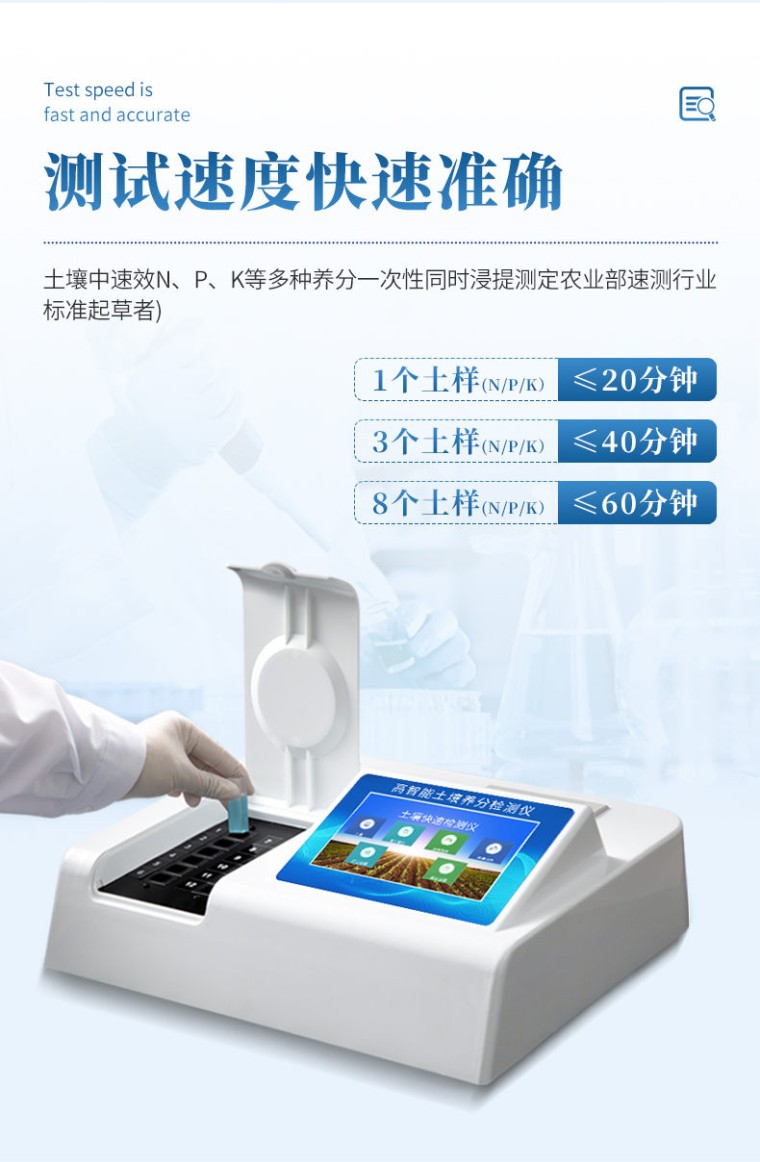 一、产品简介: 配套齐全:该仪器相当于一个小型实验室,无需用户自配附件。适于农业服务部门或农资贩卖商、高教院校、科研院所、合作社、肥料厂商、大种植户测土施肥和鉴别肥料真假及环保检测应用。 检测功能全:测试项目国内外全面,除标配试剂外,其他各类药剂均可加配选购。 操作简便、速度快捷,配套整套附件及成品药剂开瓶即用,无须配置。 性能可靠:工作稳定性优于国家标准JJG179-90指标的6倍,重复性达到光栅型分光光度计指标水平。 二、功能多、测试项目齐全: 1、土壤养分:●土壤铵态氮、土壤有效磷、土壤速效钾、土壤硝态氮、土壤水解氮、土壤全氮、土壤全磷、土壤全钾、土壤有机质(丘林法)、土壤有机质(浸提法)、PH值、含盐量、水分。●土壤中微量元素:土壤钙、土壤镁、土壤硫、土壤硅、土壤硼、土壤铁、土壤铜、土壤锰、土壤锌、土壤氯;●土壤重金属:土壤铅、土壤砷、土壤镉、土壤铬、土壤汞。 2、肥料养分:●单质肥:氮肥中铵态氮、肥料硝态氮、尿素氮、缩二脲、磷肥中磷、磷肥中水溶性磷、钾肥中钾;●复合肥全氮、复合肥全磷、复合肥全钾;●有机肥全氮、有机肥全磷、有机肥全钾、有机肥硝态氮、有机肥速效磷、有机肥速效钾、有机肥酸解氮、有机质;●水溶性腐植酸(风化煤)、水溶性腐植酸(褐煤)、水溶性腐植酸(泥炭)、游离态腐植酸(风化煤)、游离态腐植酸(褐煤)、游离态腐植酸(泥炭);●水溶肥全氮、水溶肥全磷、水溶肥全钾;●叶面肥全氮、叶面肥全磷、叶面肥全钾;●各种肥料微量元素:肥料钙、肥料镁、肥料硫、肥料硅、肥料硼、肥料铁、肥料铜、肥料锰、肥料锌、肥料氯;●肥料重金属:肥料铅、肥料砷、肥料镉、肥料铬、肥料汞。 3、鲜作物营养:●作物硝态氮、作物铵态氮、作物磷、作物钾;●作物中微量元素:作物钙、作物镁、作物硫、作物硅、作物硼、作物铁、作物铜、作物锰、作物锌、作物氯;●作物中硝酸盐、亚硝酸盐。 4、干植株营养:●植株全氮、植株全磷、植株全钾 5、烟叶营养:●全氮、全磷、全钾、还原糖、水溶性总糖、硼、锰、铁、铜、钙、镁等20项。 6、食品(水果、蔬菜等):●硝酸盐、亚硝酸盐、重金属(铅、铬、镉、砷、汞)等项。 7、水质中:●铵态氮、水中磷、水中钾、硝酸盐、亚硝酸盐、硬度、PH、铁、铜、锰、锌、硼、氯、硫、硅、钼等 三、测试效率: 土壤中速效N、P、K等多种养分一次性同时浸提测定(农业部速测行业标准起草者)。 肥料中氮(N)、磷(P)、钾(K)等养分同时、快速、准确检测。 测试速度:正常熟练程度下: 测一个土壤样品(N、P、K)三项需要20分钟(含药剂准备及土样前处理时间),同时检测三个土壤样品(N、P、K)≤40分钟,同时测8个土样≤1小时。 测试一个肥料样(N、P、K)≤50分钟,同时检测三个肥料样品(N、P、K)≤1.5小时。 四、测试误差: 土壤氮磷钾误差≤1%,有机质误差≤2%,微量元素相对误差≤5%;肥料单项误差≤0.5%,氮磷钾三项误差≤1%; 重金属相对误差小于等于5%。 五、功能特点: ★1、Android安卓智能操作系统,主控芯片采用ARM Cortex-A7,RK3288/4核处理器,主频1.88Ghz,运转速度更快速,稳定性更强。 ★2、12个检测通道,一次性可快速检测12个样品,极大提升检测效率,降低检测成本。 ★3、采用高精度滤光片技术自主专利分析方法(专利号:ZL 2020 2 1763837.9),权威认证。 ★4、检测过程中内置校准功能,智能恒流稳压,光强自动校准,确保检测准确度,取得中国计量科学研究院的《校准证书》。 ★5、仪器标配wifi无线上传、4G联网传输、GPRS无线远传,快速上传数据。 ★6、配有智慧云农业平台,仪器连入无线网络后,可将检测数据可选择性或批量无线上传,方便用户进行长期数据管理和可视化分析。 7、仪器配同时具有USB接口、以太网接口,内置大容量内存,并可随时用U盘拷贝数据。 ★8、可用手机随时登录云平台在线移动查看历史数据 ★9、内置作物专家施肥系统,可对百余种全国农业经济作物、果树等的目标产量计算推荐施肥量,依据施肥配方科学指导农业生产。测土配方施肥结果可打印,打印内容包含:作物种类、肥料种类、目标产量、需求总量、建议施肥方案。 10、内置植物营养诊断标准图谱,根据各农作物营养缺失的图片,进行叶面对比,诊断丰缺。 ★11、4波长专业测试冷光源(红、蓝、绿、橙),光源波长稳定,长时间连续工作光源无温漂现象,寿命长达10万小时级别,重现性好,准确度高。 12、比色池部分采用标准1cm比色皿,无机械位移及磨损,光路测试定位精确,有效屏蔽外光干扰,保证检测结果优于国标要求。 ★13、仪器系统内带有样品前处理操作视频,各种样品检测方法点击视频模块即可观看,检测人员无需自学说明书,指导教学方便快速,方便新手快速操作。 14、内置新一代高速热敏打印机(无需色带),打印内容包含:检测单位、检测人员、检测项目、通道号、吸光度、养分含量(mg/kg)、检测时间、以及二维码等信息 ★15、高灵敏7寸真彩触摸屏,采用更加高效和人性化操作,高清晰高交互显示,大程度降低传统仪器的繁琐操作和失误,并取得多项《软件著作权》。 16、内置时钟功能,方便操作时间记录,长期历史追溯。 17、可设置多账户账号密码登录,高效UI交互界面,不同的用户可自由添加编辑检测信息,保存后可长期使用。 18、GPS功能:可在野外作业时记录经纬度地