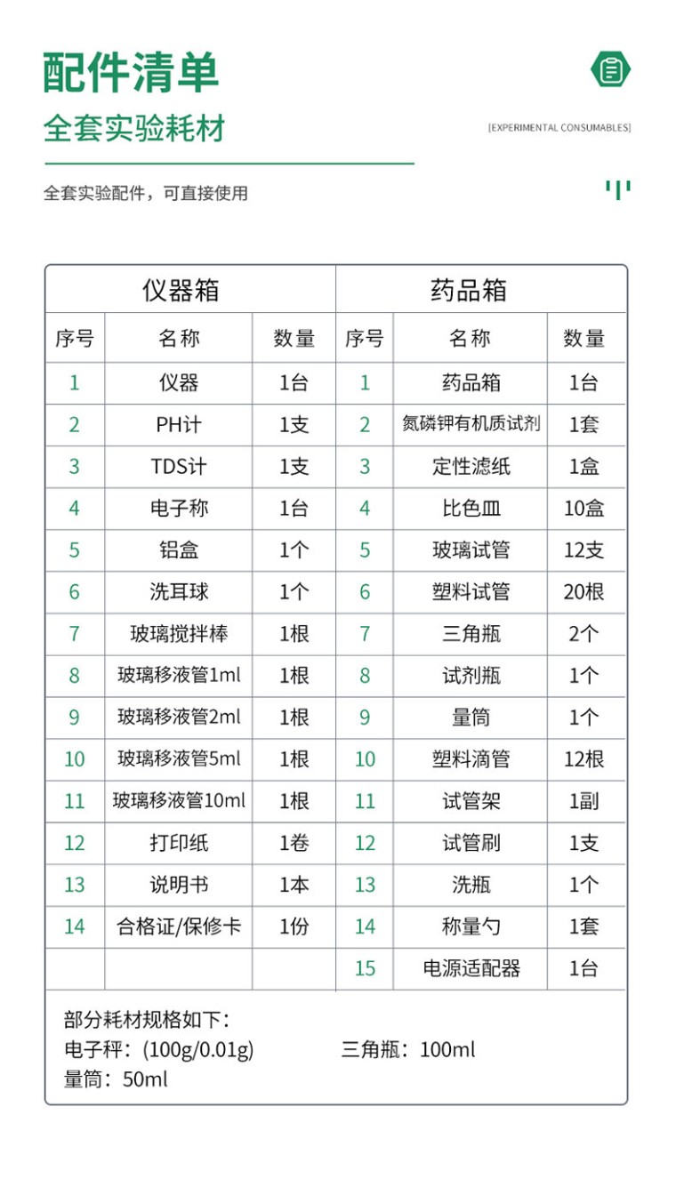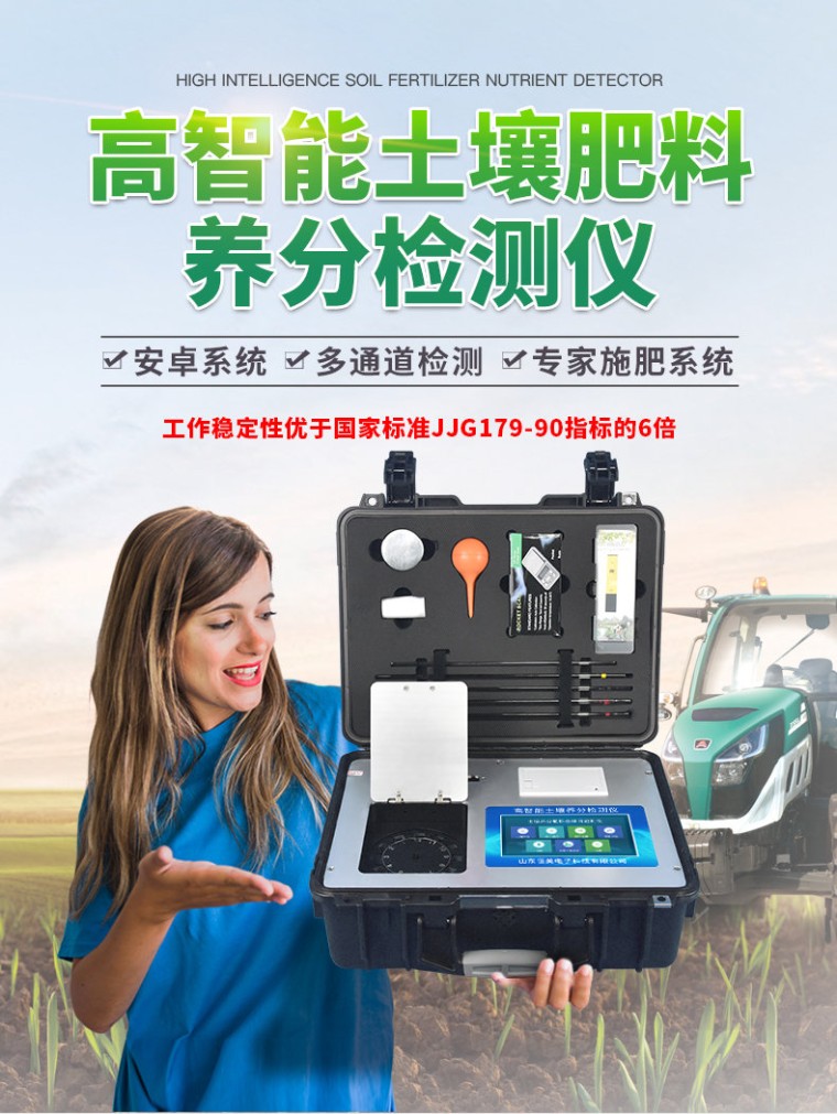 中外驰名品牌,值得信赖! 诚邀全国各地贩卖商合作项目,公司全力执行区域经营和价格保护! 行业领导,众多实际用户案例 高精度全项目,多项知识产权,***机构鉴定。 (本型号检测精度高,一般为各高校、科研院所及追求高精度的用户使用) 一、产品简介: 配套齐全:该仪器集药、器、仪为一体,携带方便,相当于一个小型移动实验室,无需用户自配附件,亦可灵活野外流动测试。适于农业服务部门或农资贩卖商、高教院校、科研院所、合作社、肥料厂商、大种植户测土施肥和鉴别肥料真假及环保检测应用。 检测功能全:测试项目国内外全面,除标配试剂外,其他各类药剂均可加配选购。 操作简便、速度快捷,配套整套附件及成品药剂开瓶即用,无须配置。 性能可靠:工作稳定性优于国家标准JJG179-90指标的6倍,重复性达到光栅型分光光度计指标水平。 二、功能多、测试项目齐全: 1、土壤养分:●土壤铵态氮、土壤有效磷、土壤速效钾、土壤硝态氮、土壤水解氮、土壤全氮、土壤全磷、土壤全钾、土壤有机质(丘林法)、土壤有机质(浸提法)、土壤总有机碳、土壤碳氮比、PH值、含盐量、水分。●土壤中微量元素:土壤钙、土壤镁、土壤硫、土壤硅、土壤硼、土壤铁、土壤铜、土壤锰、土壤锌、土壤氯、土壤钼;●土壤重金属:土壤铅、土壤砷、土壤镉、土壤铬、土壤汞、土壤镍、土壤铝、土壤氟、土壤钛、土壤硒。 2、肥料养分:●单质肥:氮肥中铵态氮、肥料硝态氮、尿素氮、缩二脲、磷肥中磷、磷肥中水溶性磷、钾肥中钾;●复合肥全氮、复合肥全磷、复合肥全钾;●有机肥全氮、有机肥全磷、有机肥全钾、有机肥硝态氮、有机肥速效磷、有机肥速效钾、有机肥酸解氮、有机质;●水溶性腐植酸(风化煤)、水溶性腐植酸(褐煤)、水溶性腐植酸(泥炭)、游离态腐植酸(风化煤)、游离态腐植酸(褐煤)、游离态腐植酸(泥炭);●水溶肥全氮、水溶肥全磷、水溶肥全钾;●叶面肥全氮、叶面肥全磷、叶面肥全钾;●各种肥料微量元素:肥料钙、肥料镁、肥料硫、肥料硅、肥料硼、肥料铁、肥料铜、肥料锰、肥料锌、肥料氯、肥料钼;●肥料重金属:肥料铅、肥料砷、肥料镉、肥料铬、肥料汞、肥料镍、肥料铝、肥料氟、肥料钛、肥料硒。 3、鲜作物营养:●作物硝态氮、作物铵态氮、作物磷、作物钾;●作物中微量元素:作物钙、作物镁、作物硫、作物硅、作物硼、作物铁、作物铜、作物锰、作物锌、作物氯、作物钼;●作物中硝酸盐、亚硝酸盐。 4、干植株营养:●植株全氮、植株全磷、植株全钾 5、烟叶营养:●全氮、全磷、全钾、还原糖、水溶性总糖、硼、锰、铁、铜、钙、镁等20项。 6、食品(水果、蔬菜等):●硝酸盐、亚硝酸盐、重金属(铅、铬、镉、砷、汞)等项。 7、水质中:●铵态氮、水中磷、水中钾、硝酸盐、亚硝酸盐、硬度、PH、铁、铜、锰、锌、硼、氯、硫、硅、钼等 三、测试效率: 土壤中速效N、P、K等多种养分一次性同时浸提测定(农业部速测行业标准起草者)。 肥料中氮(N)、磷(P)、钾(K)等养分同时、快速、准确检测。 测试速度:正常熟练程度下: 测一个土壤样品(N、P、K)三项需要20分钟(含药剂准备及土样前处理时间),同时检测三个土壤样品(N、P、K)≤40分钟,同时测8个土样≤1小时。 测试一个肥料样(N、P、K)≤50分钟,同时检测三个肥料样品(N、P、K)≤1.5小时。 四、测试误差: 土壤氮磷钾误差≤1%,有机质误差≤2%,微量元素相对误差≤5%;肥料单项误差≤0.5%,氮磷钾三项误差≤1%; 重金属相对误差小于等于5%。 五、功能特点: ★1、Android安卓智能操作系统,主控芯片采用ARM Cortex-A7,RK3288/4核处理器,主频1.88Ghz,运转速度更快速,稳定性更强。 ★2、18个检测通道,一次性可快速检测18个样品,极大提升检测效率,降低检测成本。 ★3、采用高精度滤光片技术自主专利分析方法(专利号:ZL 2020 2 1763837.9),权威认证。 ★4、检测过程中内置校准功能,智能恒流稳压,光强自动校准,确保检测准确度,取得中国计量科学研究院的《校准证书》。 ★5、仪器标配wifi无线上传、4G联网传输、GPRS无线远传,快速上传数据。 ★6、配有智慧云农业平台,仪器连入无线网络后,可将检测数据可选择性或批量无线上传,方便用户进行长期数据管理和可视化分析。 7、仪器配同时具有USB接口、以太网接口,内置大容量内存,并可随时用U盘拷贝数据。 ★8、可用手机随时登录云平台在线移动查看历史数据 ★9、内置作物专家施肥系统,可对百余种全国农业经济作物、果树等的目标产量计算推荐施肥量,依据施肥配方科学指导农业生产。测土配方施肥结果可打印,打印内容包含:作物种类、肥料种类、目标产量、需求总量、建议施肥方案。 10、内置植物营养诊断标准图谱,根据各农作物营养缺失的图片,进行叶面对比,诊断丰缺。 ★11、4波长专业测试冷光源(红、蓝、绿、橙),光源波长稳定,长时间连续工作光源无温漂现象,寿命长达10万小时级别,重现性好,准确度高。 12、比色池部分采用标准1cm比色皿,无机械位移及磨损,光路测试定位精确,有效屏蔽外光干扰,保证检测结果优于国标要求。 ★13、仪器系统内带有样品前处理操作视频,各种样品检测方法点击视频模块即可观看,检测人员无需自学说明书,指导教学方便快速,方便新手快速操作。 14、内置新一代高速热敏打印机(无需色带),打印内容包含:检测