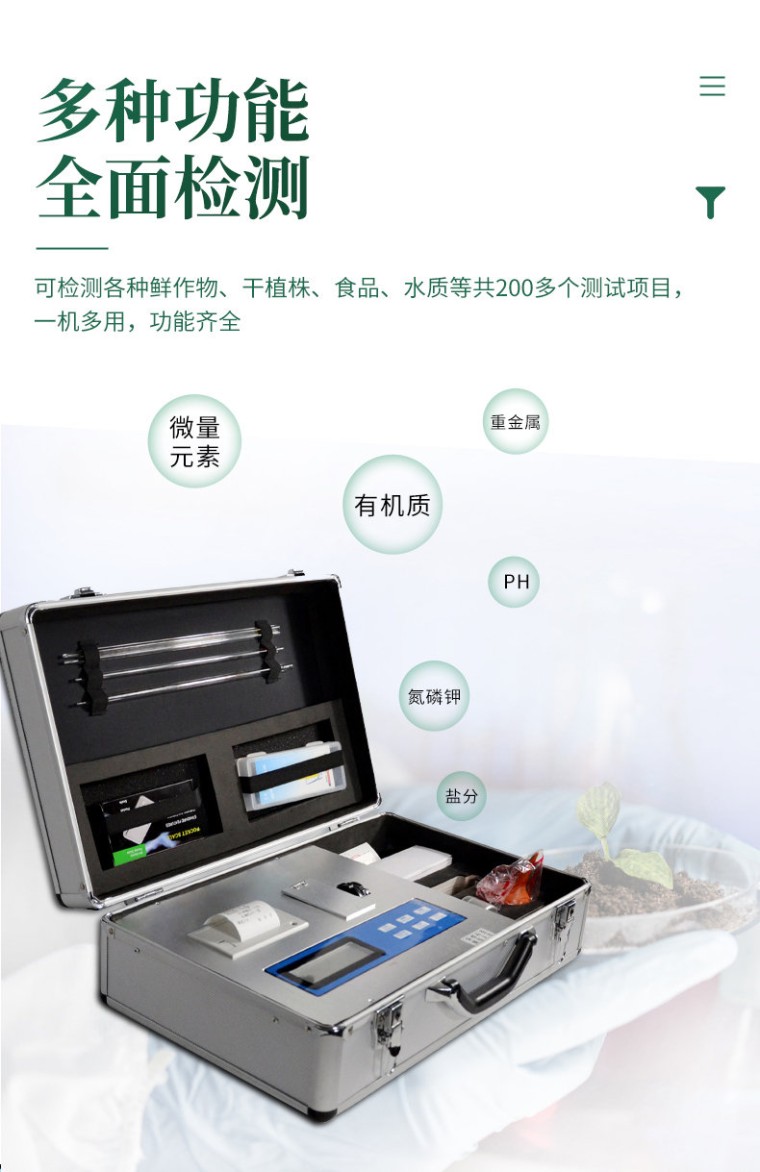 特点: 1、《机箱/药剂一体式铝合金机箱》设计,便于携带、坚固耐用,配套成品药剂。 2、微电脑控制,数字化线路、程序化设计,液晶显示,交直流两用,可野外流动测试,大程度降低操作者的失误和劳动强度。 3、分辨率:0.001,触摸式按键,内置热敏打印机,可打印测试结果。 4、可检测土壤及化肥、有机肥、植株中的速效氮、有效磷、速效钾、全氮、全磷、全钾、有机质含量,土壤酸碱度,含盐量(扩展)。 5、土壤养分速测仪采用高亮度 LED 灯作为光源, 硅半导体作为信号接收系统, 寿命长达10万小时级别。光源稳定,一致性好。 6、比色槽部分采用单通道、双光路设计,无机械位移及磨损,光路测试定位精确,保证测定结果精度。 一、测试项目: 土壤养分:● 铵态氮、速效磷、速效钾、水份、有机质、酸碱度(pH试纸法)等项; 肥料养分:● 单质化肥中的氮、磷、钾; ● 复(混)合肥及尿素中的铵态氮、磷、钾; ● 有机肥中速效氮、速效磷、速效钾、全氮、全磷、全钾、pH、有机质等。 二、仪器技术指标: 1、电源:交直流两用,交流电:180V~240V、50赫兹;直流电:5V~12V(内置锂电池) 2、量程及分辨率:0.001-9999 3、稳定性:三分钟内漂移小于0.003 4、线性误差:≤3%(0.03,硫酸铜检测) 5、重复性误差:≤0.5%(0.005,重铬酸钾溶液) 6、灵敏度:红光≥4.5 ×10-5 蓝光≥3.17×10-3 7、波长范围:红光620±8nm 蓝光440±8nm 8、土壤水分技术参数水分单位:%(g/100g)含水率测试范围:0-100% 精度:±0.5% 9、土壤中速效N、P、K三种养分一次性同时浸提测定、科学指导施肥 10、肥料中氮(N)、磷(P)、钾(K)等养分同时、快速、准确检测 11、测试速度:测一个土样(N、P、K)≤30分钟(含前处理时间) 12、可同时检测8个土样≤1个小时(含前处理时间) 13、数据打印:内置一键式热敏打印机(国内率先专利设计) 14、仪器尺寸:492*305*165mm 三、测试速度: 土壤养分速测仪可同时检测8个样品; 测一个土样(N、P、K)≤30分钟,同时检测三个土样(N、P、K)≤40分钟。 四、产品仪器特点: 配套齐全:土壤养分速测仪该仪器集药、器、仪为一体,携带方便,相当于一个小型实验室。适于农业服务部门或农资贩卖商、肥料厂商测土施肥和鉴别肥料真假。 操作简便、速度快捷,成品药剂开瓶即用,无须配置。 性能可靠:工作稳定性优于国家标准JJG179-90指标的6倍,重复性达到光栅型分光光度计指标水平。 五、售后: 仪器整机质保一年(主机质保五年),终身免费维修服务,免费邮寄仪器、免费培训。 终身免费提供土肥等农业相关技术支持!