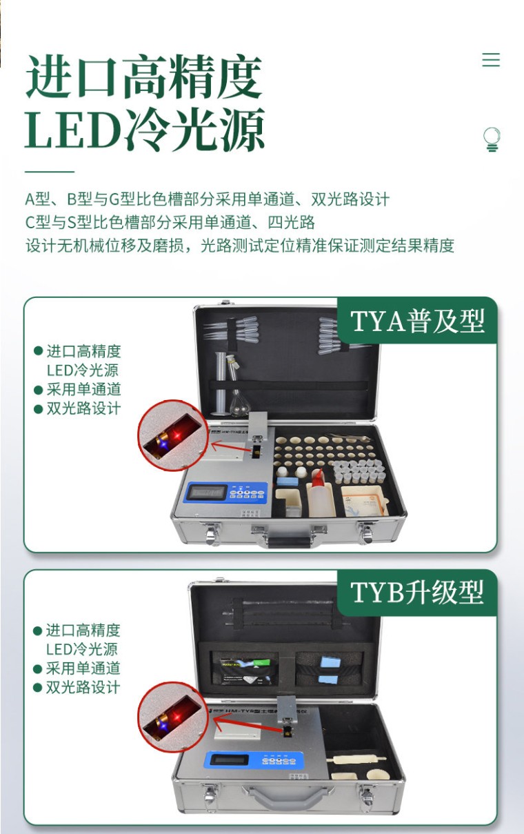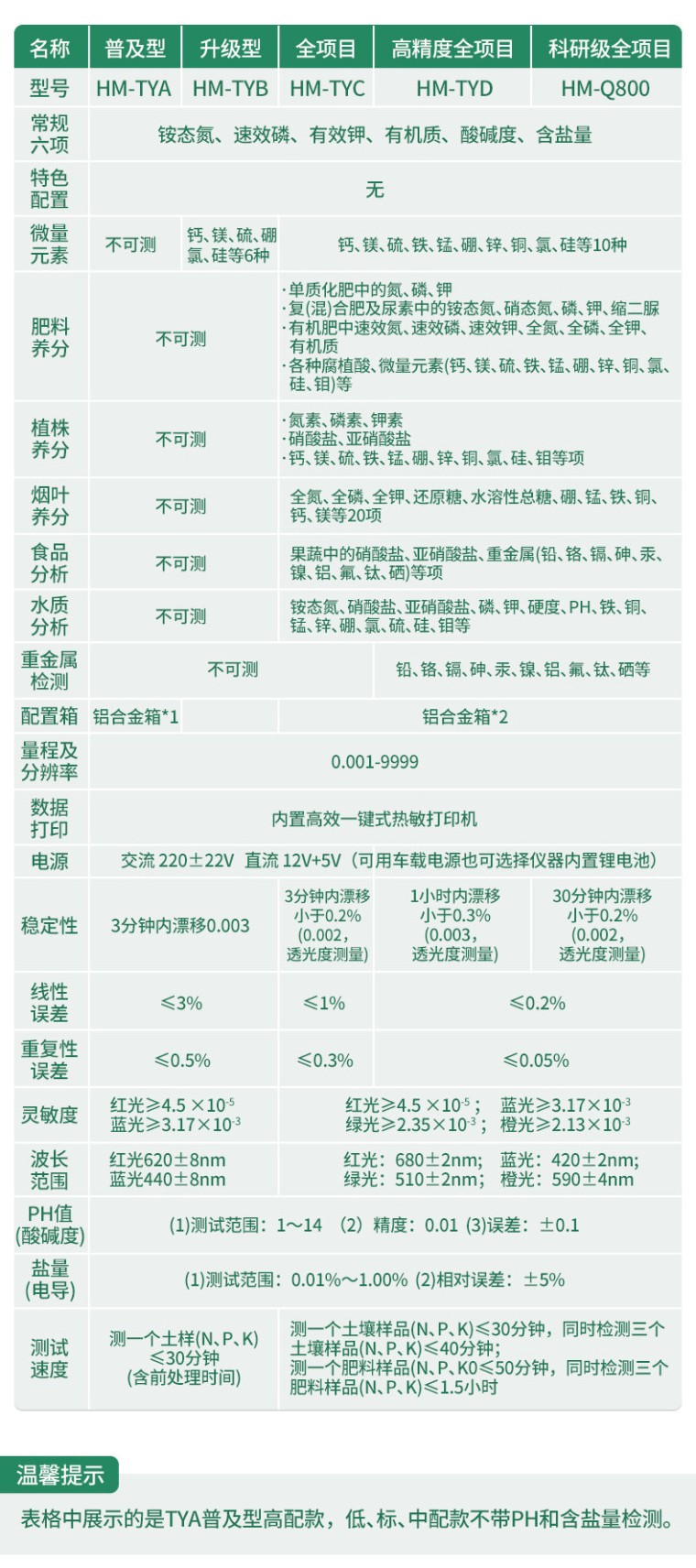 特点: 1、《机箱/药剂一体式铝合金机箱》设计,便于携带、坚固耐用,配套成品药剂。 2、微电脑控制,数字化线路、程序化设计,液晶显示,交直流两用,可野外流动测试,****降低操作者的失误和劳动强度。 3、分辨率:0.001,触摸式按键,内置热敏打印机,可打印测试结果。 4、可检测土壤及化肥、有机肥、植株中的速效氮、有效磷、速效钾、全氮、全磷、全钾、有机质含量,土壤酸碱度,含盐量,以及土壤钙、镁、硫、硼、氯、硅等6种中微量元素。 5、采用高亮度 LED 灯作为光源, 硅半导体作为信号接收系统, 寿命长达10万小时级别。光源稳定,一致性好。 6、比色槽部分采用单通道、双光路设计,无机械位移及磨损,光路测试定位精确,保证测定结果精度。 一、测试项目: 土壤养分:● 铵态氮、速效磷、速效钾、水份、有机质、酸碱度、以及钙、镁、硫、硼、氯、硅等各种中微量元素; 肥料养分:● 单质化肥中的氮、磷、钾; ● 复(混)合肥及尿素中的铵态氮、磷、钾; ● 有机肥中速效氮、速效磷、速效钾、全氮、全磷、全钾、pH、有机质等。 二、仪器技术指标: 1、电源:交流电:180V~240V、50赫兹;直流电:12V+5V(可接车载电源) 2、量程及分辨率:0.001-9999 3、稳定性:三分钟内漂移小于0.003 4、线性误差:≤3%(0.03,硫酸铜检测) 5、重复性误差:≤0.5%(0.005,重铬酸钾溶液) 6、灵敏度:红光≥4.5 ×10-5 蓝光≥3.17×10-3 7、波长范围:红光620±8nm 蓝光440±8nm 8、土壤水分技术参数水分单位:﹪(g/100g)含水率测试范围:0-100﹪ 精度:±0.5﹪ 9、土壤中速效N、P、K三种养分一次性同时浸提测定、科学推荐施肥量 10、 肥料中氮(N)、磷(P)、钾(K)等养分同时、快速、准确检测 11、测试速度:测一个土样(N、P、K)≤30分钟(含前处理时间) 12 .可同时检测8个土样≤1个小时(含前处理时间) 13、 数据打印:内置高档一键式热敏打印机(国内**专利设计) (专利号:ZL 2018 2 1777724.7) 三、测试速度: 可同时检测8个样品; 测一个土样(N、P、K)≤30分钟,同时检测三个土样(N、P、K)≤40分钟; 测一个肥料(N、P、K)≤50分钟,同时检测三个土样(N、P、K)≤1.5小时。 四、产品仪器特点: 配套齐全:该仪器集药、器、仪为一体,携带方便,相当于一个小型实验室。适于农业服务部门或农资贩卖商、肥料厂商测土施肥和鉴别肥料真假。 操作简便、速度快捷,成品药剂开瓶即用,无须配置。 性能可靠:工作稳定性优于国家标准JJG179-90指标的6倍,重复性达到光栅型分光光度计指标水平。 五、售后: 仪器整机质保一年(主机质保五年),终身免费维修服务,免费邮寄仪器、免费培训。 终身免费提供土肥等农业相关技术支持!