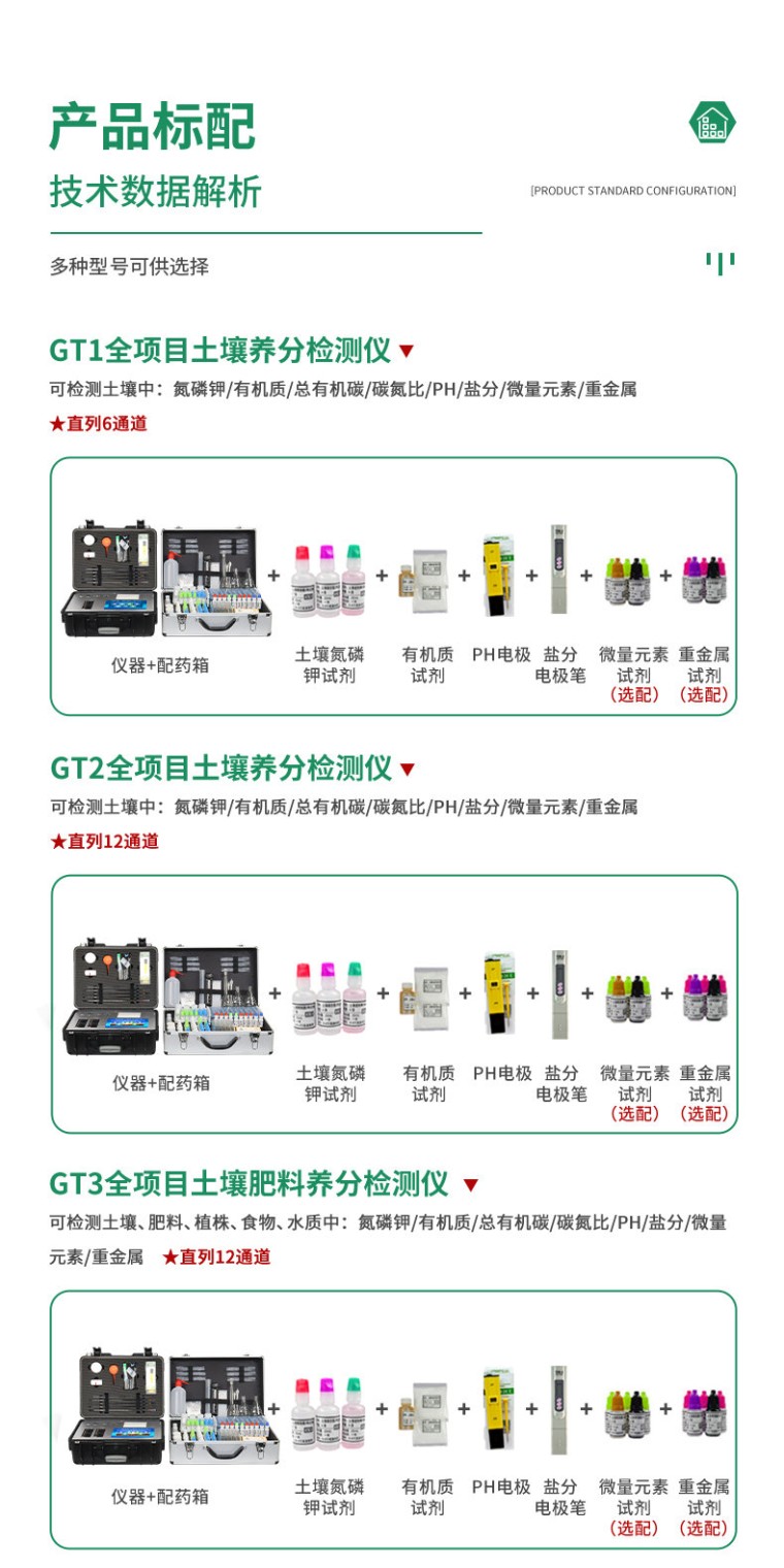 中外驰名品牌,值得信赖! 恒久品质,美创未来! 诚邀全国各地贩卖商合作项目,公司全力执行区域经营和价格保护! 行业领导,众多实际用户案例 高精度全项目,多项知识产权,***机构鉴定。 (本型号检测精度高,一般为各高校、科研院所及追求高精度的用户使用) 一、产品简介: 配套齐全:该仪器集药、器、仪为一体,携带方便,相当于一个小型移动实验室,无需用户自配附件,亦可灵活野外流动测试。适于农业服务部门或农资贩卖商、高教院校、科研院所、合作社、肥料厂商、大种植户测土施肥和鉴别肥料真假及环保检测应用。 检测功能全:测试项目国内外全面,除标配试剂外,其他各类药剂均可加配选购。 操作简便、速度快捷,配套整套附件及成品药剂开瓶即用,无须配置。 性能可靠:工作稳定性优于国家标准JJG179-90指标的6倍,重复性达到光栅型分光光度计指标水平。 二、功能多、测试项目齐全: 1、土壤养分:●土壤铵态氮、土壤有效磷、土壤速效钾、土壤硝态氮、土壤水解氮、土壤全氮、土壤全磷、土壤全钾、土壤有机质(丘林法)、土壤有机质(浸提法)、土壤总有机碳、土壤碳氮比、PH值、含盐量、水分。●土壤中微量元素:土壤钙、土壤镁、土壤硫、土壤硅、土壤硼、土壤铁、土壤铜、土壤锰、土壤锌、土壤氯、土壤钼;●土壤重金属:土壤铅、土壤砷、土壤镉、土壤铬、土壤汞、土壤镍、土壤铝、土壤氟、土壤钛、土壤硒。 2、肥料养分:●单质肥:氮肥中铵态氮、肥料硝态氮、尿素氮、缩二脲、磷肥中磷、磷肥中水溶性磷、钾肥中钾;●复合肥全氮、复合肥全磷、复合肥全钾;●有机肥全氮、有机肥全磷、有机肥全钾、有机肥硝态氮、有机肥速效磷、有机肥速效钾、有机肥酸解氮、有机质;●水溶性腐植酸(风化煤)、水溶性腐植酸(褐煤)、水溶性腐植酸(泥炭)、游离态腐植酸(风化煤)、游离态腐植酸(褐煤)、游离态腐植酸(泥炭);●水溶肥全氮、水溶肥全磷、水溶肥全钾;●叶面肥全氮、叶面肥全磷、叶面肥全钾;●各种肥料微量元素:肥料钙、肥料镁、肥料硫、肥料硅、肥料硼、肥料铁、肥料铜、肥料锰、肥料锌、肥料氯、肥料钼;●肥料重金属:肥料铅、肥料砷、肥料镉、肥料铬、肥料汞、肥料镍、肥料铝、肥料氟、肥料钛、肥料硒。 3、鲜作物营养:●作物硝态氮、作物铵态氮、作物磷、作物钾;●作物中微量元素:作物钙、作物镁、作物硫、作物硅、作物硼、作物铁、作物铜、作物锰、作物锌、作物氯、作物钼;●作物中硝酸盐、亚硝酸盐。 4、干植株营养:●植株全氮、植株全磷、植株全钾 5、烟叶营养:●全氮、全磷、全钾、还原糖、水溶性总糖、硼、锰、铁、铜、钙、镁等20项。 6、食品(水果、蔬菜等):●硝酸盐、亚硝酸盐、重金属(铅、铬、镉、砷、汞)等项。 7、水质中:●铵态氮、水中磷、水中钾、硝酸盐、亚硝酸盐、硬度、PH、铁、铜、锰、锌、硼、氯、硫、硅、钼等 三、测试效率: 土壤中速效N、P、K等多种养分一次性同时浸提测定(农业部速测行业标准起草者)。 肥料中氮(N)、磷(P)、钾(K)等养分同时、快速、准确检测。 测试速度:正常熟练程度下: 测一个土壤样品(N、P、K)三项需要20分钟(含药剂准备及土样前处理时间),同时检测三个土壤样品(N、P、K)≤40分钟,同时测8个土样≤1小时。 测试一个肥料样(N、P、K)≤50分钟,同时检测三个肥料样品(N、P、K)≤1.5小时。 四、测试误差: 土壤氮磷钾误差≤1%,有机质误差≤2%,微量元素相对误差≤5%;肥料单项误差≤0.5%,氮磷钾三项误差≤1%; 重金属相对误差小于等于5%。 五、功能特点: ★1、Android安卓智能操作系统,主控芯片采用ARM Cortex-A7,RK3288/4核处理器,主频1.88Ghz,运转速度更快速,稳定性更强。 ★2、采用精密旋转比色池设计(专利号:ZL 2018 2 1777724.7),光源一致性更加精确,保证检测精度。 ★3、12个旋转检测通道,一次性可快速检测12个样品,极大提升检测效率,降低检测成本。 ★4、采用高精度滤光片技术自主专利分析方法(专利号:ZL 2020 2 1763837.9),权威认证。 ★5、检测过程中内置校准功能,智能恒流稳压,光强自动校准,确保检测准确度,取得中国计量科学研究院的《校准证书》。 ★6、仪器标配wifi无线上传、GPRS无线远传功能,户外可配置4G联网传输,快速上传数据。 ★7、配有智慧云农业平台,仪器连入无线网络后,可将检测数据可选择性或批量无线上传,方便用户进行长期数据管理和可视化分析。 8、仪器配同时具有USB接口、以太网接口,内置大容量内存,并可随时用U盘拷贝数据。 ★9、可用手机随时登录云平台在线移动查看历史数据 ★10、内置作物专家施肥系统,可对百余种全国农业经济作物、果树等的目标产量计算推荐施肥量,依据施肥配方科学指导农业生产。测土配方施肥结果可打印,打印内容包含:作物种类、肥料种类、目标产量、需求总量、建议施肥方案。 11、内置植物营养诊断标准图谱,根据各农作物营养缺失的图片,进行叶面对比,诊断丰缺。 ★12、4波长专业测试冷光源(红、蓝、绿、橙),光源波长稳定,长时间连续工作光源无温漂现象,寿命长达10万小时级别,重现性好,准确度高。 13、比色池部分采用标准1cm比色皿,无机械位移及磨损,光路测试定位精确,有效屏蔽外光干扰,保证检测结果优于国标要求。 ★14、仪器系统内带有样品前处理操作视频,各种样品检测方法点击视频模块即可