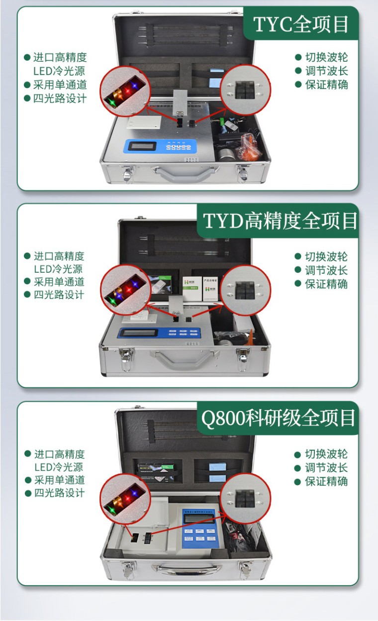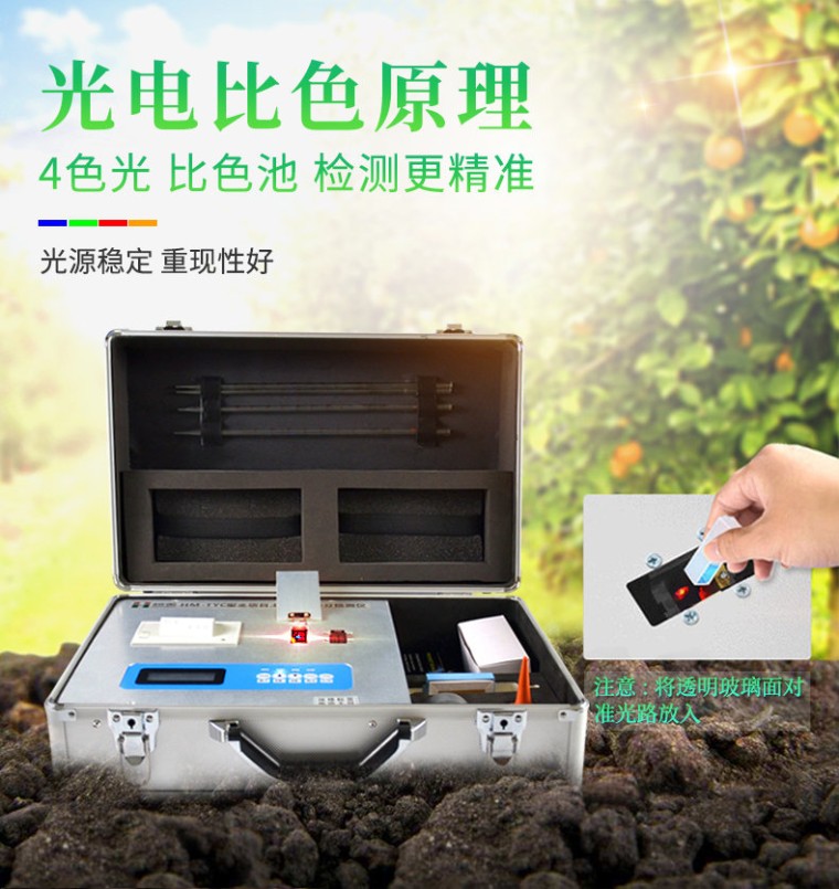 产品特点: ★该款为全项目土壤肥料养分检测仪的升级款,喷塑钢板外壳设计,坚固耐用,配套成套附件及成品药剂。 ★微电脑控制,数字化线路、程序化设计,液晶显示,交直流两用,可野外流动测试。 ★分辨率:0.001,触摸式按键,内置高档热敏打印机,可打印测试结果。 ★可检测土壤及化肥、有机肥(含叶面肥、水溶肥、喷施肥等)、植株中的速效氮、速效磷、有效钾、全氮、全磷、全钾、有机质、酸碱度,钙、镁、硫、铁、锰、硼、锌、铜、氯、硅、钼等各种中微量元素以及铅、铬、镉、汞、砷、镍、铝、氟、钛、硒等各种重金属含量。 ★**采用高亮LED灯光源、双拨轮滤光式处理技术,保证光源波长稳定, 硅半导体作为信号接收系统,寿命长达10万小时级别。光源稳定,重现性好,准确度高。 ★比色槽部分采用单通道设计,无机械位移及磨损,光路测试定位精确,保证测定结果精度。 ★配套专家施肥系统数据,可对百余种农业、果树、经济作物目标产量科学计算推荐施肥量。 ★采用自主发明专利分析方法,保证检测结果保证达到国标要求。 一、功能多、测试项目齐全: 1、土壤养分:●铵态氮、硝态氮、速效磷、速效钾、有机质、全氮、pH值、水份、碱解氮等九项; ● 中微量元素:钙、镁、硫、铁、锰、硼、锌、铜、氯、硅、钼等。 2、肥料养分:● 单质化肥中的氮、磷、钾; ● 复(混)合肥及尿素中的铵态氮、硝态氮、磷、钾、缩二脲; ● 有机肥中速效氮、速效磷、速效钾、全氮、全磷、全钾、有机质,各种腐植酸、微量元素(钙、镁、硫、铁、锰、硼、锌、铜、氯、硅、钼)等。 3、植株养分:● 植株中的氮素、磷素、钾素;硝酸盐、亚硝酸盐;钙、镁、硫、铁、锰、硼、锌、铜、氯、硅、钼等项。 4、烟叶养分:全氮、全磷、全钾、还原糖、水溶性总糖、硼、锰、铁、铜、钙、镁等20项。 5、土壤、肥料重金属:铅、铬、镉、砷、汞、镍、铝、氟、钛、硒等近十种重金属。 6、食品(水果、蔬菜等):硝酸盐、亚硝酸盐、重金属(铅、铬、镉、砷、汞、镍、铝、氟、钛、硒)等项。 7、水质:●铵态氮、硝酸盐、亚硝酸盐、磷、钾、硬度、PH、铁、铜、锰、锌、硼、氯、硫、硅、钼等。 二、仪器技术指标: 1、电源:交流 220±22V 直流 12V+5V(可用车载电源也可选择仪器内置锂电池) 2、功率: ≤5W 3、量程及分辨率:0.001-9999 4、重复性误差: ≤0.05%(0.0005,重铬酸钾溶液) 5、仪器稳定性:三十分钟内漂移小于0.2%(0.002,透光度测量)。仪器开机预热5分钟后,十分钟内显示数字无漂移(透光度测量),三十分钟内数字漂移不超过0.2%(透光度测量)、0.001(吸光度测量)。 6、线性误差: ≤0.2%(0.002,硫酸铜检测) 7、灵敏度:红光≥4.5 ×10-5 蓝光≥3.17×10-3 绿光≥2.35×10-3 橙光≥2.13×10-3 8、波长范围 :红光:680±2nm; 蓝光:420±2nm;绿光:510±2nm;橙光:590±10nm 9、PH值(酸碱度): (1)测试范围:1~14 (2)精度:0.01 (3)误差:±0.1 10、含盐量(电导):(1)测试范围:0.01%~1.00% (2)相对误差:±5% 11、土壤水分技术参数水分单位:﹪(g/100g);含水率测试范围:0-100﹪;误差小于0.5% 12、土壤中速效N、P、K三种养分一次性同时浸提测定、科学指导施肥量(农业部速测行业标准起草者) 13、肥料中氮(N)、磷(P)、钾(K)等养分同时、快速、准确检测(**发明专利技术) 14、测试速度:测一个土样(N、P、K)≤30分钟(含前处理时间,不需用户提供任何附件) 15、同时测8个土样≤1小时(含前处理时间) 16、数据打印:内置新型一键式热敏打印机 17、预留232数据接口,可与电脑相连进行数据传输。 三、测试速度: 测一个土壤样品(N、P、K)≤30分钟,同时检测三个土壤样品(N、P、K)≤40分钟; 测试一个肥料样(N、P、K)≤50分钟,同时检测三个肥料样品(N、P、K)≤1.5小时。 四、测试误差: 土壤误差≤5%;肥料单项误差≤0.5%,氮磷钾三项误差≤1%。 五、产品仪器特点: 功能全:测试项目国内外最全(各类药剂均可选购)。 配套齐全:该仪器集药、器、仪为一体,携带方便,相当于一个小型实验室。适于农业服务部门或农资贩卖商、肥料厂商测土施肥和鉴别肥料真假。 操作简便、速度快捷,成品药剂开瓶即用,无须配置。 六、售后: 仪器整机质保五年,终身免费维修服务,免费邮寄仪器、免费培训。 终身免费提供土肥等农业相关技术支持!