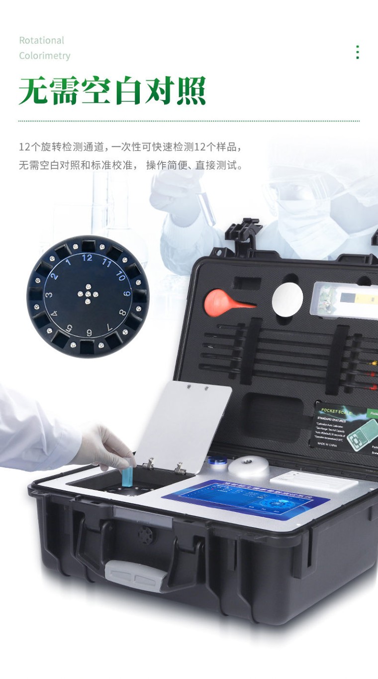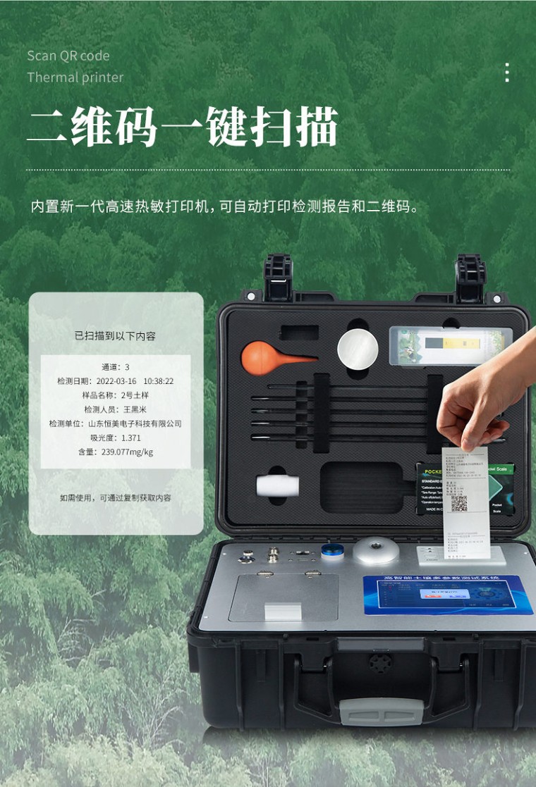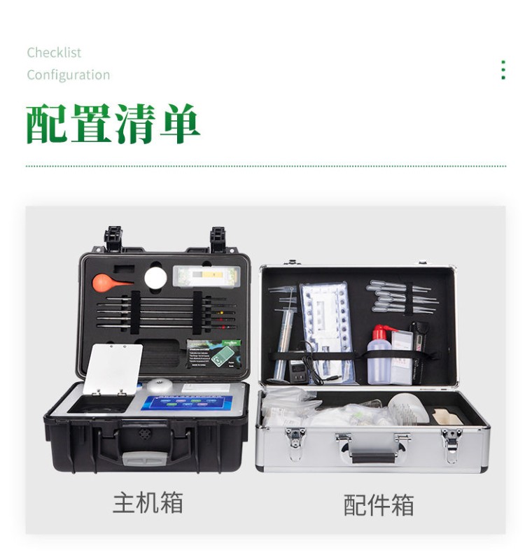 一、产品简介: 配套齐全:该仪器集药、器、仪为一体,携带方便,相当于一个小型移动实验室,无需用户自配附件,亦可灵活野外流动测试。适于农业服务部门或农资贩卖商、高教院校、科研院所、合作社、肥料厂商、大种植户测土施肥和鉴别肥料真假及环保检测应用。 检测功能全:测试项目国内外全面,除标配试剂外,其他各类药剂均可加配选购。 速度快捷:无需空白对照和标准校准,操作简便、直接测试,配套成品药剂开瓶即用,无须配置。 二、功能多、测试项目齐全: 1、土壤养分:●土壤铵态氮、土壤有效磷、土壤速效钾、土壤硝态氮、土壤碱解氮、土壤全氮、土壤全磷、土壤全钾、土壤有机质(丘林法)、土壤有机质(浸提法)、PH值、含盐量、水分。●土壤中微量元素:土壤钙、土壤镁、土壤硫、土壤硅、土壤硼、土壤铁、土壤铜、土壤锰、土壤锌、土壤氯;●土壤重金属:土壤铅、土壤砷、土壤镉、土壤铬、土壤汞。 2、肥料养分:●单质肥:氮肥中铵态氮、肥料硝态氮、尿素氮、缩二脲、磷肥中磷、磷肥中水溶性磷、钾肥中钾;●复合肥全氮、复合肥全磷、复合肥全钾;●有机肥全氮、有机肥全磷、有机肥全钾、有机肥硝态氮、有机肥速效磷、有机肥速效钾、有机肥酸解氮、有机质;●水溶性腐植酸(风化煤)、水溶性腐植酸(褐煤)、水溶性腐植酸(泥炭)、游离态腐植酸(风化煤)、游离态腐植酸(褐煤)、游离态腐植酸(泥炭);●水溶肥全氮、水溶肥全磷、水溶肥全钾;●叶面肥全氮、叶面肥全磷、叶面肥全钾;●各种肥料微量元素:肥料钙、肥料镁、肥料硫、肥料硅、肥料硼、肥料铁、肥料铜、肥料锰、肥料锌、肥料氯;●肥料重金属:肥料铅、肥料砷、肥料镉、肥料铬、肥料汞。 3、鲜作物营养:●作物硝态氮、作物铵态氮、作物磷、作物钾;●作物中微量元素:作物钙、作物镁、作物硫、作物硅、作物硼、作物铁、作物铜、作物锰、作物锌、作物氯;●作物中硝酸盐、亚硝酸盐、总糖量、还原糖、蛋白质。 4、干植株营养:●植株全氮、植株全磷、全钾、植株中微量元素:植株全钙、植株全镁、植株全硫、植株全铁、植株全锰、植株全硼、植株全锌、植株全铜、植株全氯、植株全硅。 5、烟叶营养:●全氮、全磷、全钾、还原糖、水溶性总糖、硼、锰、铁、铜、钙、镁等20项。 6、食品(水果、蔬菜等):●农药残留、硝酸盐、亚硝酸盐、铅、砷、镉、铬、汞、铜、铝、二氧化硫、双氧水、苯甲酸钠、山梨酸、糖精钠、甜蜜素、硫酸镁、甲醛、吊白块、硼砂、溴酸钾、总酸、色素、蛋白质、葡萄糖、淀粉酶等项。 7、水质中:COD、氨氮、总磷、总氮、余氯、溶解氧、二氧化氯、水中氰化物;重金属铅、砷、镉、铬、汞;水中硝酸盐、亚硝酸盐、硬度、PH、铁、铜、锰、锌、铝、硼、氯、硫、硅等 三、测试效率: 土壤中速效N、P、K等多种养分一次性同时浸提测定(农业部速测行业标准起草者)。 肥料中氮(N)、磷(P)、钾(K)等养分同时、快速、准确检测。 测试速度:正常熟练程度下: 测一个土壤样品(N、P、K)三项需要15分钟(含药剂准备及土样前处理时间),同时检测十个土壤样品(N、P、K)≤50分钟。 测试一个肥料样(N、P、K)≤40分钟,同时检测三个肥料样品(N、P、K)≤1小时。 四、测试误差: 土壤氮磷钾误差≤1%,有机质误差≤2%,微量元素相对误差≤5%;肥料单项误差≤0.5%,氮磷钾三项误差≤1%; 重金属相对误差小于等于5%。 五、功能特点: ★1、安卓智能操作系统Android 7.1版本,主控芯片采用ARM Cortex-A7,RK3288/4核处理器,主频1.88Ghz,运转速度更快速,稳定性更强。 ★2、可检测各种土壤、肥料、作物、食品、水质、环境等共200多个测试项目,一机多用,功能齐全。 ★3、测试速度更快!无需空白对照和标准校准,省却以往繁琐的操作步骤,一键式操作,直接读取数据,高效率,低消耗。 ★4、采用精密旋转比色池设计(专利号:ZL 2018 2 1777724.7),光源一致性更加精确,保证检测精度。 ★5、12个旋转检测通道,一次性可快速检测12个样品,极大提升检测效率,降低检测成本。 ★6、采用高精度滤光片技术自主专利分析方法(专利号:ZL 2020 2 1763837.9),权威认证。 ★7、具有自身保护功能,内置人脸识别摄像头可扫脸登录,也可设置用户名和密码,防止非工作人员操作查看实验数据。 ★8、检测过程中内置校准功能,智能恒流稳压,光强自动校准,确保检测准确度,取得中国计量科学研究院的《校准证书》。 ★9、仪器标配wifi无线上传、4G联网传输、GPRS无线远传,快速上传数据。 ★10、配有智慧云农业平台,仪器连入无线网络后,可将检测数据可选择性或批量无线上传,方便用户进行数据管理和长期分析。 11、仪器配同时具有USB接口、以太网接口,内置大容量内存,并可随时用U盘拷贝数据。 ★12、可用手机随时登录云平台在线移动查看历史数据 ★13、内置作物专家施肥系统,可对百余种全国农业经济作物、果树等的目标产量计算推荐施肥量,依据施肥配方科学指导农业生产。测土配方施肥结果可打印,打印内容包含:作物种类、肥料种类、目标产量、需求总量、建议施肥方案。 ★14、内置植物营养诊断标准图谱,根据各农作物营养缺失的图片,进行叶面对比,诊断丰缺。 ★15、4波长专业测试冷光源(红、蓝、绿、橙),光源波长稳定,长时间连续工作光源无温漂现象,寿命长达10万小时级别,重现性好,准确度高。 