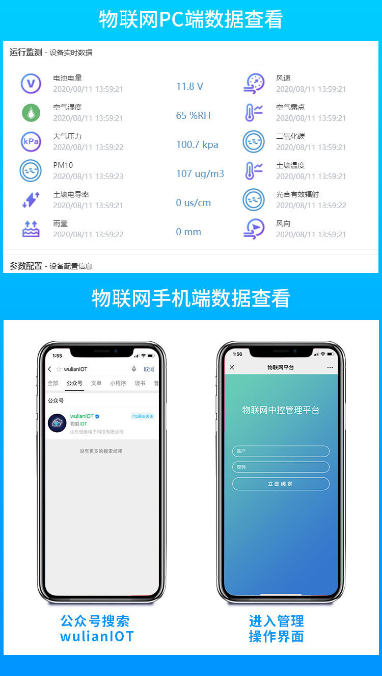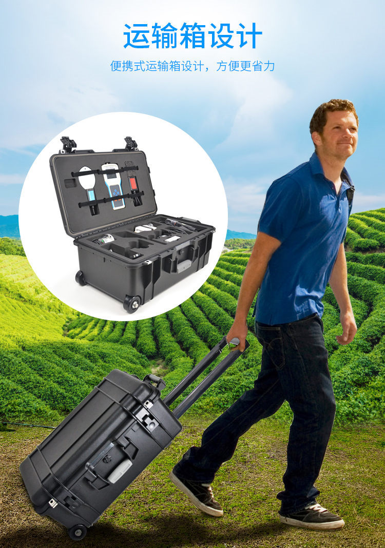 简述: 便携式气象仪是我们专门针对农田、草场局部小尺度环境设计的,对与植被和农作物生长密切相关的土壤、水气等环境参数监测的农田小气候站。它主要观测与农业相关的空气温度、空气湿度、光照强度、二氧化碳浓度、露点温度、光合有效辐射、土壤温度、土壤湿度、土壤盐分、土壤PH等10个环境参数气象要素,为农业科研、农业生产等提供良好的支持。 技术参数: 空气温度范围:-30~70℃ 精度:±0.2℃ 分辨率:0.01℃ 空气湿度范围:0~100% 精度:±3% 分辨率:0.1% 光照强度范围:0~200Klux 精度:±5% 分辨率:0.1Klux 二氧化碳测量范围:0~2000ppm 精度:±3% 分辨率:0.1% 露点温度量程:-20~+50℃ 精度±0.5℃ 分辨率0.1℃ 光合有效辐射范围:400~700nm 灵 敏 度:10~50μv/μmol·m-2·s-1 土壤温度测量范围:-40~120℃ 精度:±0.2℃ 分辨率:0.01℃ 土壤水分测量范围:0~100% 精度:±3% 分辨率:0.1% 土壤盐分范围:0-20ms 精度:±2% 分辨率:±0.1ms 土壤PH测量范围:0-14 测量精度:±0.2% 分辨率:0.1 可配置GPS模块,4G模块,短信模块,MAX485 突出性能: 采用一体化结构设计,内置GPS模块,4G模块,外置SD卡,能准确的测量出被测地点的地理信息,界面除显示所测环境参数、存储数据外,还可显示测点的经纬度。通过内置的GPRS一键上传被测点的环境因子测量数据等。同时还可以通过外置SD卡直接把数据导出到电脑上。(可选) 本机体积小巧、美观,操作简单方便,性能可靠,野外携带极为方便。主机连接传感器后可以手动存储记录也可通过主机任意设置采样间隔,自动存储记录数据。 大屏幕中文液晶显示,全程跟踪记录各个被测环境因子的数值、组数、低电压示警,主机内置大容量存储器,可储存三十万条数据,具有断电数据自动存储保护功能。 各个传感器插入主机后,主机具有自动识别功能,传感器一致性好,可按需求自行组合传感器,不同参数的传感器接口可以互相转换,对测量精度没有影响。 仪器具有多通道自动检测扩展功能,可以实现多个传感器同时接入的同步检测。 中心站软件功能强大,数据通过中心站软件统一收集、处理、分析,随时可以通过USB接口将记录中的数据导出到计算机上,并可以存储为EXCE表格文件,生成数据曲线,以供其它分析软件进一步进行数据处理。具有设置超限区域着色功能,超限数据变色预警,可作为环境评价的一个依据。 适用范围: 广泛应用于农业、林业、环保、水利、气象行业、旱作节水灌溉、地质勘探、植物培育等领域。