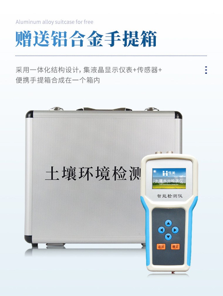 一、产品简介: 土壤水分温度盐分测定仪传感器采用一体化结构设计,可快速准确测量土壤中含水量、温度和电导率(盐分),可对多处样地、不同土壤深度的水分含量温度和盐分进行快速检测和长期连续监测。广泛应用于土壤墒情检测、旱作节水灌溉、精细农业、林业、地质勘探、植物培育、水利、环保等领域。 二、功能: 1、☆仪器可加配4G联网功能和数据管理平台,将本机存储的历史数据无线上传到智慧云农业平台,方便用户进行数据管理和长期分析。 2、同时显示土壤电导率和盐分数值,免去用户手动计算,读数直观。 3、本机体积小巧、美观,操作简单方便,性能可靠,野外携带极为方便。主机连接传感器后可以手动存储记录也可通过主机任意设置采样间隔,自动存储记录数据。 4、全程跟踪记录各个被测环境因子的数值、组数、低电压示警,主机内置大容量存储器,可储存十万条数据,具有断电数据自动存储保护功能。 5、各个传感器插入主机后,主机具有自动识别功能,传感器一致性好,可按需求自行组合传感器,不同参数的传感器接口可以互相转换,对测量精度没有影响。 6、仪器具有多通道自动检测功能,加配集线器后可以实现多个传感器同时接入同步检测。 7、上位机软件功能强大,随时可以通过USB接口将记录中的数据导出到计算机上,并可以存储为EXCE表格文件,生成数据曲线,以供其它分析软件进一步进行数据处理。可作为环境评价的一个依据。同时还可以通过打印机进行打印,数据上传等。 三、技术参数: 土壤水分: 1、土壤容积含水量; .单位:%(m3/m3); .测试灵敏度:±0.01 %(m3/m3); .量程:0-100%(m3/m3); .测量精度:0-50%(m3/m3)范围内)±2%(m3/m3); 50-100%(m3/m3)范围内)±3%(m3/m3); .分辨率:0.1% .互换精度:<3% .复测误差:<1% .响应时间:<1秒 .测量稳定时间:1秒 .测量区域:直径为10cm、高为10cm的圆柱体 2、土壤温度: .范围:-40-120℃ .测量精度:±0.5℃ .分辨率:±0.1℃ .互换误差:<0.2℃ .响应时间:<100mS . 稳定时间:<1秒 3、土壤电导率(盐分): .范围:0-20ms .测量精度:±2% .分辨率:±0..1ms .水分温度材料特性:不锈钢(抗电解,可经受长期电解,可经受土壤中的酸碱腐蚀) .通讯方式:USB2.0 .软件:上位机软件免费赠送 .线缆:水分国标屏蔽线2米,温度聚四氟耐高温导线2米。 .测量方式:插入式、埋藏式、剖面等 .供电方式:锂电池供电、交流电两种方式 .可配置GPS模块,GPRS模块,短信模块,MAX485