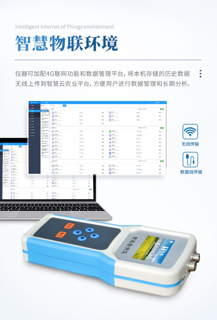 4G版土壤水分温度盐分电导率PH氮磷钾测定仪采用一体化结构设计,可快速准确测量土壤中含水量、温度、电导率(盐分)、酸碱度、氮磷钾,可对多处样地、不同土壤深度的水分含量温度盐分和PH进行快速检测和长期连续监测。 广泛应用于土壤墒情检测、旱作节水灌溉、精细农业、林业、地质勘探、植物培育、水利、环保等领域。 功能介绍: 1、本机体积小巧、美观,操作简单方便,性能可靠,野外携带极为方便。主机连接传感器后可以手动存储记录也可通过主机任意设置采样间隔,自动存储记录数据。 2、同时显示土壤电导率和盐分数值,免去用户手动计算,读数直观。 3、大屏幕彩色液晶显示屏,全程跟踪记录各个被测环境因子的数值、组数、低电压,内置大容量存储器,可储存三十万条数据,具有断电数据自动存储保护功能。 4、各个传感器插入主机后,主机具有自动识别功能,传感器一致性好,可按需求自行组合传感器,不同参数的传感器接口可以互相转换,对测量精度没有影响。 5、仪器具有多通道自动检测扩展功能,可以实现多个传感器同时接入的同步检测。 6、上位机软件功能强大,随时可以通过USB接口将记录中的数据导出到计算机上,并可以存储为EXCE表格文件,生成数据曲线,以供其它分析软件进一步进行数据处理。具有设置超限区域着色功能,超限数据变色预警,可作为环境评价的一个依据。 7、仪器配备4G联网功能数据管理平台,将本机存储的被测点环境因子测量历史数据无线上传到智慧云农业平台,方便用户进行数据管理和长期分析。 技术参数: 土壤水分: 土壤容积含水量(%) 范围:0-100% 测量精度:0-50%范围内,±2% ;50-100%范围内,±3% 分辨率:0.1% 互换精度:<3% 复测误差:<1% 响应时间:<1秒 测量稳定时间:1秒 测量区域:直径为10cm、高为10cm的圆柱体 土壤温度: 范围:-40-80℃ 测量精度:±0.5℃ 分辨率:0.1℃ 土壤电导率: 范围:0-20000us/cm 测量精度:0-10000us/cm范围内为±3%;10000-20000us/cm范围内为±5% 分辨率:0-10000us/cm内10us/cm;100000-20000us/cm内50us/cm 土壤盐分: 范围:0-50g/Kg 测量精度:±5% 分辨率:0.001g/Kg 土壤PH: 范围:0-14 分辨率:0.01 测量精度:±0.1 土壤氮磷钾: 范围:0-1999mg/Kg 测量精度:±1mg/Kg 分辨率:1mg/Kg 仪器尺寸:204*100*36(mm)(长*宽*高) 重量:0.3kg 软件:上位机软件免费赠送