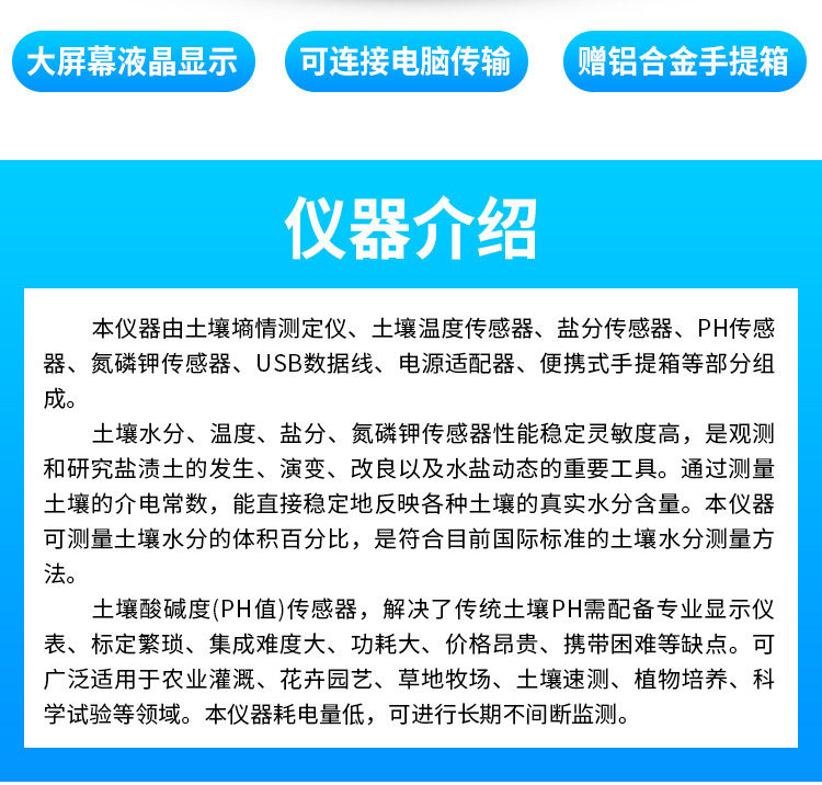 土壤电导率测定仪器是一种便携式常规测量分析仪器,采用一体化结构设计,可以测量土壤盐分,有便携式主机、传感器、软件等组成,操作简便。 技术参数: .土壤盐分范围:0-20ms .测量精度:±1% .分辨率:±0.01ms 输出信号:0~2.0V 互换精度:< 2% 复测误差:< 1% 工作温度范围:-40℃~85℃ .供电方式:锂电池供电、交流电两种方式 .软件:上位机软件免费赠送 突出性能: .采用一体化结构设计,内置GPS模块,GPRS模块,外置SD卡,能准确的测量出被测地点的地理信息,界面除显示所测环境参数、存储数据外,还可显示测点的经纬度。通过内置的GPRS一键上传被测点的环境因子测量数据等。同时还可以通过外置SD卡直接把数据导出到电脑上。 .本机体积小巧、美观,操作简单方便,性能可靠,野外携带极为方便。主机连接传感器后可以手动存储记录也可通过主机任意设置采样间隔,自动存储记录数据。 .大屏幕中文液晶显示,全程跟踪记录各个被测环境因子的数值、组数、低电压示警,主机内置大容量存储器,可储存三十万条数据,具有断电数据自动存储保护功能。 .各个传感器插入主机后,主机具有自动识别功能,传感器一致性好,可按需求自行组合传感器,不同参数的传感器接口可以互相转换,对测量精度没有影响。 .仪器具有多通道自动检测扩展功能,可以实现多个传感器同时接入的同步检测。 .上位机软件功能强大,随时可以通过USB接口将记录中的数据导出到计算机上,并可以存储为EXCE表格文件,生成数据曲线,以供其它分析软件进一步进行数据处理。具有设置超限区域着色功能,超限数据变色预警,可作为环境评价的一个依据。 适用范围: .广泛应用于土壤墒情检测、旱作节水灌溉、精细农业、林业、地质勘探、植物培育、水利、环保等领域。