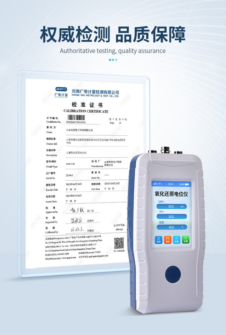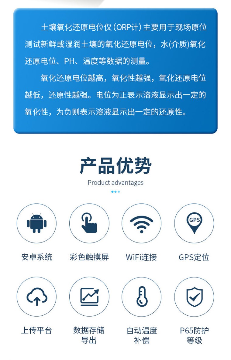 一、产品介绍 土壤氧化还原电位仪(ORP计)主要用于现场原位测试新鲜或湿润土壤的氧化还原电位,水(介质)氧化还原电位、PH、温度等数据的测量。符合《HJ746-2015土壤氧化还原电位的测定电位法》标准。 土壤氧化还原电位(ORP/Eh)作为土壤环境条件的一个综合性指标,已沿用很久,它表征介质氧化性或还原性的相对程度,对土壤的化学和生物学过程有重要的影响,是理解土壤的性质和过程的重要参数。氧化还原电位越高,氧化性越强,氧化还原电位越低,还原性越强。电位为正表示溶液显示出一定的氧化性,为负则表示溶液显示出一定的还原性。 水质氧化还原电位(oxidationreduction potential ORP)是非常重要的水质指标之一,它虽然不能独立反应水质的好坏,但是能够综合其他水质指标来反应水生系统中的生态环境。1.工业污水处理:用于水处理上的氧化还原系统,主要是铬酸的还原与氰化物的氧化;2.水的消毒与应用:氧化还原电位能衡量对游泳池水、矿泉水及自来水的消毒效果。因为水中大肠菌的杀菌效率与氧化还原电位有关,所以氧化还原电位是水质的可靠指标;3.养殖行业:氧化还原电位可以反映出水中某些无机物的浓度、水生生物状态、水中含氧量,体现水质宏观氧化还原性,是判断水质状况的一个综合指标。 二、产品参数 (1)ORP:测量范围 -2000mV——2000mV 分辨率 0.1mV 误差范围 ±10mV (2)PH: 测量范围 0——14PH 分辨率0.1PH 误差范围:0.05PH (3)温度:测量范围 5——60℃ 分辨率:0.1℃ 误差范围 ±1℃ (4)外接电源:DC 5V /2A (5)额定功率:3W (6)电池容量:6000mAh 三、产品特点 ●ARM Cortex-M3架构处理器,Android系统。 ●标准Type-c充电,可直接使用手机充电器为设备进行充电。 ●连续检测,数据采集时间可按min设定。 ●支持校准 ●具有自动温度补偿功能,支持手动温度补偿 ●配套专用ORP电极、参比电极和不锈钢空心杄,可直接插入土壤 ●具有读数锁定功能(自动读数),测量结果为终结果,无需换算和计算 ●检测结果可上传。 ●检测结果可导出Excel表格,连接电脑进行查看。 ●检测结果存储容量500万条,支持数据存储、查阅。 ●支持Wi-Fi,检测结果直接传至监管平台 ●3.5寸彩色触摸屏,提供更好的用户体验。 ●具有自动背光及自动关机功能;; ●P65防护等级。 四、配置清单