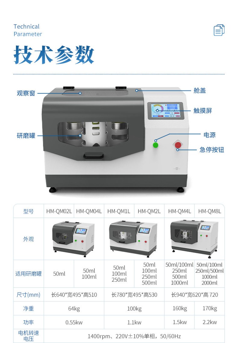 一、仪器介绍 玛瑙研磨机适用于土壤、地质、环保、第三方检测、农牧业、农产品质量、资源与环境等行业,可以对土壤制样、重金属等物质进行研磨分析;对不同特征的样品均可研磨,包括脆性的,纤维性的,中低硬度的,干磨或湿磨等等; 仪器机械处理原理:撞击力、剪切力、摩擦力 仪器机械处理类型:粉碎、研磨、混合、均一化 二、主机参数 1、主盘转速:50-450 r/min 2、研磨罐转速:100-900 r/min;传动比(行星盘、研磨罐):1:2 3、可连续工作(满负荷):90h 4、显示方式:7.0寸彩色可触摸液晶显示屏 5、运行模式可自由设置:单向持续运行、单向间隔运行、双向交替间隔运行、以及定时停止 连续运行时间设定:0~999小时 交替、单向间隔暂停时间设定:0~9999分钟 6、可远程遥控:标配无线遥控器,可远距离控制研磨机的启动、停止、加速、减速以及切换三种运行模式 7、断电记忆功能:断电之前的时间设定,断电开机后无须重新设定 8、安全防护:内置过载保护功能;红色急停按钮可一键断电停机; 9、研磨室设计:密封防护,带四方位观察窗 10、同时处理样品种数:4种 11、电源端口:国标、欧标、美标、英标等 12、电机转速、功率、电压:1400rpm、1.1kw、220V±10%单相,50/60Hz 13、净重: 100kg 14、尺寸: 长780*宽495*高530 15、噪声描述:约60dB(不同规格可咨询售前) 15、防护等级:IP60 三、匹配研磨罐 1、适用研磨罐:本机是新款通用型,100ml、250ml、500ml规格研磨罐均可使用,可根据客户需求使用不同规格的研磨罐;对角对称即可(4个研磨罐为一套)。 2、最大进样尺寸:土壤12mm 其他3mm 3、研磨罐配球量:罐子容积的三分之一 4、最大装样量:研磨罐容积的三分之二 5、出样粒度:最小可达0.1um(即1.0×10mm-4) 6、研磨罐材质:玛瑙、陶瓷、聚四氟乙烯、氧化锆、聚氨酯、不锈钢、尼龙、碳化钨、硬质合金等可选(常用玛瑙、氧化锆研磨罐) 7、研磨球材质:玛瑙、氧化锆、不锈钢、陶瓷、硬质合金、碳化硅等 8、研磨球直径:3、5、10、15、20mm(根据实际需求配置)