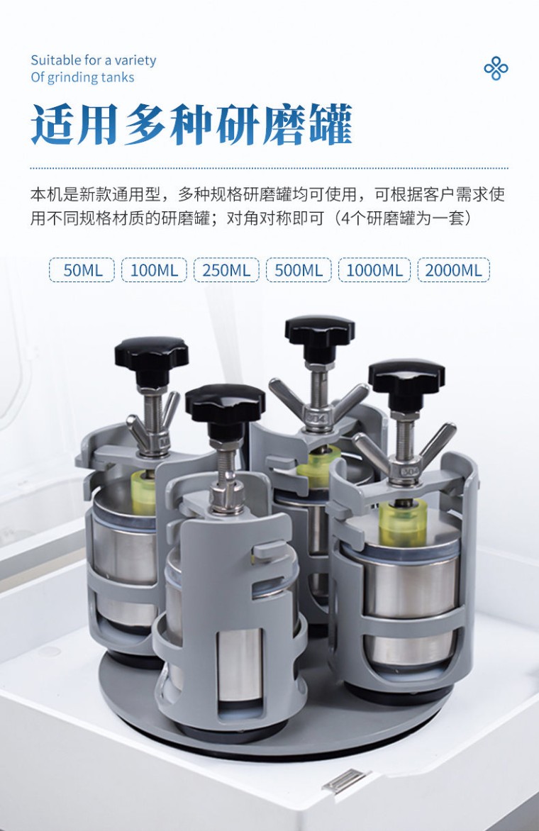 一、仪器介绍 土壤样品研磨机适用于土壤、地质、环保、第三方检测、农牧业、农产品质量、资源与环境等行业,可以对土壤制样、重金属等物质进行研磨分析;对不同特征的样品均可研磨,包括脆性的,纤维性的,中低硬度的,干磨或湿磨等等; 仪器机械处理原理:撞击力、剪切力、摩擦力 仪器机械处理类型:粉碎、研磨、混合、均一化 二、主机参数 1、主盘转速:50-450 r/min 2、研磨罐转速:100-900 r/min;传动比(行星盘、研磨罐):1:2 3、可连续工作(满负荷):90h 4、显示方式:7.0寸彩色可触摸液晶显示屏 5、运行模式可自由设置:单向持续运行、单向间隔运行、双向交替间隔运行、以及定时停止 连续运行时间设定:0~999小时 交替、单向间隔暂停时间设定:0~9999分钟 6、可远程遥控:标配无线遥控器,可远距离控制研磨机的启动、停止、加速、减速以及切换三种运行模式 7、断电记忆功能:断电之前的时间设定,断电开机后无须重新设定 8、安全防护:内置过载保护功能;红色急停按钮可一键断电停机; 9、研磨室设计:密封防护,带四方位观察窗 10、同时处理样品种数:4种 11、电源端口:国标、欧标、美标、英标等 12、电机转速、功率、电压:1400rpm、1.5kw、220V±10%单相,50/60Hz 13、净重: 160kg 14、尺寸: 长940*宽620*高 720。 15、噪声描述:约60dB(不同规格可咨询售前) 15、防护等级:IP60 三、匹配研磨罐 1、适用研磨罐:本机是新款通用型,50ml、100ml、250ml、500ml、1000ml四种规格研磨罐均可使用,可根据客户需求使用不同规格材质的研磨罐;对角对称即可(4个研磨罐为一套)。 2、最大进样尺寸:土壤12mm 其他3mm 3、研磨罐配球量:罐子容积的三分之一 4、最大装样量:研磨罐容积的三分之二 5、出样粒度:最小可达0.1um(即1.0×10mm-4) 6、研磨罐材质:玛瑙、陶瓷、聚四氟乙烯、氧化锆、聚氨酯、不锈钢、尼龙、碳化钨、硬质合金等可选(常用玛瑙、氧化锆研磨罐) 7、研磨球材质:玛瑙、氧化锆、不锈钢、陶瓷、硬质合金、碳化硅等 8、研磨球直径:3、5、10、15、20mm(根据实际需求配置