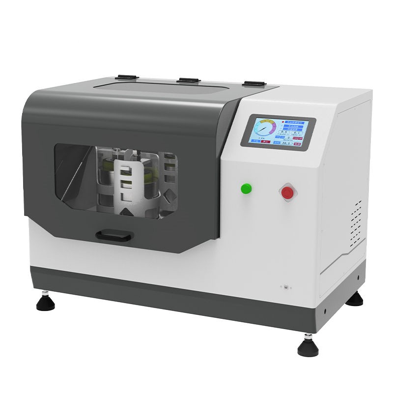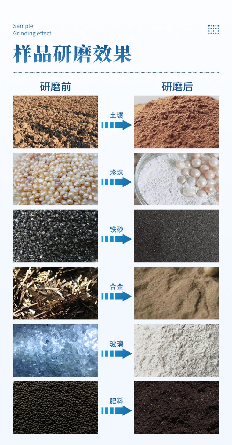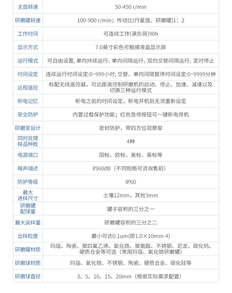 一、仪器介绍 玛瑙球磨机适用于土壤、地质、环保、第三方检测、农牧业、农产品质量、资源与环境等行业,可以对土壤制样、重金属等物质进行研磨分析;对不同特征的样品均可研磨,包括脆性的,纤维性的,中低硬度的,干磨或湿磨等等; 仪器机械处理原理:撞击力、剪切力、摩擦力 仪器机械处理类型:粉碎、研磨、混合、均一化 二、主机参数 1、主盘转速:50-450 r/min 2、研磨罐转速:100-900 r/min;传动比(行星盘、研磨罐):1:2 3、可连续工作(满负荷):90h 4、显示方式:7.0寸彩色可触摸液晶显示屏 5、运行模式可自由设置:单向持续运行、单向间隔运行、双向交替间隔运行、以及定时停止 连续运行时间设定:0~999小时 交替、单向间隔暂停时间设定:0~9999分钟 6、可远程遥控:标配无线遥控器,可远距离控制研磨机的启动、停止、加速、减速以及切换三种运行模式 7、断电记忆功能:断电之前的时间设定,断电开机后无须重新设定 8、安全防护:内置过载保护功能;红色急停按钮可一键断电停机; 9、研磨室设计:密封防护,带四方位观察窗 10、同时处理样品种数:4种 11、电源端口:国标、欧标、美标、英标等 12、电机转速、功率、电压:1400rpm、2.2kw、220V±10%单相,50/60Hz 13、净重: 170kg 14、尺寸: 长940*宽620*高 720。 15、噪声描述:约60dB(不同规格可咨询售前) 15、防护等级:IP60 三、匹配研磨罐 1、 适用研磨罐:本机是新款通用型,50ml、100ml、250ml、500ml、1000ml、2000ml六种规格研磨罐均可使用,可根据客户需求使用不同规格材质的研磨罐;对角对称即可(4个研磨罐为一套)。 2、最大进样尺寸:土壤12mm 其他3mm 3、研磨罐配球量:罐子容积的三分之一 4、最大装样量:研磨罐容积的三分之二 5、出样粒度:最小可达0.1um(即1.0×10mm-4) 6、研磨罐材质:玛瑙、陶瓷、聚四氟乙烯、氧化锆、聚氨酯、不锈钢、尼龙、碳化钨、硬质合金等可选(常用玛瑙、氧化锆研磨罐) 7、研磨球材质:玛瑙、氧化锆、不锈钢、陶瓷、硬质合金、碳化硅等 8、研磨球直径:3、5、10、15、20mm(根据实际需求配置)
