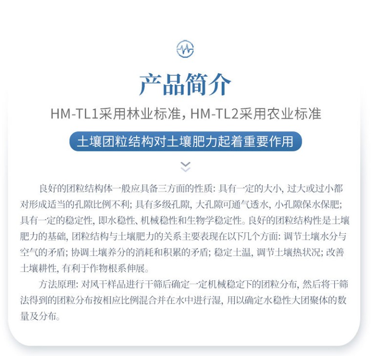 一、产品简介 1、土壤团粒结构对土壤肥力起着重要作用。良好的团粒结构体一般应具备三方面的性质:具有一定的大小,过大或过小都对形成适当的孔隙比例不利;具有多级孔隙,大孔隙可通气透水,小孔隙保水保肥;具有一定的稳定性,即水稳性、机械稳性和生物学稳定性。良好的团粒结构性是土壤肥力的基础,团粒结构与土壤肥力的关系主要表现在以下几个方面:调节土壤水分与空气的矛盾;协调土壤养分的消耗和积累的矛盾;稳定土温,调节土壤热状况;改善土壤耕性,有利于作物根系伸展。土壤团粒分析仪适用于土壤、环境、地质等试验室对团聚体的分析。 2、方法原理 对风干样品进行干筛后确定一定机械稳定下的团粒分布,然后将干筛法得到的团粒分布按相应比例混合并在水中进行湿,用以确定水稳性大团聚体的数量及分布。 二、术语和定义 1、土壤团聚体 土壤所含的大小不同、形状不-、有不同孔度和机械稳定性及水稳性的团聚体的总和。它是由胶体的凝聚、胶结和黏结而相互联结的土壤原生颗粒组成的。 2、土壤大团聚体 土中直径0.25mm~10m的团聚体称为壤大团聚体 3、土壤水稳性大团聚体 是钙、镁有机质、菌丝等胶结起来的土粒,在水中振荡、浸泡、冲洗而不易崩解,仍维持其原来结构的大团聚体。 三、仪器特点 1、结构主要有调速器、减速齿轮、平衡架组成,体积小、重量轻、无噪声; 2、外形美观,装配有自动停车装置,安全急停装置,漏电保护等安全装置; 3、结构先进,性能良好,使用装夹套筛方便灵活。 4、调速电机:全铜线圈,运行平稳;力矩大;效率高;噪音低。 5、采用MCU数字控制技术,功能丰富,性能优异。 6、采用数显菜单式选项,修改设定方便快捷。 7、可根据用户显示需要设定显示倍率,自动换算显示目标值。 8、面板旋钮自动匹配最高转速,调速控制方便、安全。 9、独立计时器,控制启动停止,功能清晰,方便操作。 10、堵转保护功能,防止电机、调速器因堵转烧坏。(此功能可保护堵转过载,但无法保护非堵转过载) 11、漏电保护器:短路保护/过载保护/漏电保护/阻燃材料 12、急停按钮:防滑按键设计,按下后锁住,旋转即可复位,在实验过程中处理紧急情况,快速断电。 13、十字型振荡架,可以同时放4套标准筛 14、加厚不锈钢水桶(带提手); 四、技术参数 1、主机:长500mm*宽500mm*高890mm 2、不锈钢桶:330mm(直径)*430mm(高) 3、标准筛:200mm(直径)*50mm(高) 4、标准筛孔径:10mm,7mm,5mm,3mm,2mm,1mm,0.5mm,0.25mm。(可选配其他规格孔径) 5、急停开关:双控 6、数显调速器:显示转速、调节转速 7、电机转速:1400rpm 8、振动频率:0-56次/分钟 9、振动幅度:30mm、40mm、50mm可定制(默认50mm) 10、数显计时器 计时 11、定时范围:0~9999分钟 12、电源:220V 50Hz 120W 13、漏电保护器:10A 14、重量:54kg