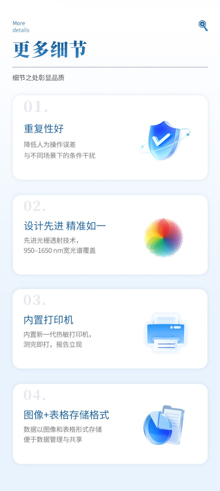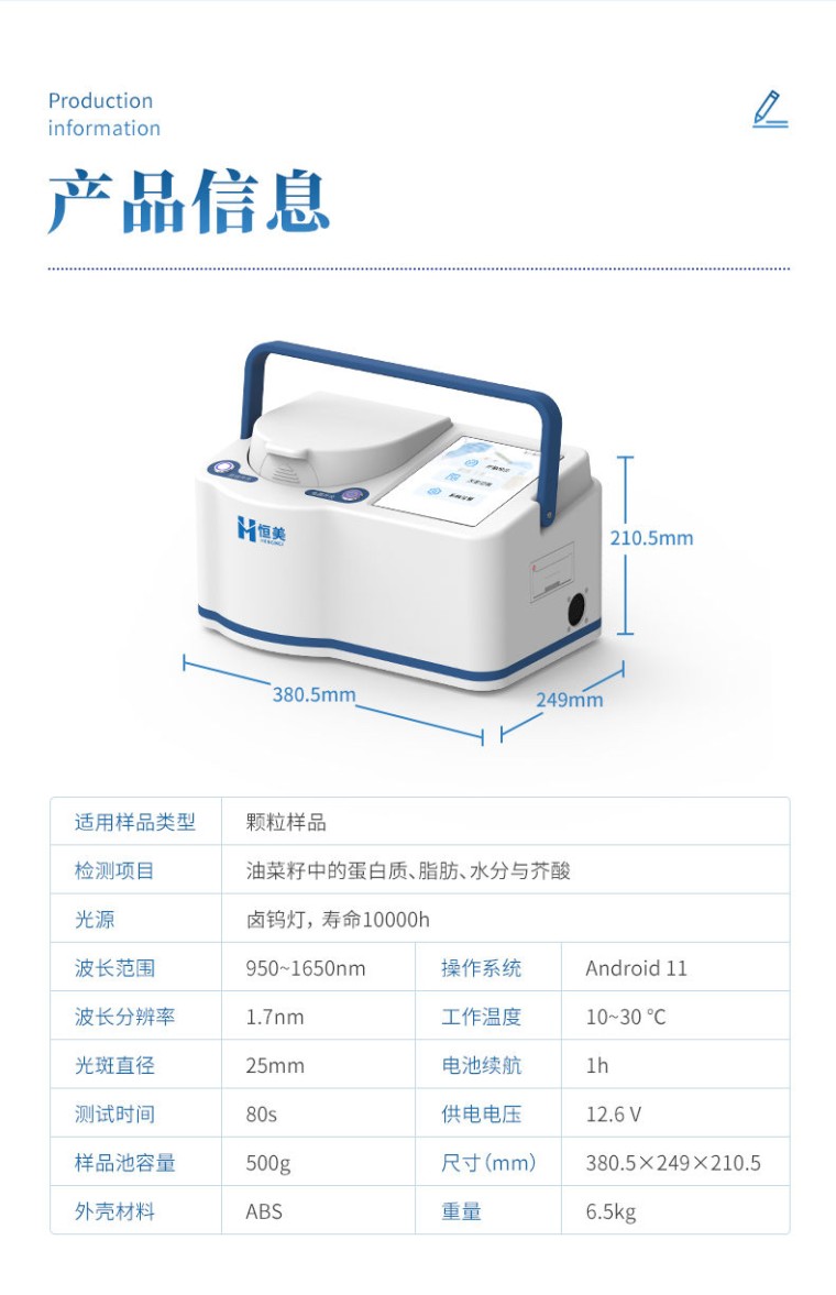 一、仪器简介 油菜籽快速检测仪采用近红外光谱技术,可同时无损检测油菜籽中的蛋白质、脂肪、水分和芥酸等指标。分析过程无需复杂前处理,数十秒内即可得出结果,极大提升了检测效率,降低了时间和人力成本。该仪器操作智能简便,是粮油加工、食品检测、育种研发和贸易收购等领域进行原料验收、过程控制与品质评定的理想工具。 二、检测原理 基于近红外(Near Infrared,NIR)光谱技术采集的光谱信息中包含着样品物质成分(如蛋白质、脂肪、水分和芥酸分子)N-H、C-H、O-H、C-O等化学键的泛频振动或转动信息,用化学计量学方法在光谱信息与被测物质成分之间建立数学关联,可以实现对相关检测指标的定量分析。 三、应用范围 本仪器广泛应用于油菜籽产业链的各个环节,为品质管控与价值评估提供高效解决方案。在育种端,可快速筛选优质种质资源;在加工端,服务于油脂、食品及饲料企业的原料验收与生产过程控制环节;在贸易端,为现货收购、期货交割实现现场快速定价与品质鉴定。同时,是科研及检测机构进行成分分析与科学研究的得力工具,全面覆盖从田间到车间的精准检测需求。 四、仪器特点 1、分析速度快:油菜籽指标在1 ~ 1.5 min内完成测量; 2、检测项目全:油菜籽中的蛋白质、脂肪、水分与芥酸; 3、无损检测:样品无需前处理,光源安全,不破坏样品; 4、绿色环保:无需化学试剂,无化学肥料等污染物,环保无害; 5、便携性:手持式设计使仪器可以随时随地使用,方便现场检测分析; 6、重复性好:降低人为操作误差与不同场景下的条件干扰; 7、设计先进:采用先进的光栅透射检测方法,全波长覆盖950 ~ 1650 nm,仪器之间具有高度的一致性,保证定标传递的准确度; 8、操作简单:采用触摸屏键盘设计,软件界面友好,操作简单,无需复杂培训即可掌握操作步骤; 9、内置新一代高速热敏打印机; 10、用图像和表格存储格式。 五、技术参数 1、 适用样品类型:颗粒样品 2、 光源:卤钨灯,寿命10000 h 3、 波长范围:950 ~ 1650 nm 4、 波长分辨率:1.7 nm 5、 光斑直径:25 mm 6、 测试时间:80 s 7、 样品池容量:500 g 8、 外壳材料:ABS 9、 操作系统:Android 11 10、 工作温度:10 ~ 30 ℃ 11、 电池续航:1 h 12、 供电电压:12.6 V 13、 通信功能:4G模块(选装) 14、 尺寸:380.5 mm×249 mm×210.5 mm 15、 重量:6.5 kg
