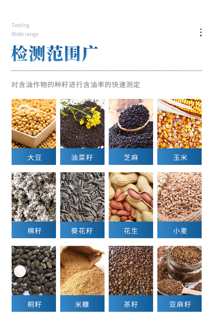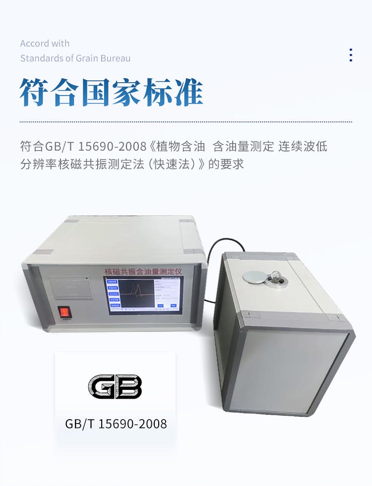 核磁共振含油量测定仪是一款专业用于含油作物及其加工物进行含油量检测的高科技产品,该仪器采用核磁共振技术,基于嵌入式开发平台和数字信号处理技术,对含油作物的种籽如大豆、油菜籽、芝麻、玉米、棉籽、葵花籽、花生、小麦、桐籽、米糠、茶籽等及其饼、粕进行含油率的快速测定,是无损检测领域的新型产品,该仪器具有操作简单方便、测试精度高、测试速度快等特点,与国内同类仪器相比,采用自创技术“频率自锁定技术”,无需人工调节,减少人为误差,测量精度和稳定度极大提高。 仪器特点 1、核磁共振含油率测量仪自带7寸真彩色液晶屏,操作界面简洁,鼠标+键盘,与电脑操作模式一致 2、设备可进行无损无污染检测,油籽物种在检测后可以再进行压榨和利用,不会造成浪费 3、稳定度为±0.1%,测量精度高、稳定性好。对不同物种采用智能分类检测方法,每次测量时间只需0.5分钟 4、软件自动进行频率调节,逐步提示指导操作流程,采用频率自锁定技术,无需人工调节,操作简便,减少人为误差,提高测量精度 5、可以在电磁干扰较强环境下工作,抗干扰性强 6、用户可自行配置模式,打印内容更灵活丰富。不仅可以直接保存在机器上,也可通过U盘保存,并在电脑中打开处理 7、升级软件从网上下载到U盘,插入设备USB口,升级自动完成 仪器基本参数 1、试样容积:40ml; 2、样品含油率范围:0.05%~100%; 3、测量准确度:±0.2%; 4、测量稳定度 每小时+0.2% 5、单次测量时间 30秒左右出测量结果 6、供电电压:220V,50Hz; 7、功率:≤40W; 8、工作温度:-10℃-40℃; 9、设备毛重 电子机箱≤8Kg 10、测试种类:含油作物的种籽如大豆、油菜籽、芝麻、玉米、棉籽、葵花籽、花生、小麦、桐籽、米糠、茶籽等及其饼、粕; 11、符合GB/T 15690-2008,《植物含油 含油量测定 连续波低分辨率核磁共振测定法(快速法)》的要求; 12、操作系统:7寸Linux触摸屏,操作方便; 13、结果打印:嵌入式微型打印机,可及时打印测量结果。