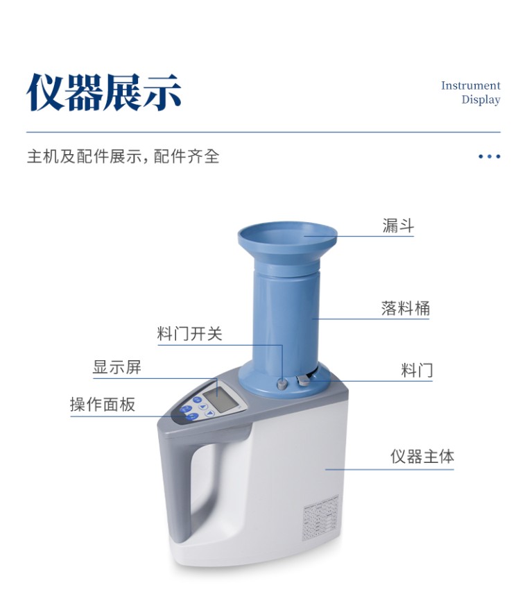 粮食水分测定仪是老型粮食水分测定仪的升级产品、在原来的基础上增加了自动累加测量次数,计算平均值功能和容量自动换算显示功能,其性能更稳定可靠,拥有外观设计国家专利,外形新颖美观,完全能与国外同类产品媲美,是水分测量仪器理想的升级换代产品。 功能特点: 容重换算:独特的专利容重取样装置在精确测量小麦的同时,可以直接换算出小麦容重指标。 测量范围:可测量谷类、玉米、东北玉米、大麦、小麦、白小麦、大米、豆粕、花生仁、菜粕、高粱、黑芝麻、棉籽、棉粕、籼谷、大豆、油菜籽、饲料、蔬菜种子等非金属颗粒状物质。 快速准确:数秒内即可显示结果,测量误差≤±0.5℅ 操作简单:20个常见品种已预先定标,不需秤样、用料简取样后可立即测量水分 水分测量范围:3-35℅ 使用环境温度:0~40℃ 温度补偿:自动 定 标:浮动四点定标,品种不限(常见品种20个已预先定标,可直接测量) 工作电源:直流6V(5号干电池四节) 自动关机:超过三分钟无操作自动关机。 便携方便:重约1千克、外型小巧、电源交直流二用,适合各种工作场合 适合国情:用户可对本地特殊品种采用本机**的四点定标法自行定标,自行修正水分值 高性价比:技术含量高,性能先进而价格相比同类产品较低。