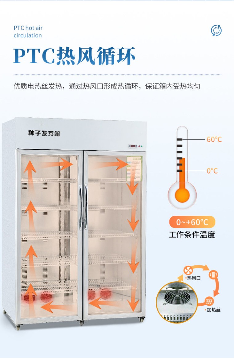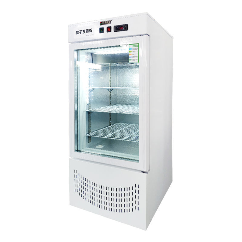 简介: 1、HM系列恒温培养箱是专为种子公司(商店)而设计的种子发芽检验设备。适用于植物发芽、育苗、微生物培养,也是生物、农林畜牧、科研单位、生产单位或部门实验室的重要试验设备。具有自动控制光照,自动加热恒温等两大功能。其结构简单,造型美观、工作可靠、价格低廉是一种理想的普及产品。 2、此箱可在不同地区不同季节使用不同的种子恒温快速发芽,由于恒温的作用,使种子的蛋白酶等化学物质迅速分解反应,避免了温差出芽造成的能量丢失,使种子出芽后抗病力强,提高幼苗免疫能力,缩短了种子的出芽的时间。经该器械出的幼芽,芽苗质量好,成活率高。 系统控制: 本产品采用的温控器。产品体积小、重量轻、外形美、可靠性好、抗震动和抗干扰性能强,配热电偶的仪表具有冷端自动补偿功能。可以实现温度测量和自动控制。 注意事项: 1、放在干爽通风处。 2、四周无杂物及化学品堆放。 3、插座容量大于10安培,并应有可靠接地线。 4、如箱内有积水情况,必须先切断电源,然后用毛巾擦干。 主要技术参数: 1、单门左开型 2、额定容积100L 3、控温范围:5~50℃,加热制冷双向温控 4、温度显示方式:数显 5、内尺寸:393*410*630mm (长×宽×高) 6、外形尺寸:475*500*1160mm(长×宽×高) 7、工作环境:温度-10℃~35℃。湿度90%RH以下,无腐蚀性气体场合 8、工作电源:交流220V士10%,50Hz;消耗功率:小于4VA; 9、加热功率:280w,制冷功率:130w