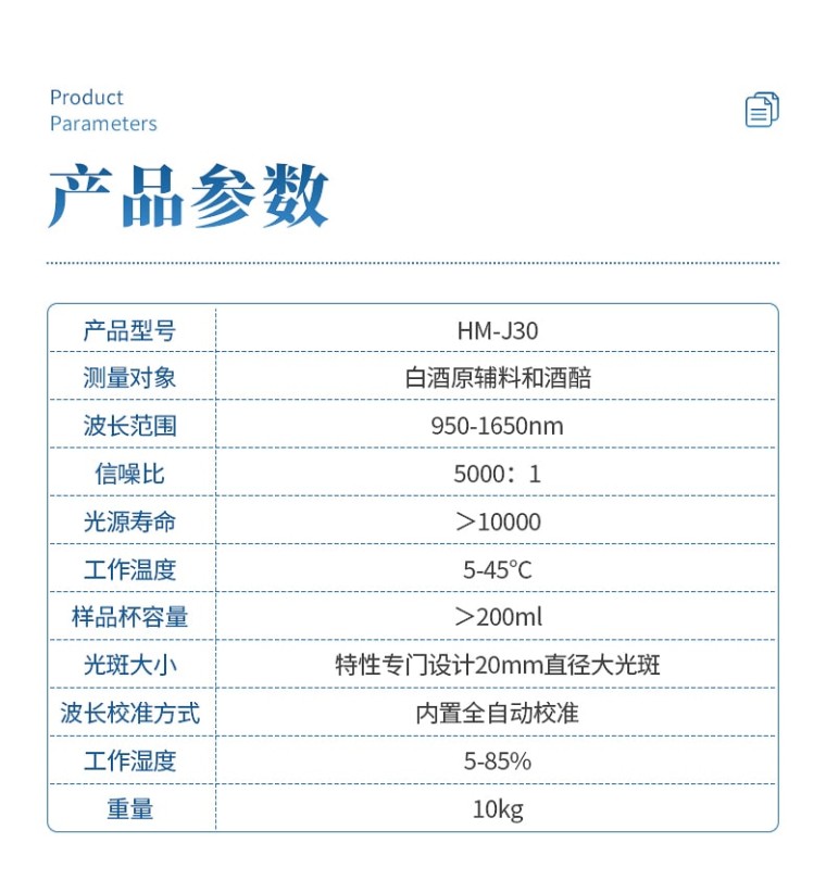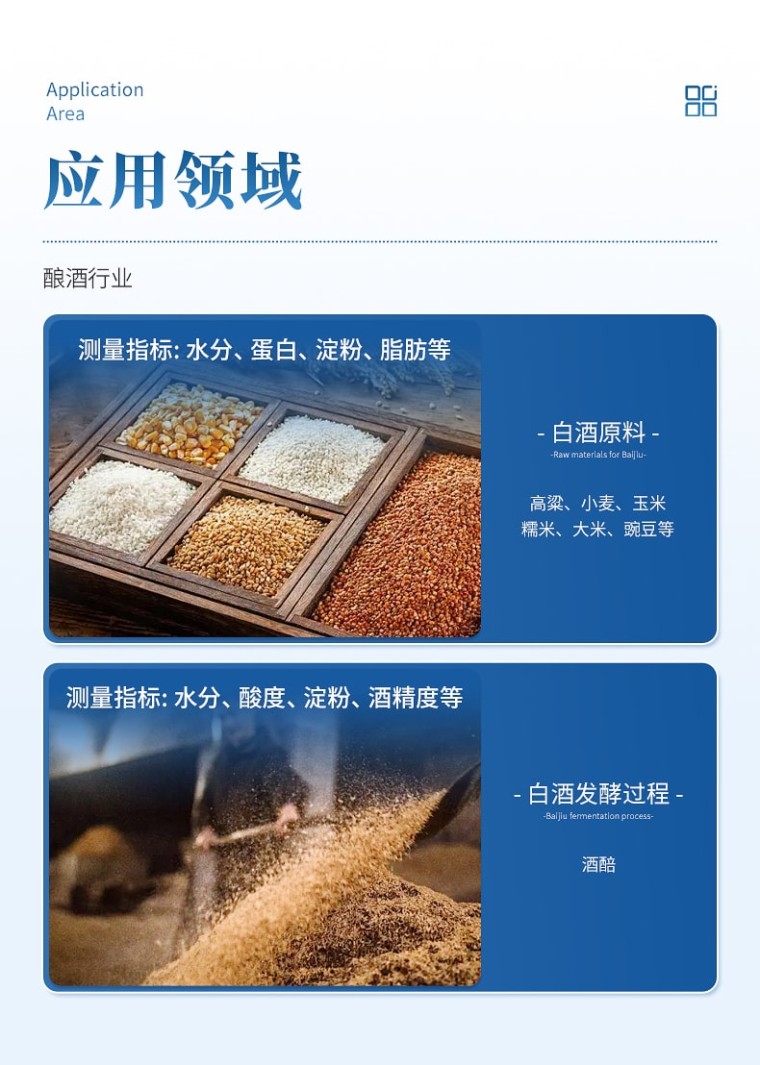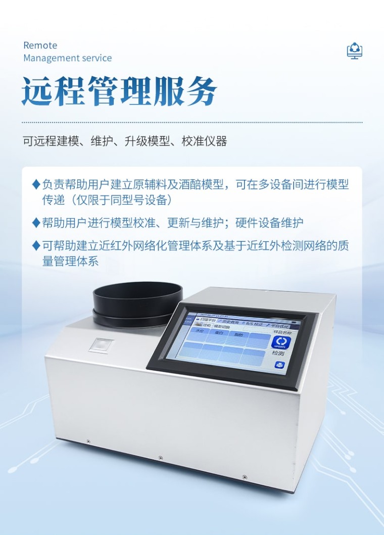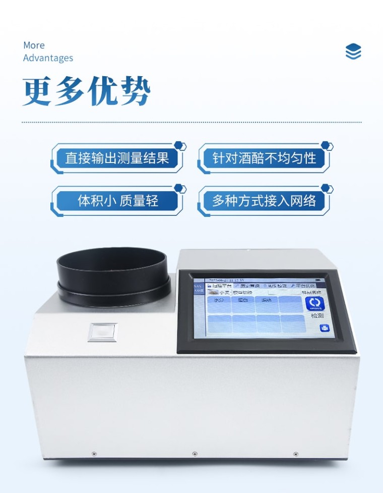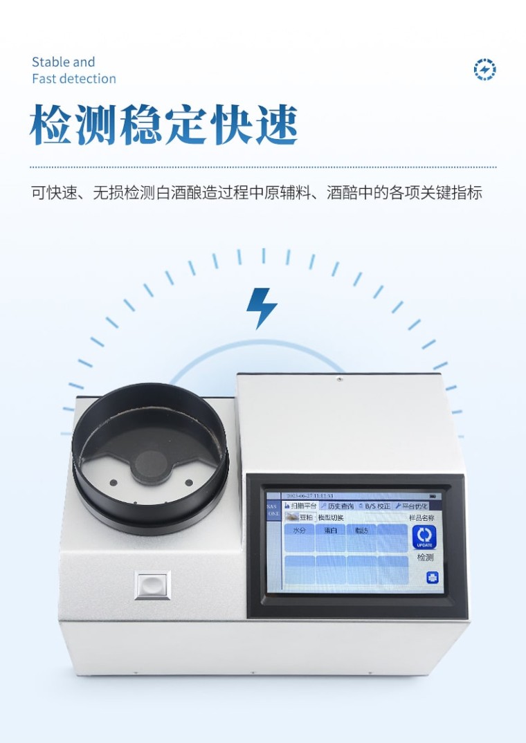 便携式酒醅检测仪可快速、无损检测白酒酿造过程中原辅料、酒醅中的各项关键指标。支持单机(无电脑)操作,内置电池适用于原位检测。可通过网口、WIFI 接入PC、网络进行远程管理, 软件、模型的校准、升级及维护更新。 特点: 1:自带液晶屏: 2:支持单机操作适用于非技术人员一键检测 3:直接输出测量结果 4:针对酒醅不均匀性 5:特性专门设计20mm直径大光斑 6:检测稳定快速 7:可远程建模、维护、升级模型、校准仪器 8:多种方式接入网络 9:便于质检部门及各级领导直接 10:获得生产一线状况 11:体积小 质量轻 12:内置电池 13:适用于车间现场检测使用 应用领域: 酿酒行业 白酒原料:高粱、小麦、玉米、糯米、大米、豌豆等,测量指标:水分、蛋白、淀粉、脂肪等 白酒发酵过程:酒醅,测量指标:水分、酸度、淀粉、酒精度等。 服务: 1、负责帮助用户建立原辅料及酒醅模型,可在多设备间进行模型传递(仅限于同型号设备) 2、帮助用户进行模型校准、更新与维护;硬件设备维护 3、可帮助建立近红外网络化管理体系及基于近红外检测网络的质量管理体系 技术参数: 1、测量对象:白酒原辅料和酒醅 2、波长范围:950-1650nm 3、信噪比: 5000:1 4、光源寿命:>10000 5、工作温度:5-45℃ 6、样品杯容量: >200ml 7、光斑大小:20mm 8、波长校准方式:内置全自动校准 9、工作湿度:5-85% 10、重量:10kg