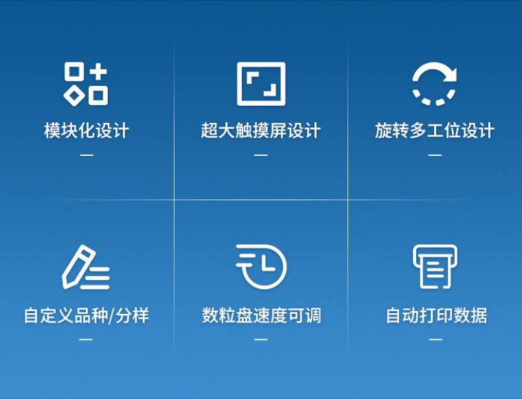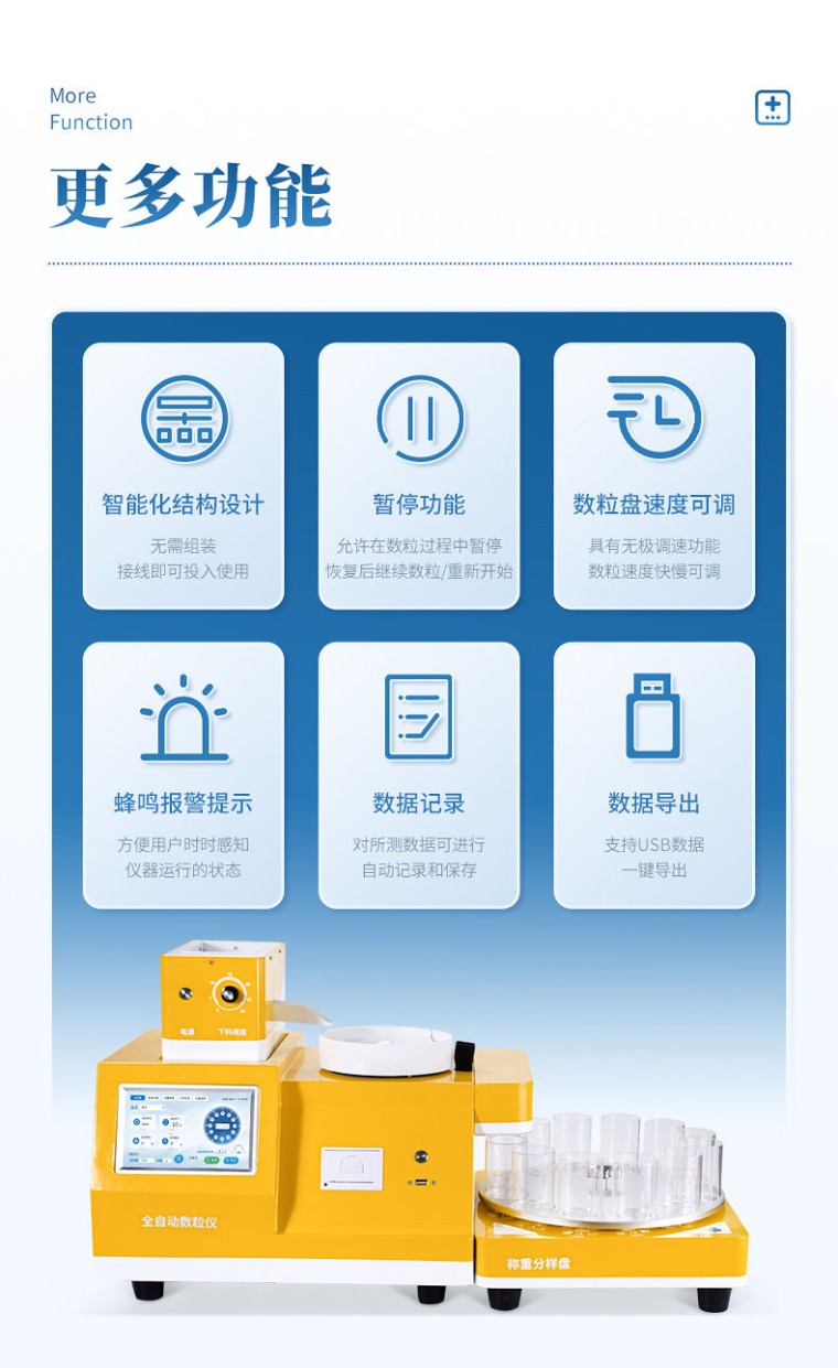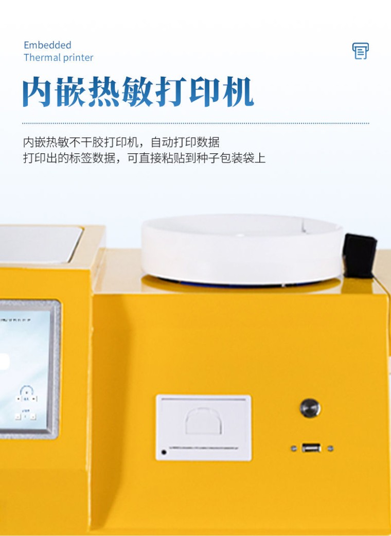 全自动数粒仪适用于玉米、水稻、小麦、黄豆、芝麻、蔬菜等各种农作物种子、瓜菜种子的计数,还可以用于微小工件、珍珠、药粒等物品的快速准确计数。除具备传统数粒仪的数粒功能外还具备自动旋转分样(12个转杯)、自动打印记录功能。 一、功能特点 1、外观设计:简洁大方,机构内部空间排布合理,能够将识读和操作部分以更合理的角度位置呈现给用户,人机交互合理。 2、模块化设计:根据用户的不同需求不同进行模块功能调整,实现精准的功能输出。 3、智能化程序设定:分样型自动数粒仪以数粒为核心,功能覆盖全面,程序设定后,从料仓到转盘全自动大批量分样数粒,减少人工时间。 4、无需组装:智能化结构设计,无需组装,接线即可投入使用 5、超大触摸屏设计:7寸彩色触摸屏(可定制10.1寸触摸屏),增强用户人机交互体验。 6、自定义品种:可以在设置页面自定义需要数粒的品种名称,振动速度、减速速度、灵敏度等。 7、自动平均分样、自定义分样:可设置料杯数量和籽粒数量,对每个料杯进行平均分样、自定义分样。 8、预值设置、满值自停:当数粒达到所设杯数和粒数时,转盘会自动停止工作。 9、旋转多工位设计:当前料杯计数完成后,会自动跳转到下一料杯,可在装袋放置过程中不间断落料,提升工作效率。 10、暂停功能:允许在数粒过程中暂停,并在恢复后继续数粒或重新开始。 11、内置减速程序:在每个料杯接近设定籽粒数量后会自动进行减速精数,防止物料惯性过冲影响精度。 12、数粒盘速度可调:分样型自动数粒仪具有无极调速功能,数粒速度快慢可调。 13、蜂鸣报警提示:每杯数粒完成滴一声,全部数粒完成长鸣一声,故障时滴滴6声。方便用户时时感知仪器运行的状态。 14、灵敏度可调:可以调节灵敏度,适应各种大小形状的种子,提高精确度。 15、数粒时间:记录并保存每一杯数粒达到预设值所用时间; 16、状态显示:显示仪器当前工作状态:未启动、数粒中、暂停、数粒完成等。 17、数据记录:对所测数据可进行自动记录和保存,包含品种名称、测量粒数及计数时间和测试时间等。 18、数据打印:内嵌热敏不干胶打印机,自动打印数据。打印出的标签数据,可直接粘贴到种子包装袋上。 19、历史数据查看:可以在本地查看历史记录,支持翻页,页面跳转功能。 20、数据删除:支持历史数据一键删除功能。 21、数据导出:支持USB数据一键导出。 22、内置中英文双语显示,一键切换,无缝对接。 二、技术参数 种子长度:0.5-23mm 计数速度:最大速度1000~2000粒/分钟(计数速度取决于种子颗粒的几何形状和尺寸) 计数容量:1~9999粒 预置自停:1~9999当中任意数值,置0000不计数 运行模式:高速计数完成前自动转为慢速,计数完成后停止 计数误差:±2‰ 数粒盘速度:0-99; 灵敏度:0-10; 料杯数量:12杯 杯子尺寸:ø60×80mm(H) 仪器尺寸和重量: 主 机580(W)×390(D)×336(H),24kg 接料机360(W)×390(D)×197(H),12kg 连续工作时间:≥8小时 震动噪音:≤80dB 工作环境:环境温度:-10℃~50℃;相对湿度:<85% 电 源:AC/220V 50Hz 出口规格:AC100V、110V、200V、240V,50/60Hz 配置清单:数粒仪、旋转分样接料机、料杯12个、电源线、落料口2个(一大一小)、标签打印纸6卷、说明书、合格证
