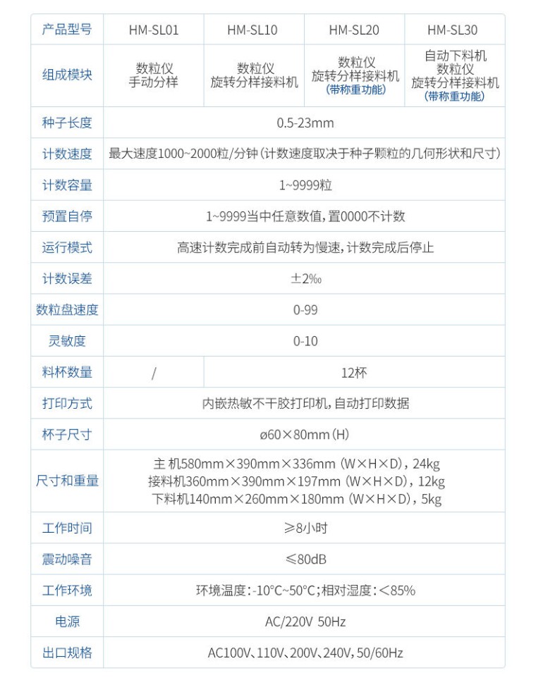 全自动旋转分样数粒仪适用于玉米、水稻、小麦、黄豆、芝麻、蔬菜等各种农作物种子、瓜菜种子的计数,还可以用于微小工件、珍珠、药粒等物品的快速准确计数。除具备传统数粒仪的数粒功能外还具备自动旋转分样(12个转杯)、自动称重、自动打印记录功能。 一、功能特点 1、外观设计:简洁大方,机构内部空间排布合理,能够将识读和操作部分以更合理的角度位置呈现给用户,人机交互合理。 2、模块化设计:根据用户的不同需求不同进行模块功能调整,实现精准的功能输出。 3、智能化程序设定:分样型自动数粒仪以数粒为核心,功能覆盖全面,程序设定后,从料仓到转盘全自动大批量分样数粒,减少人工时间。 4、无需组装:智能化结构设计,无需组装,接线即可投入使用 5、超大触摸屏设计:7寸彩色触摸屏(可定制10.1寸触摸屏),增强用户人机交互体验。 6、自定义品种:可以在设置页面自定义需要数粒的品种名称,振动速度、减速速度、灵敏度等。 7、自动平均分样、自定义分样:可设置料杯数量和籽粒数量,对每个料杯进行平均分样、自定义分样。 8、预值设置、满值自停:当数粒达到所设杯数和粒数时,转盘会自动停止工作。 9、旋转多工位设计:当前料杯计数完成后,会自动跳转到下一料杯,可在装袋放置过程中不间断落料,提升工作效率。 10、暂停功能:允许在数粒过程中暂停,并在恢复后继续数粒或重新开始。 11、内置减速程序:在每个料杯接近设定籽粒数量后会自动进行减速精数,防止物料惯性过冲影响精度。 12、数粒盘速度可调:分样型自动数粒仪具有无极调速功能,数粒速度快慢可调。 13、蜂鸣报警提示:每杯数粒完成滴一声,全部数粒完成长鸣一声,故障时滴滴6声。方便用户时时感知仪器运行的状态。 14、灵敏度可调:可以调节灵敏度,适应各种大小形状的种子,提高精确度。 15、自动称重:当前料杯计数完成后自动称重并自动计算千粒重,无需外接电子天平 16、数粒时间:记录并保存每一杯数粒达到预设值所用时间; 17、状态显示:显示仪器当前工作状态:未启动、数粒中、暂停、数粒完成等。 18、数据记录:对所测数据可进行自动记录和保存,包含品种名称、测量粒数及重量、千粒重、计数时间和测试时间等。 19、数据打印:内嵌热敏不干胶打印机,自动打印数据。打印出的标签数据,可直接粘贴到种子包装袋上。 20、历史数据查看:可以在本地查看历史记录,支持翻页,页面跳转功能。 21、数据删除:支持历史数据一键删除功能。 22、数据导出:支持USB数据一键导出。 23、内置中英文双语显示,一键切换,无缝对接。 二、技术参数 种子长度:0.5-23mm 计数速度:最大速度1000~2000粒/分钟(计数速度取决于种子颗粒的几何形状和尺寸) 计数容量:1~9999粒 预置自停:1~9999当中任意数值,置0000不计数 运行模式:高速计数完成前自动转为慢速,计数完成后停止 计数误差:±2‰ 数粒盘速度:0-99; 灵敏度:0-10; 料杯数量:12杯 杯子尺寸:ø60×80mm(H) 仪器尺寸和重量: 主 机580(W)×390(D)×336(H),24kg 接料机360(W)×390(D)×197(H),12kg 连续工作时间:≥8小时 震动噪音:≤80dB 工作环境:环境温度:-10℃~50℃;相对湿度:<85% 电 源:AC/220V 50Hz 出口规格:AC100V、110V、200V、240V,50/60Hz 配置清单:数粒仪、旋转分样接料机(带称重功能)、料杯12个、电源线、落料口2个(一大一小)、标签打印纸6卷、说明书、合格证