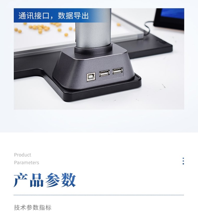 一、概述 智能考种系统由1600万高拍仪和背光装置组成。背光装置采用的是高亮LED灯,外边框使用铝合金材质制成。软件采用先进的图像处理技术,根据距离变换原理、形态学、凸包检测等技术综合设计的一款嵌入式软件。该设备主要应用在农业领域的田间作物测产及考种等方面,通过高拍仪拍摄的照片,软件自动计算种子数量,种子的面积、周长、长度、宽度、长宽比等数据,根据天平所得的重量与种子的数量自动计算出千粒重;以列表和图形的方式输出结果,便于用户查看与分析研究。本产品也可以手动对作物种子数量修正以确保计数精度、对数据进行保存,并且可以查看数据报表,最后可以将数据以Excel格式导出。 二、用途 智能考种系统可以测量各种表面光滑的籽粒的数量、千/百粒重与平均粒型(包括长、宽、长宽比、周长、面积),利用图像ORC 识别技术、图像定位、空间转换等技术实现快速识别种子数量及作物性状指标。 三、功能特点 1、具有操作简洁化,应用人性化、智能化和可升级化等优点。 2、成像特性:配自动对焦的1600万像素分辨率彩色高拍仪,及超薄的背光光源板,具有相机画面畸变、背光板均匀性的自动矫正特性,有效减小尺寸测量误差。拍照分析的种粒直径0.5~20mm。稻种的实粒与秕谷需经风选,再分别计数分析才能得出水稻的结实率。 3、数粒精度与目标大小:1~2000粒/次,数粒误差≤±0.1%-0.4%,极少监视修正即可保证结果准确性。千粒重分析的精度误差:≤±0.5%; 4、能自动测出各类粘连种粒的每粒粒形参数(长、宽、长宽比、面积、周长)。各类种粒的各尺寸测量误差≤±0.1mm。 5、有被测样本记录,样本重量输入自动计算千粒重。分析过程为电脑自动控制,高效、准确、简便易用,一键化操作的计数分析与千粒重测量。 6、分析数据导出:分析图像结果可保存,自动形成总报表,统计分析结果能输出至Excel表。 7、背光装置:采用的是高亮LED灯在电源驱动下,在纳米导光板及反光材料的作用下,使得背光清晰,种子在上面无阴影,铝合金外边框,外形美观结实不易变形。 四、配置清单 1.1600万高拍仪一套(带背光灯板) 2、量程300g电子天平(精度1mg)一台 3、加密狗、U盘、合格证、说明书一套 4、铝合金手提箱一个