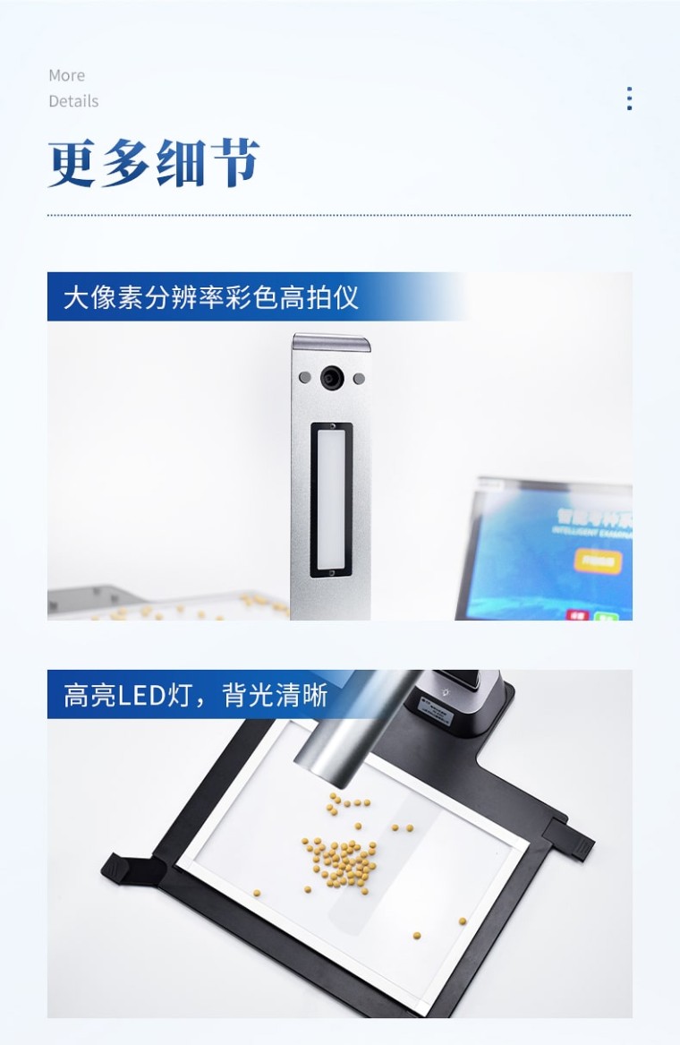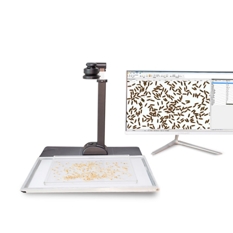 一、用途 用于各类农作物实粒种子(谷粒、玉米、小麦、油菜籽等)的精确考种,各类粮库的虫口计数分析。可兼做表面光滑的昆虫计数或虫卵计数(如:米象、蚜虫、蚕卵、鱼籽等),以及被当作种子净度工作台用于种子净度检验。 二、主要技术指标 1、大景深的1200万像素彩色拍摄仪及A3幅面超薄背光灯板,具有相机画面畸变、背光板均匀性的自动矫正特性,有效减小尺寸测量误差。 2、★能大批量自动分析成像后的种粒图片。拍照分析的种粒直径0.5~20mm。稻种的实粒与秕谷需经风选,再分别计数分析。 3、★全自动数粒速度1200~20000粒/分钟,数粒误差≤±0.1~0.4%,极少监视修正即达100%正确。全自动千粒重分析的精度误差≤±0.5%。对于直径较小的种粒(如油菜籽、蔬菜籽),单批次考种数量在5000~10000粒。 4、★可根据实际需求自行创制一键自动分析向导,适用于水稻、小麦、玉米、豆类、油菜籽、瓜子、蔬菜籽等各类农作物的自动精确考种、各类粮库的虫口自动计数,以及出苗数、均匀度分析,显示和输出计数结果。 5、★能自动测出各类粘连种粒的每粒粒形参数(长、宽、长宽比、面积、等效直径、周长等),能精准显示种粒外接矩形,并可自动排序输出,及可输出粒径分布图表。 6、★具有对被分析目标颜色、形状进行自学习和再学习,并实现自动分类的特性,以及品种比对特性。 7、分析过程为全程电脑控制,高效、准确、简便易用,真正一键式操作,鼠标一点,结果即现。具有被测样本条码、电子天平RS232重量数据的自动输入接口。 8、可用鼠标选择增加/删除,或直接用鼠标在屏上手工计数,以确保100%正确目标区的个性化计数,也可对工作区视野中任选范围或矩形范围内的计数。 9、分析图像结果可保存,能自动形成总报表,统计分析结果可输出保存至Excel表,以及按宽度、长度、面积等输出的排列图和测量图。 三、标准配置 1、自动考种分析及千粒重仪系统软件U盘及软件锁1套 2、笔记本电脑1台 3、大景深的1200万像素彩色拍摄仪1台 4、A3幅面超薄背光灯板1套 5、带RS232通讯接口的量程220g电子天平(精度1mg)1台 6、RS232接口通讯传输线1条 7、种粒成像盘1个 8、种粒收纳小盘1个
