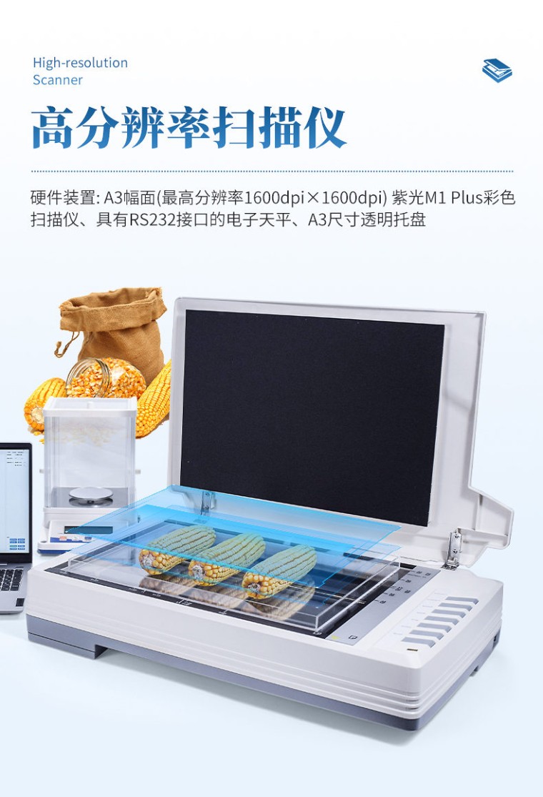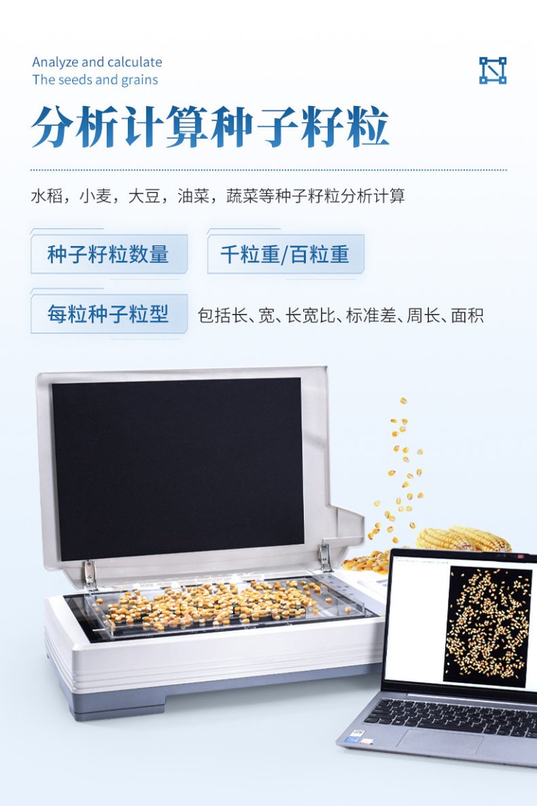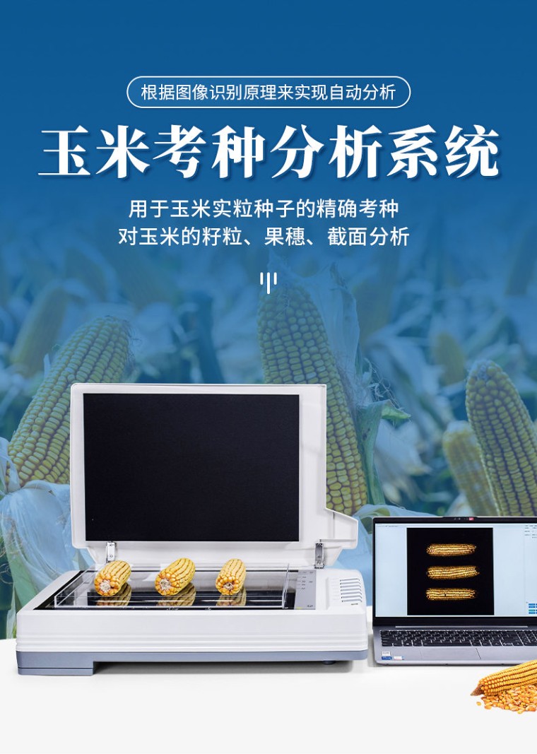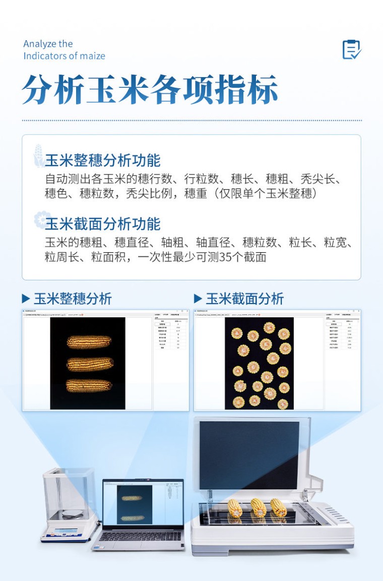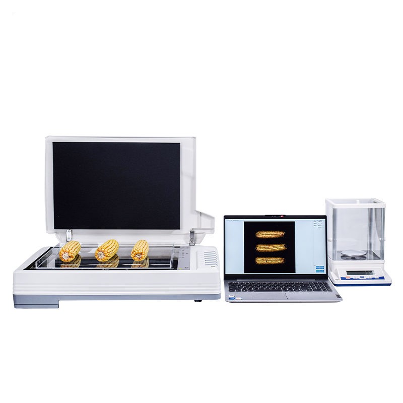 仪器用途 自动玉米考种分析及千粒重系统是根据图像识别原理来实现自动分析的。可用于玉米实粒种子的精确考种、对玉米的籽粒、果穗、截面分析。同时可兼做水稻、小麦、油菜、豆类、花生、芝麻等作物考种分析。 仪器功能 1、适用于玉米,水稻,小麦,大豆、油菜,蔬菜等同粒型种子的粒型指标分析。 2、玉米整穗分析功能:自动测出各玉米的穗行数、行粒数、穗长、穗粗、秃尖长、穗色、穗粒数,秃尖比例,穗重(仅限单个玉米整穗)。 3、玉米截面分析功能:玉米的穗粗、穗直径、轴粗、轴直径、穗粒数、粒长、粒宽、粒周长、粒面积,一次性最少可测35个截面。 4、水稻,小麦,大豆,油菜,蔬菜等种子籽粒分析计算:数量、千粒重/百粒重、每粒种子粒型(包括长、宽、长宽比、标准差、周长、面积) 5、可分析各类种子总结果:所有种子平均值(长、宽、长宽比、周长、面积) 6、硬件装置: A3幅面(最高分辨率1600dpi X 1600dpi) 紫光M1 Plus彩色扫描仪、具有RS232接口的电子天平、A3尺寸透明托盘。 7、分析速度:可同时成像分析10个玉米果穗、35 个玉米截面、1000粒左右玉米籽粒。 8、图像:支持JPG/TIF/BMP/PNG等格式图片,可以对图片任意放大、缩小,方便查看标记结果,可以手动将分析后的图片选择路径保存。 9、数据:每次分析操作后自动导出Excel表格,可设置Excel的导出路径及具有追加保存的功能。 10、重量:具有自动输出重量功能的天平,输入后自动换算成千/百粒重。 11、颜色:采用公认的具体的RGB数值来表示种子的颜色。 12、胚尖数:能自动识别玉米籽粒带有胚尖的数量 13、筛选:能根据籽粒、截面或者果穗的筛选数据执行对应的分析操作。 14、上传云端:绑定设备编号后可以将分析后的数据保存至云端,并支持随时查看云端数据。 15、数粒速度: 1500~4000粒/分钟; 精确度:数粒误差≤士0.5%,监视修正即达100%正确。粒型误差≤士0.3%。自动千粒重分析的精度误差:≤土0.5%。 16、内置中英文双语显示,一键切换,无缝对接 17、软件只适配Windows 10及Windows 10以上系统。
